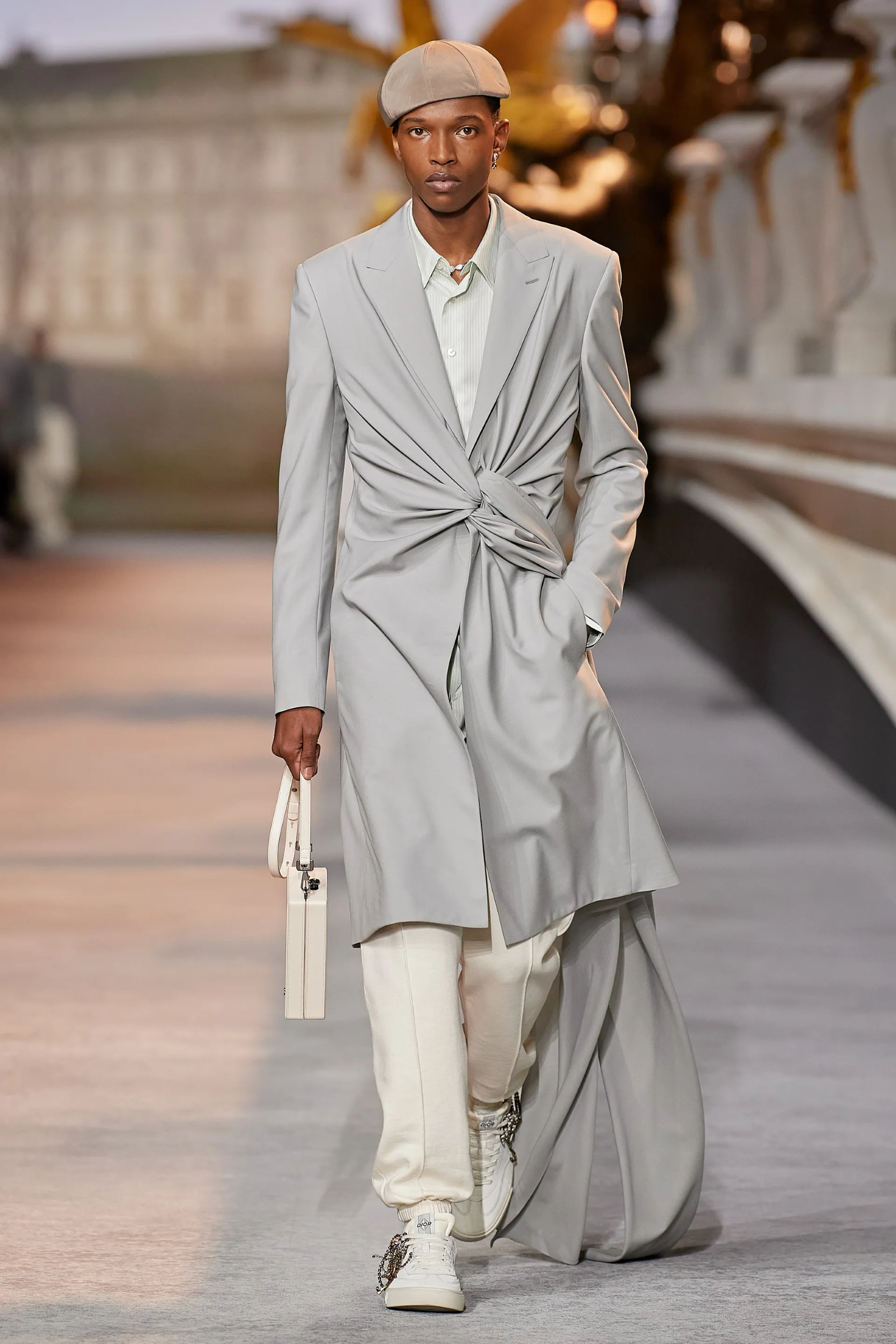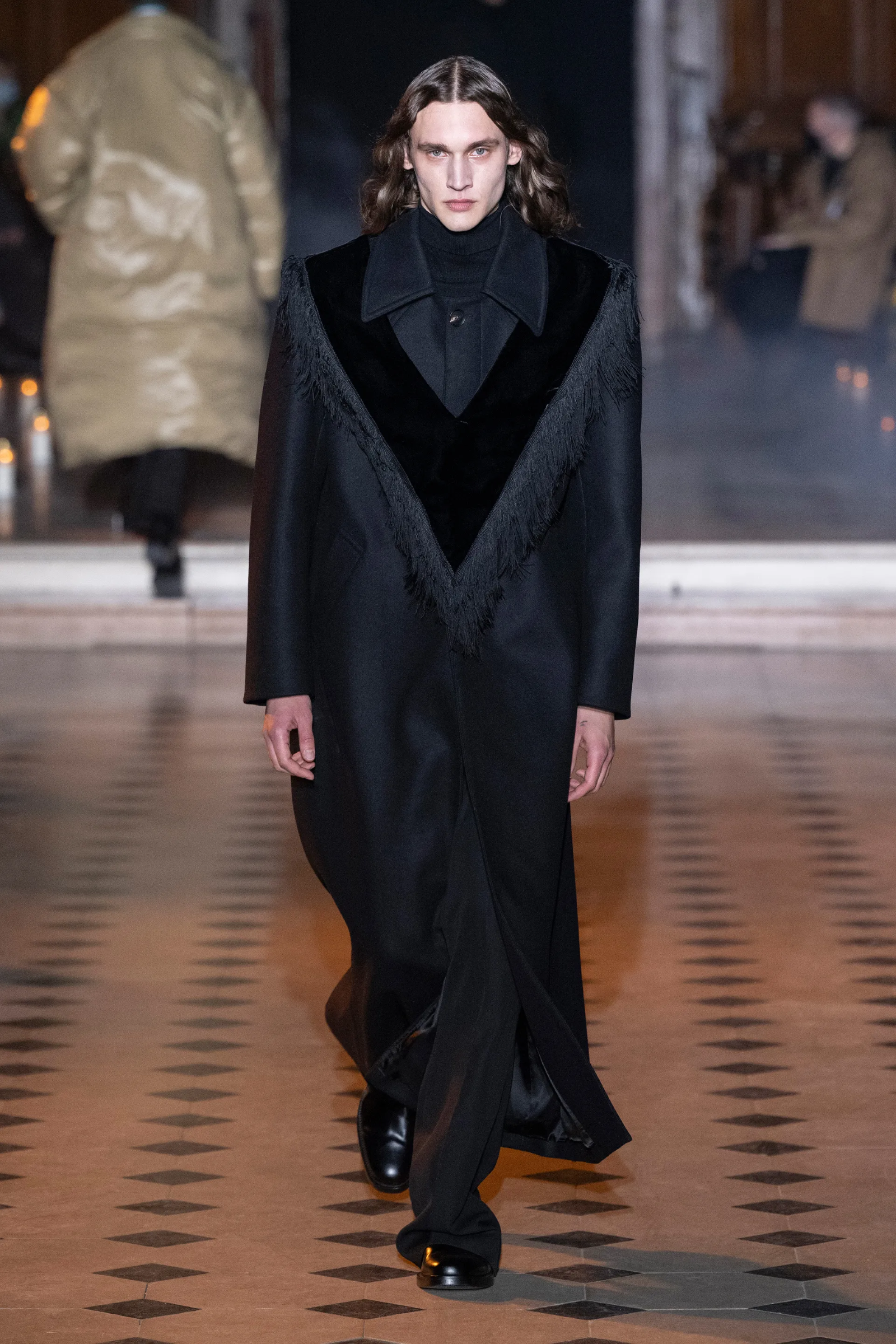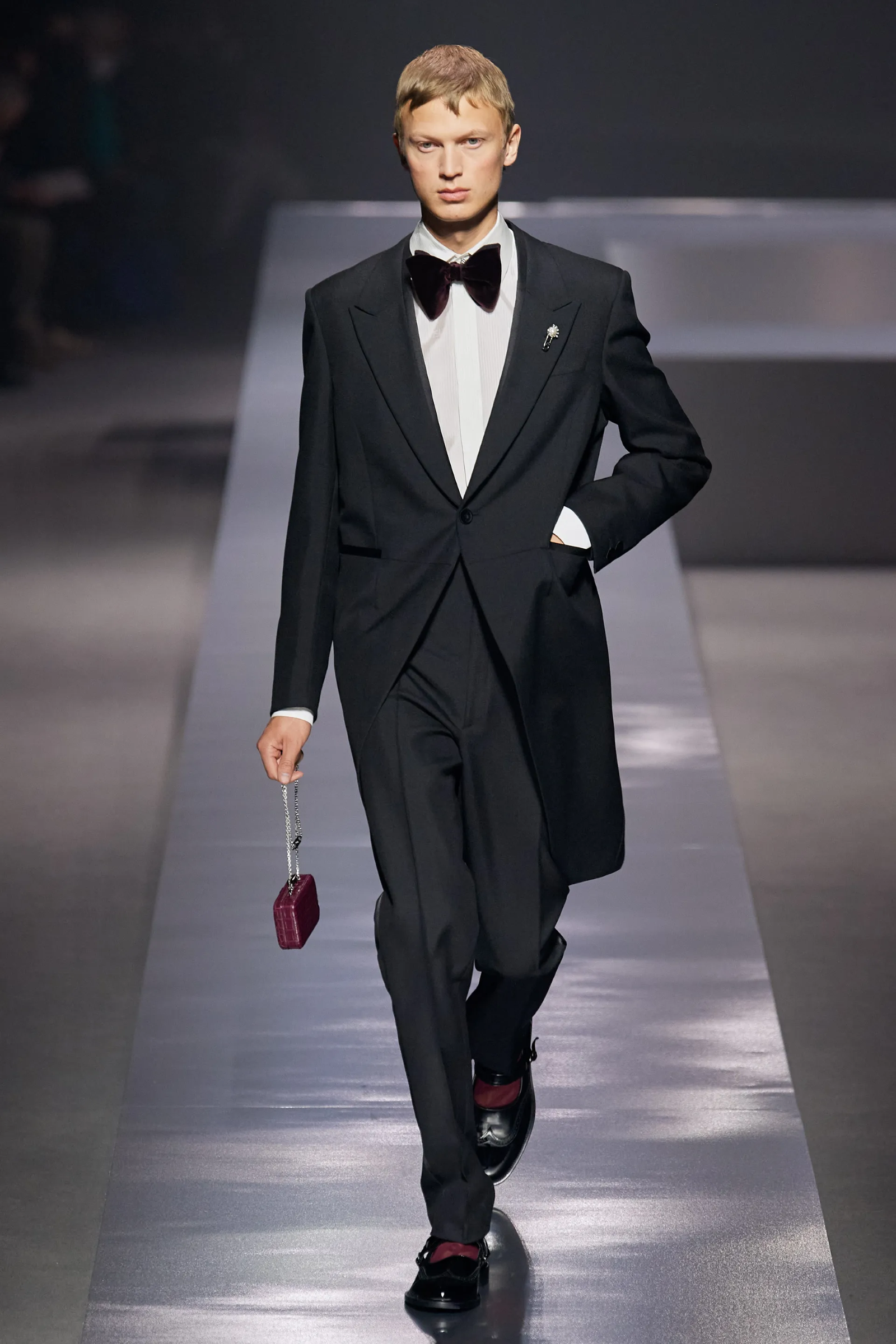 Lo stesso discorso può essere esteso a brand il cui DNA risulti compatibile con un’estetica disposta a fare i conti con le acrobazie stilistiche di questa figura. È ciò che ha fatto Yohji Yamamoto per la collezione FW22, flirtando con la letteratura e gli abiti del XIX secolo in un gioco dove le manie del dandy - chiome scapigliate incluse - diventano i corollari di un manifesto di resistenza al tempo che intercetta le categorie del romanticismo, del punk e del surrealismo. Progetto solo in parte condiviso da Kim Jones da Dior Homme che, nella collezione FW22, prova a immaginare un soft dandy ispirato ai codici della storica maison francese. La rivisitazione della giacca Bar, la ricorrenza del motivo floreale e un approccio decorativo ravvisabile anche nei guanti gioiello delineano un linguaggio che ammicca in maniera più o meno esplicita ai rituali vestimentari del dandy, resi più fluidi e meno altisonanti da un’interpretazione modellata sulle moderne varianti genderless. Questione che tocca da vicino anche l’operato di Silvia Venturini da Fendi, artefice di un guardaroba maschile (ri)pensato per le occasioni in cui classico non fa rima con nostalgico: l’intera collezione FW22 aspira ad un’idea di distinta eleganza che, da sensuali tagli cut-out abbinati a Mary Jane con cinturini e chocker di perle culmina in outfit declinati secondo la più fine intelligenza sartoriale del dandy.