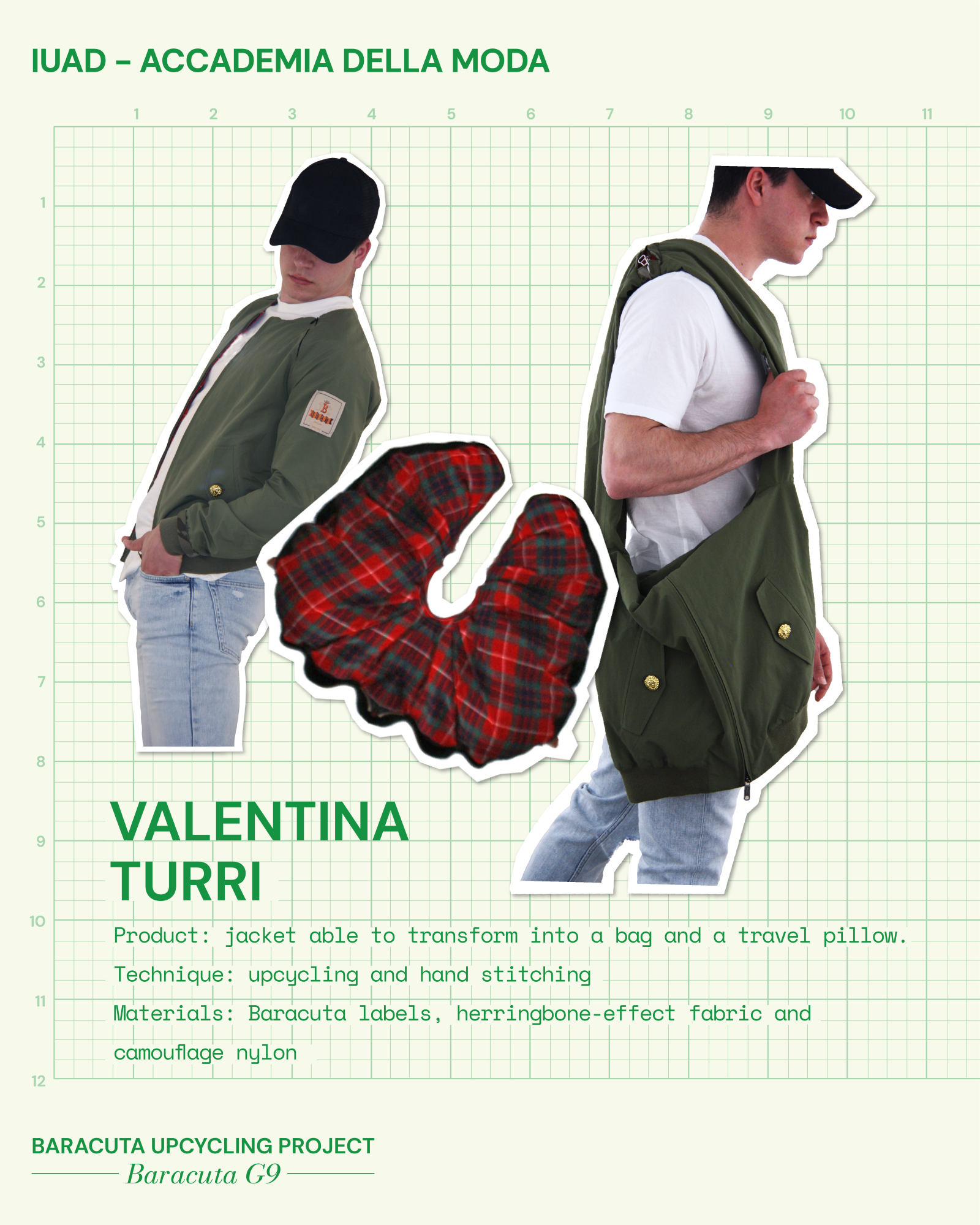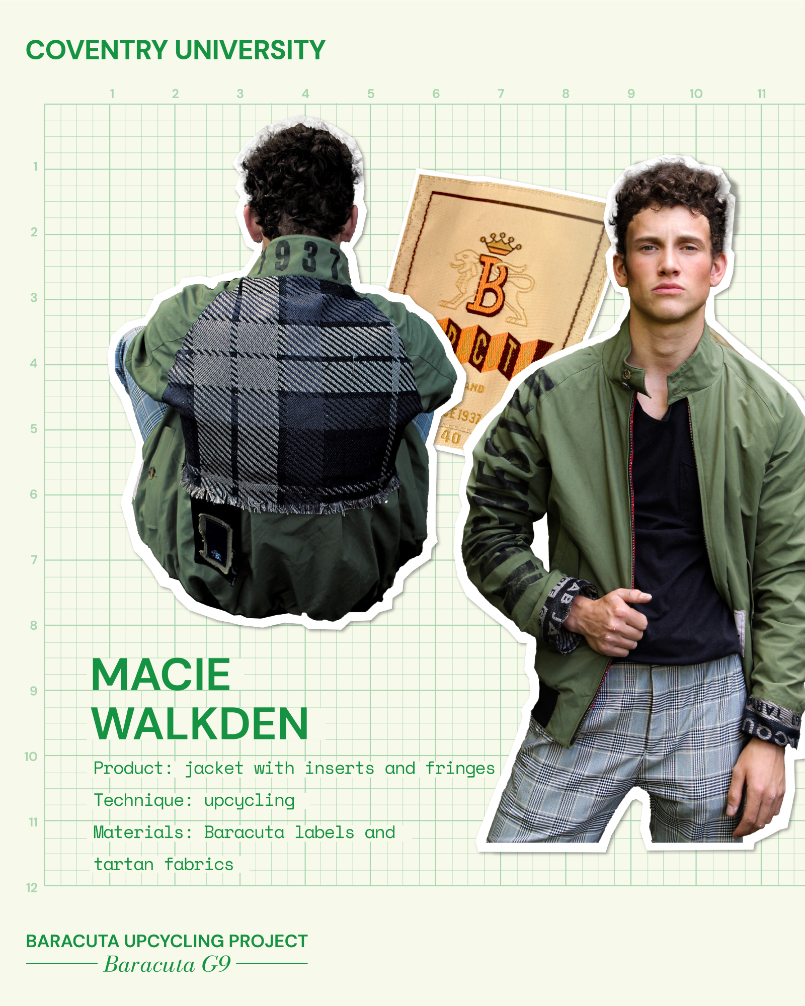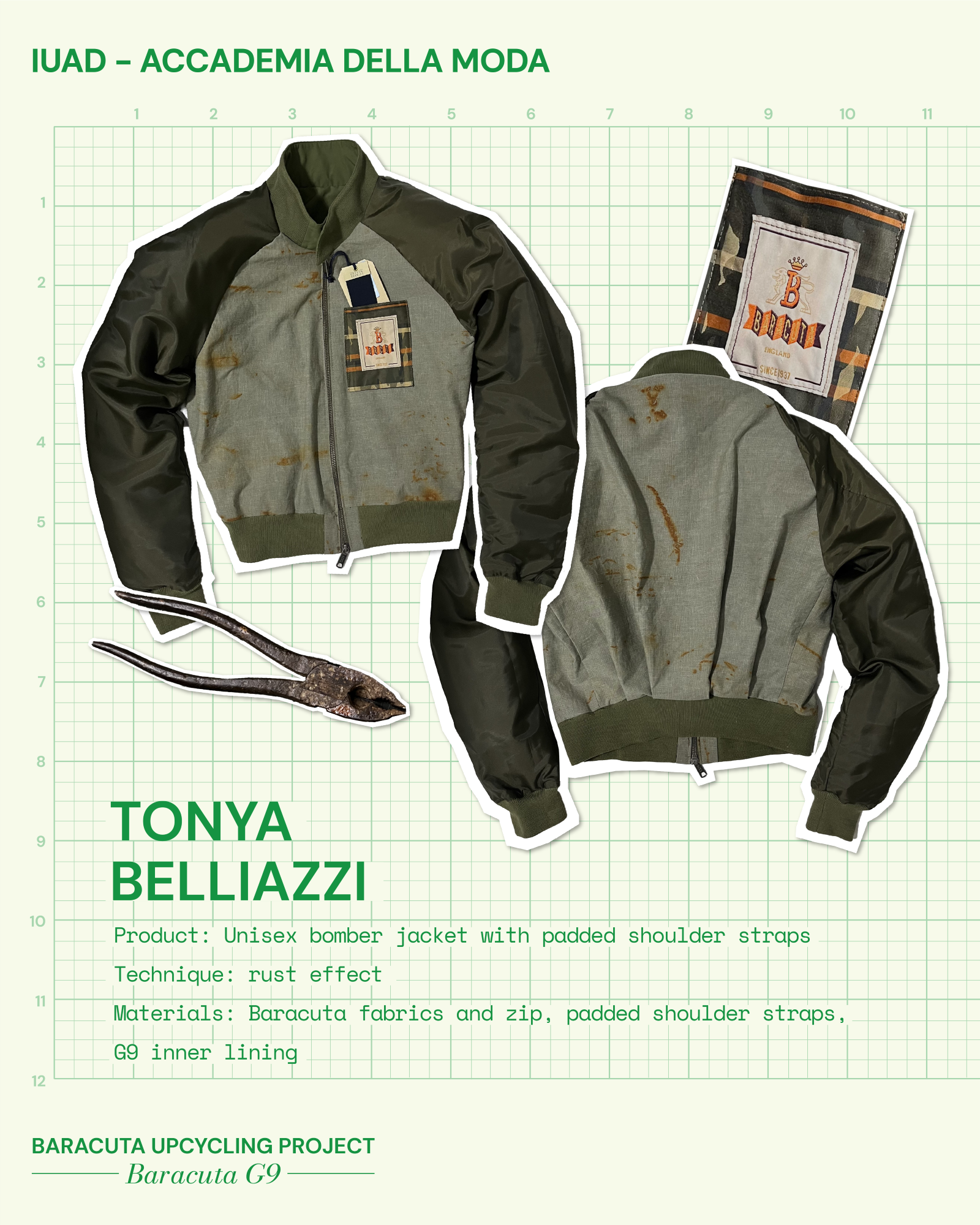 Per gli studenti di IUAD Napoli, Ludovica Palma, Valentina Turri e Raffaele Castiello, lo spirito del progetto è stata l’innovazione simboleggiata dalle pratiche di upcycling. Ludovica, che ha trasformato il G9 d’archivio in una borsa ispirata alla logomania e ai «capi tempestati di monogrammi dei brand più ambiti» è affascinata dalla maniera in cui l’upcycling può far evolvere l’identità del brand: «Mantenendo l’essenza di un brand gli si può attribuire un significato differente per rafforzarne l’identità». Valentina Turri invece ha prodotto una giacca ibrida che si può trasformare in borsa tramite un ingegnoso sistema di cerniere. Per lei l’upclycing è una maniera di far proseguire la storia della creazione di un capo «che si estranei dal concetto di stagionalità della moda, ma che segue regole proprie e che si adatti nel tempo, creando un ciclo ripetibile all'infinito». Raffaele Castiello, invece, che per la sua reinvenzione del capo si è ispirato al mondo goth/punk, sfruttando i significati del motivo tartan. Per lui l’upcycling è un «recupero migliorativo» che «non riduce il valore del vecchio, dello scarto ma riesce a dare una nuova vita al prodotto ricorrendo ad un design intelligente». Per il suo progetto, invece, Tonya Belliazzi si è ispirata alla «copertina di una rivista del 1963 dove Steve McQueen in sella alla sua moto indossa l’Harrington di Baracuta» ricreando l'effetto della ruggine sul tessuto e strutturando il G9 come una motor jacket. La logica dietro il progetto è quella dell'upcycling che «si adatta al desiderio di un futuro che sappia utilizzare nel modo migliore l’eredità della nostra storia» e diventa strumento per coltivare la consapevolezza del passare del tempo.