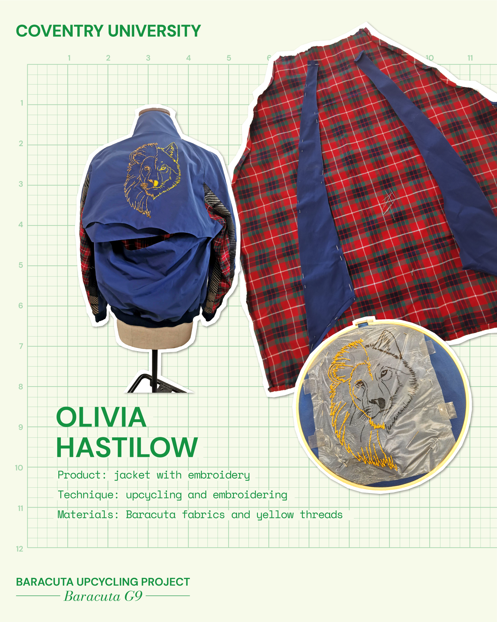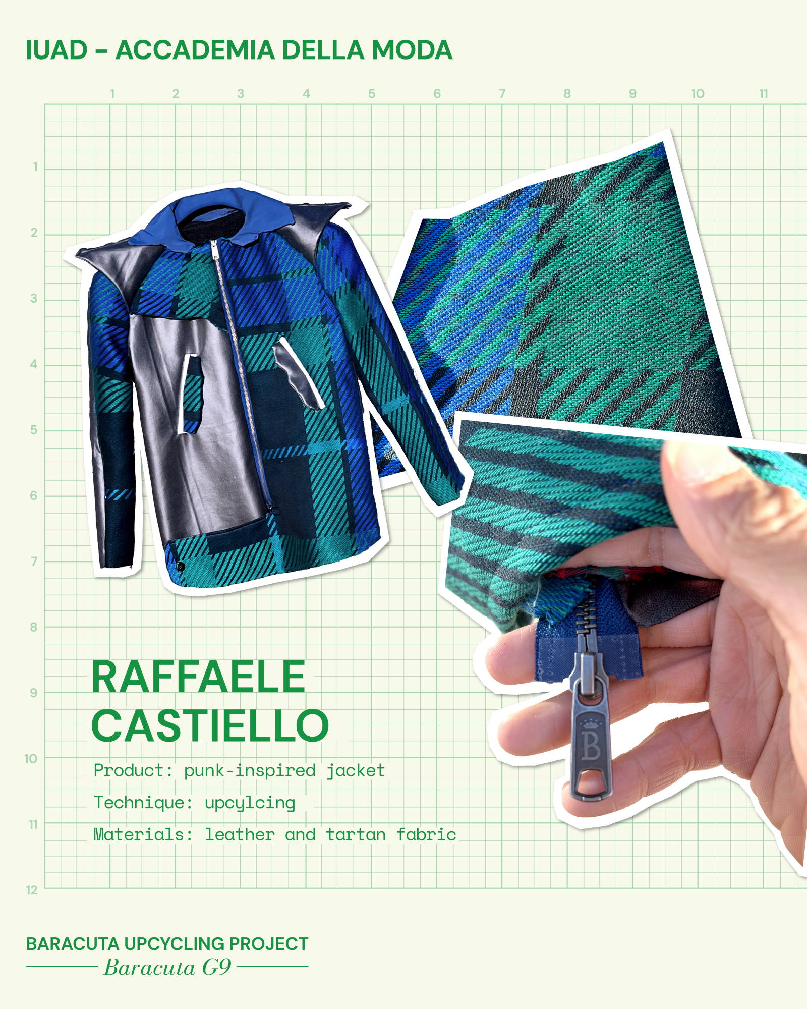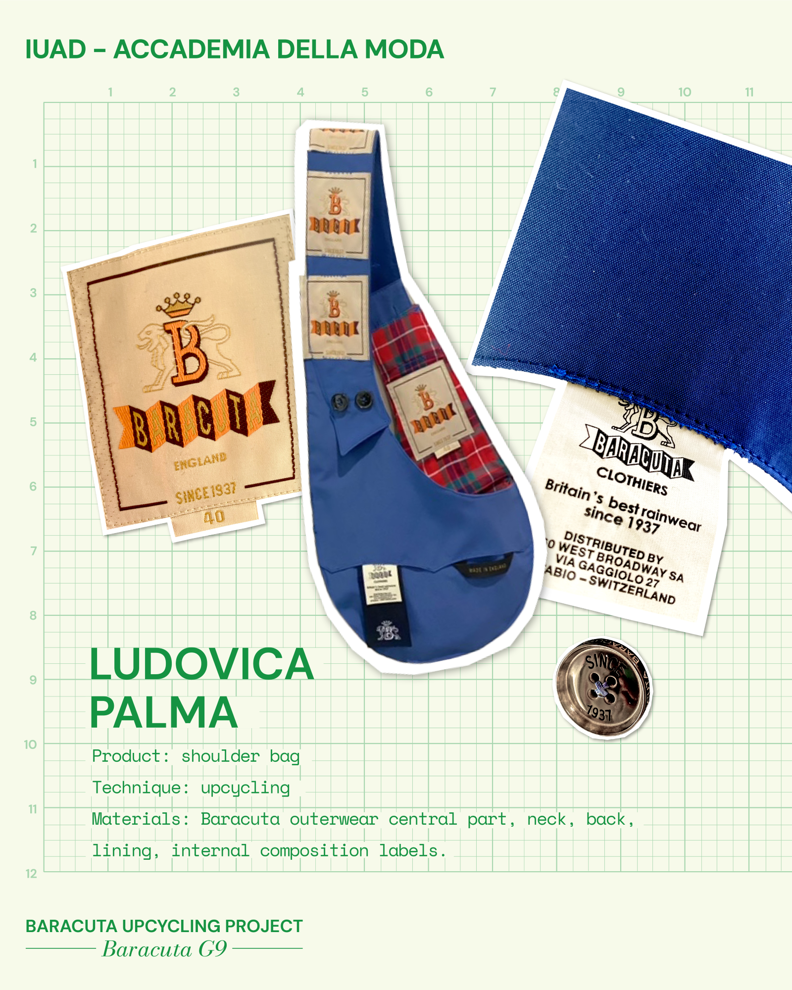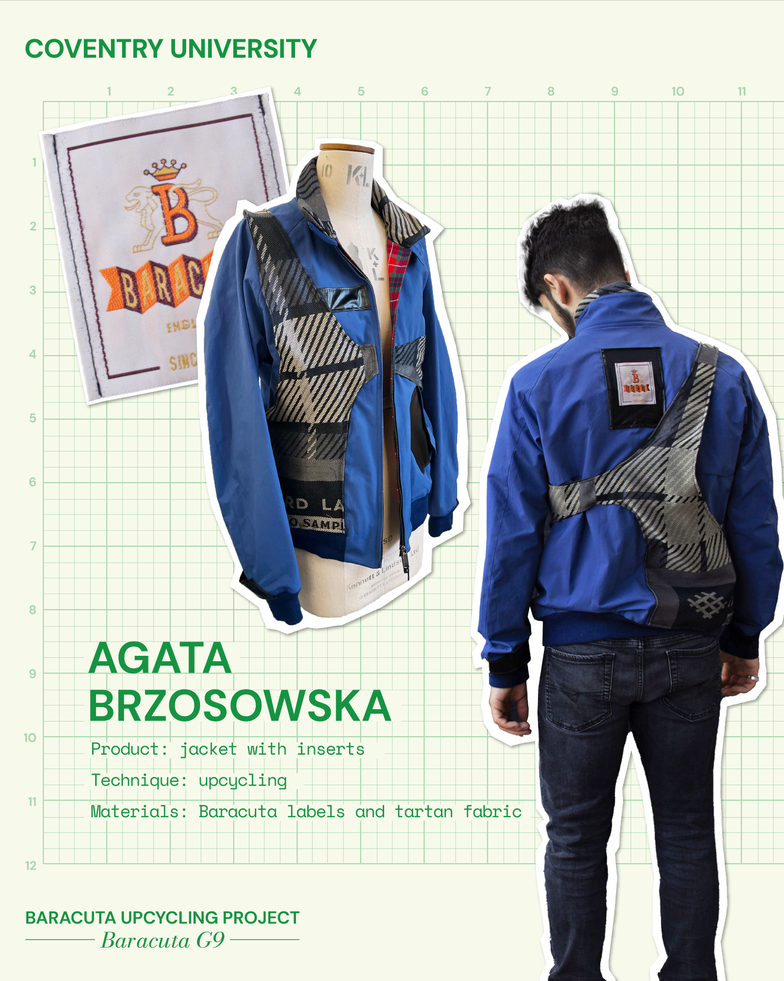 Per gli studenti di IUAD Napoli, Ludovica Palma, Valentina Turri e Raffaele Castiello, lo spirito del progetto è stata l’innovazione simboleggiata dalle pratiche di upcycling. Ludovica, che ha trasformato il G9 d’archivio in una borsa ispirata alla logomania e ai «capi tempestati di monogrammi dei brand più ambiti» è affascinata dalla maniera in cui l’upcycling può far evolvere l’identità del brand: «Mantenendo l’essenza di un brand gli si può attribuire un significato differente per rafforzarne l’identità». Valentina Turri invece ha prodotto una giacca ibrida che si può trasformare in borsa tramite un ingegnoso sistema di cerniere. Per lei l’upclycing è una maniera di far proseguire la storia della creazione di un capo «che si estranei dal concetto di stagionalità della moda, ma che segue regole proprie e che si adatti nel tempo, creando un ciclo ripetibile all'infinito». Raffaele Castiello, invece, che per la sua reinvenzione del capo si è ispirato al mondo goth/punk, sfruttando i significati del motivo tartan. Per lui l’upcycling è un «recupero migliorativo» che «non riduce il valore del vecchio, dello scarto ma riesce a dare una nuova vita al prodotto ricorrendo ad un design intelligente». Per il suo progetto, invece, Tonya Belliazzi si è ispirata alla «copertina di una rivista del 1963 dove Steve McQueen in sella alla sua moto indossa l’Harrington di Baracuta» ricreando l'effetto della ruggine sul tessuto e strutturando il G9 come una motor jacket. La logica dietro il progetto è quella dell'upcycling che «si adatta al desiderio di un futuro che sappia utilizzare nel modo migliore l’eredità della nostra storia» e diventa strumento per coltivare la consapevolezza del passare del tempo.