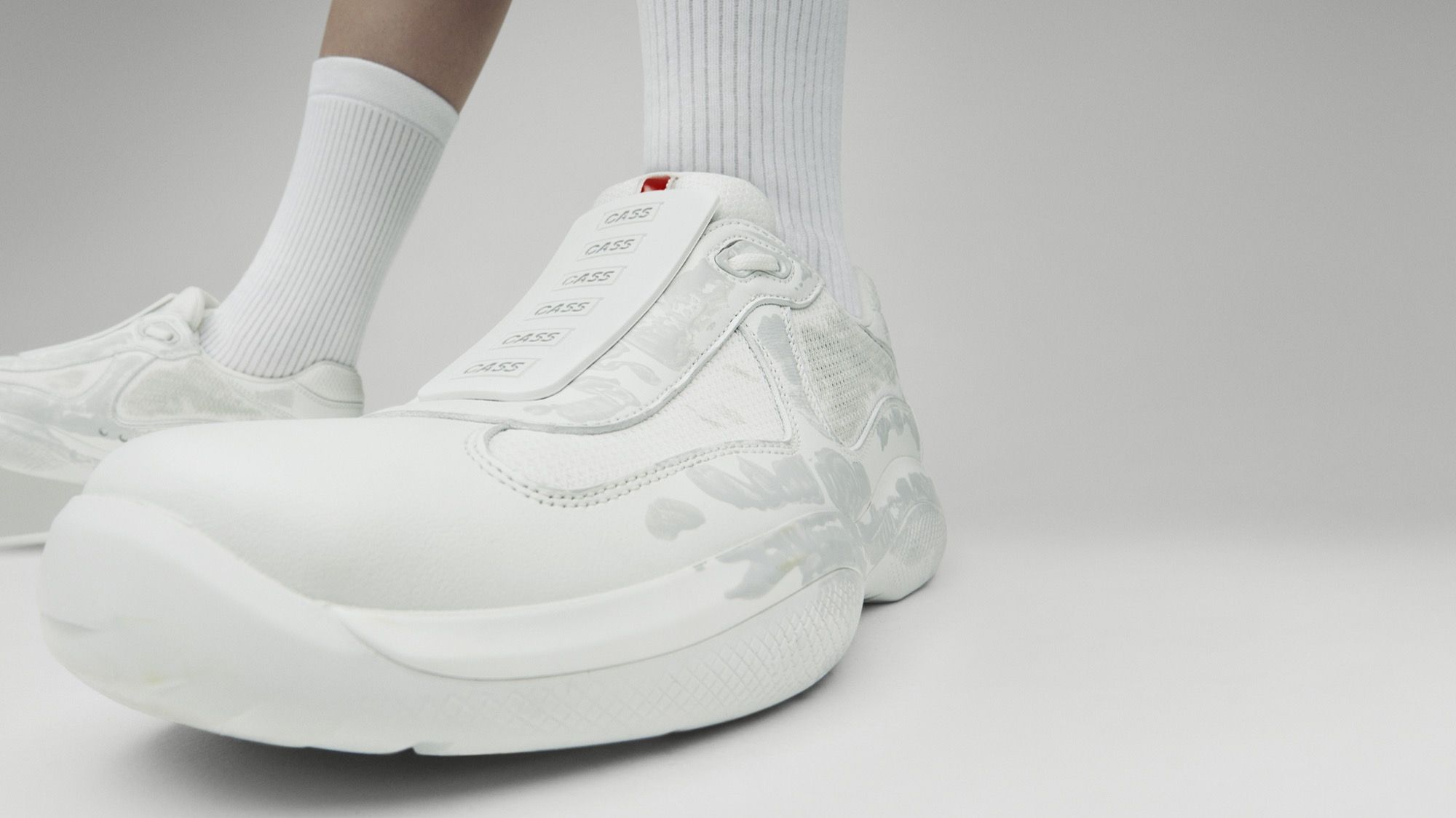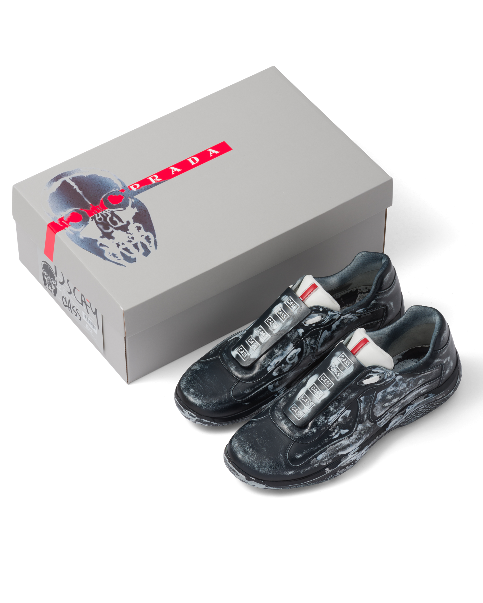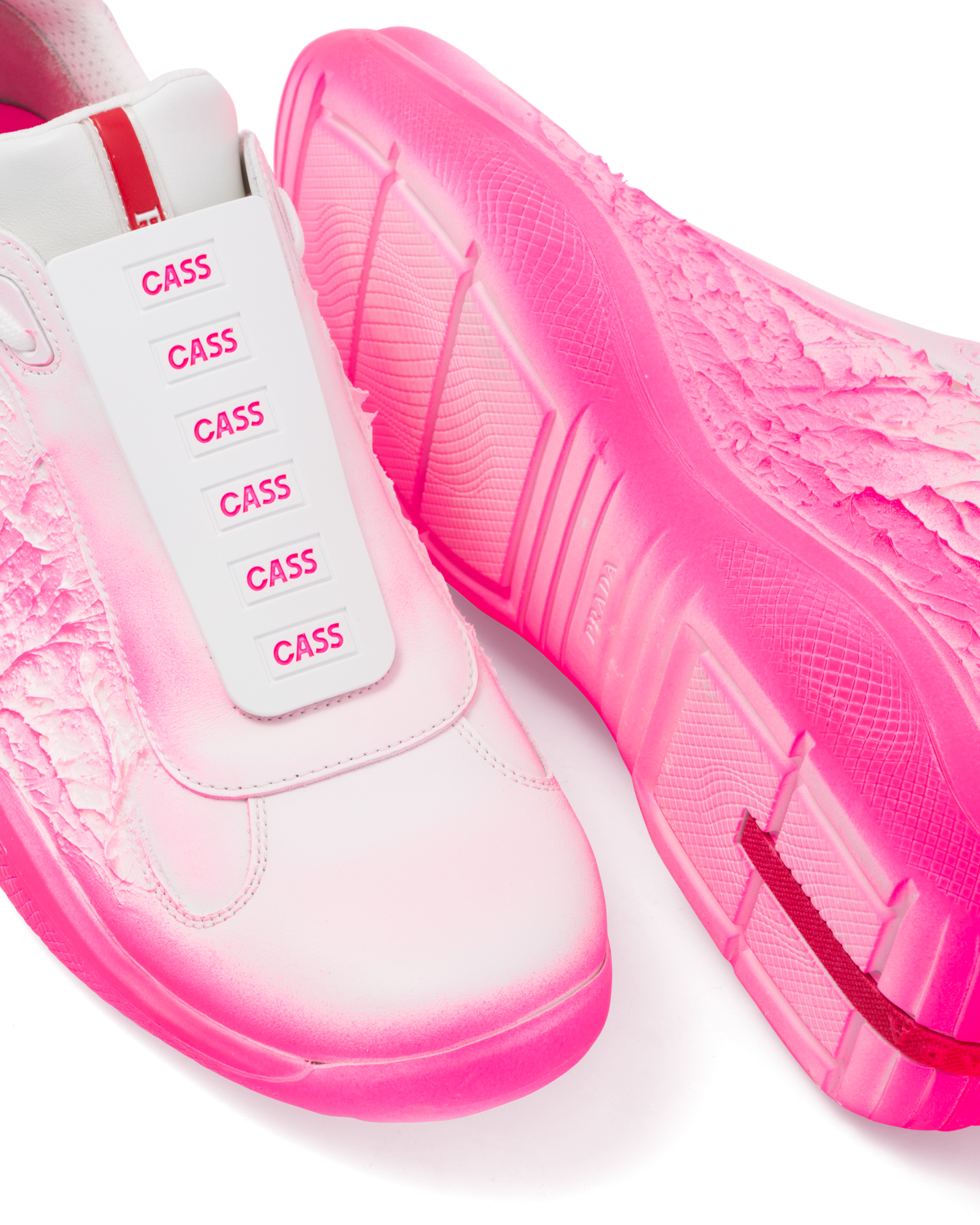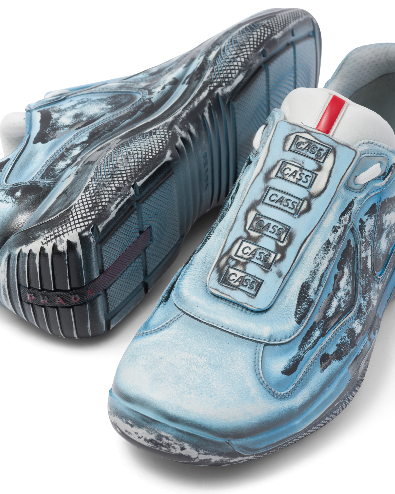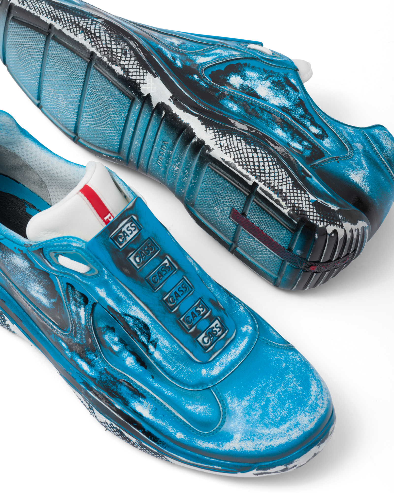 L'America’s Cup, creata alla fine degli anni ‘90 per l’equipaggio di Luna Rossa e realizzata interamente in pelle con i caratteristici inserti in tessuto traspirante a trama incrociata, una silhouette è immediatamente riconoscibile, diventa la tela di infinite reinterpretazioni. Cassius Hirst dipinse il suo primo paio di sneaker all’età di 14 anni come regalo per suo padre, l’artista Damien Hirst. Esposto sin da piccolo al mondo dell’arte, le sneaker sono diventate difatti la sua prima tela: oggetti scultorei le cui topografie sono state reinventate attraverso la pittura a mano con vernice spray, che gli sono valsi la stima di fan del calibro di A$AP Rocky, Playboi Carti, Offset, Rihanna, AJ Tracey e del compianto Virgil Abloh. La collaborazione con Prada è nata per caso, in un pomeriggio di sperimentazione: «Stavo dipingendo le Air Force 1, facevo delle foto e le trasformavo in stencil di vinile molto complessi, che poi diventavano disegni astratti. Coprivo una parte della scarpa e la avvolgevo con lo stencil, proteggendone solo una parte, il risultato era pazzesco. Ho fotografato ogni fase di questo esperimento e ho mandato una delle foto a mio padre. Lui l’ha poi inviata a Miuccia che ha detto: "E’ fantastico, facciamone qualcosa"».