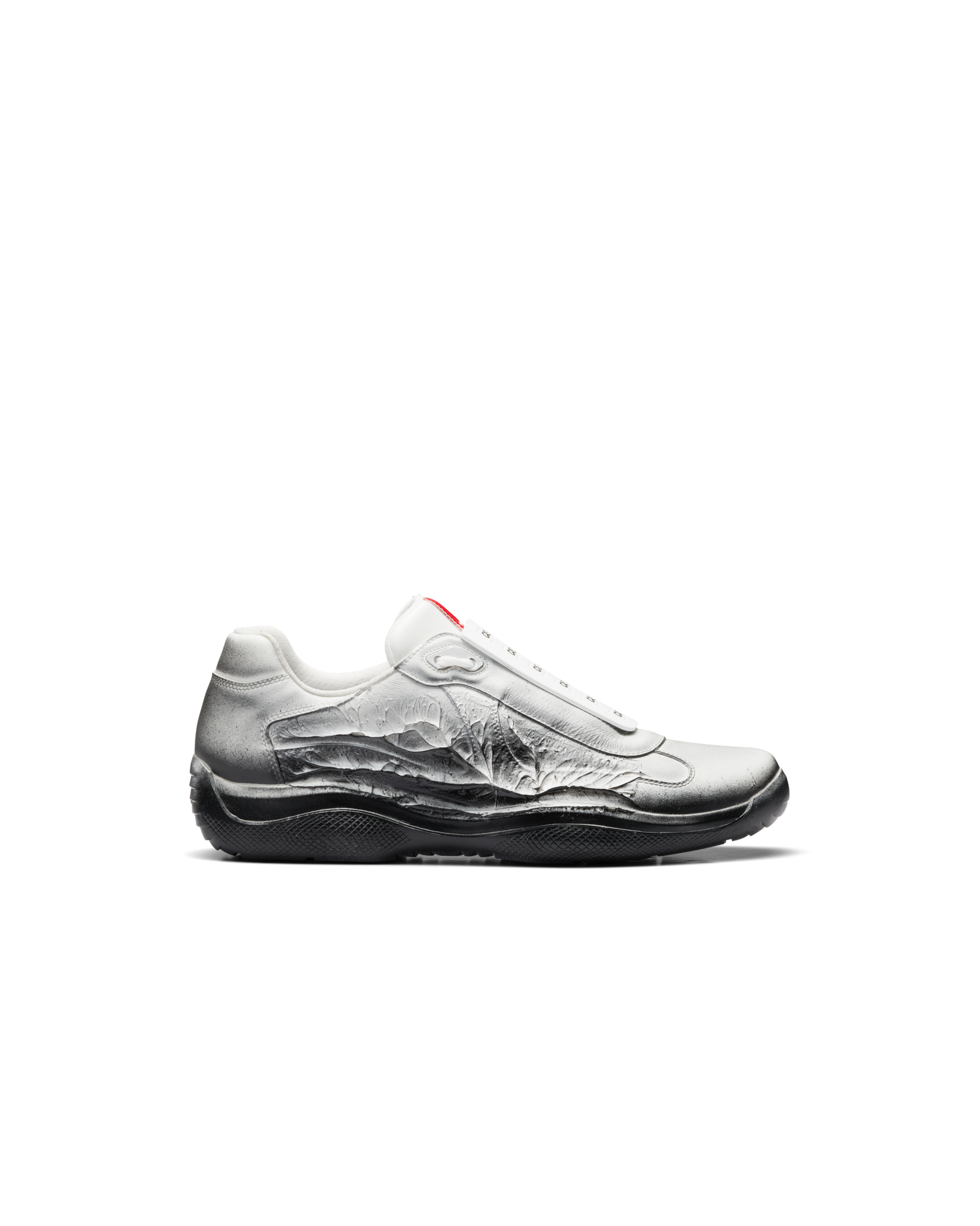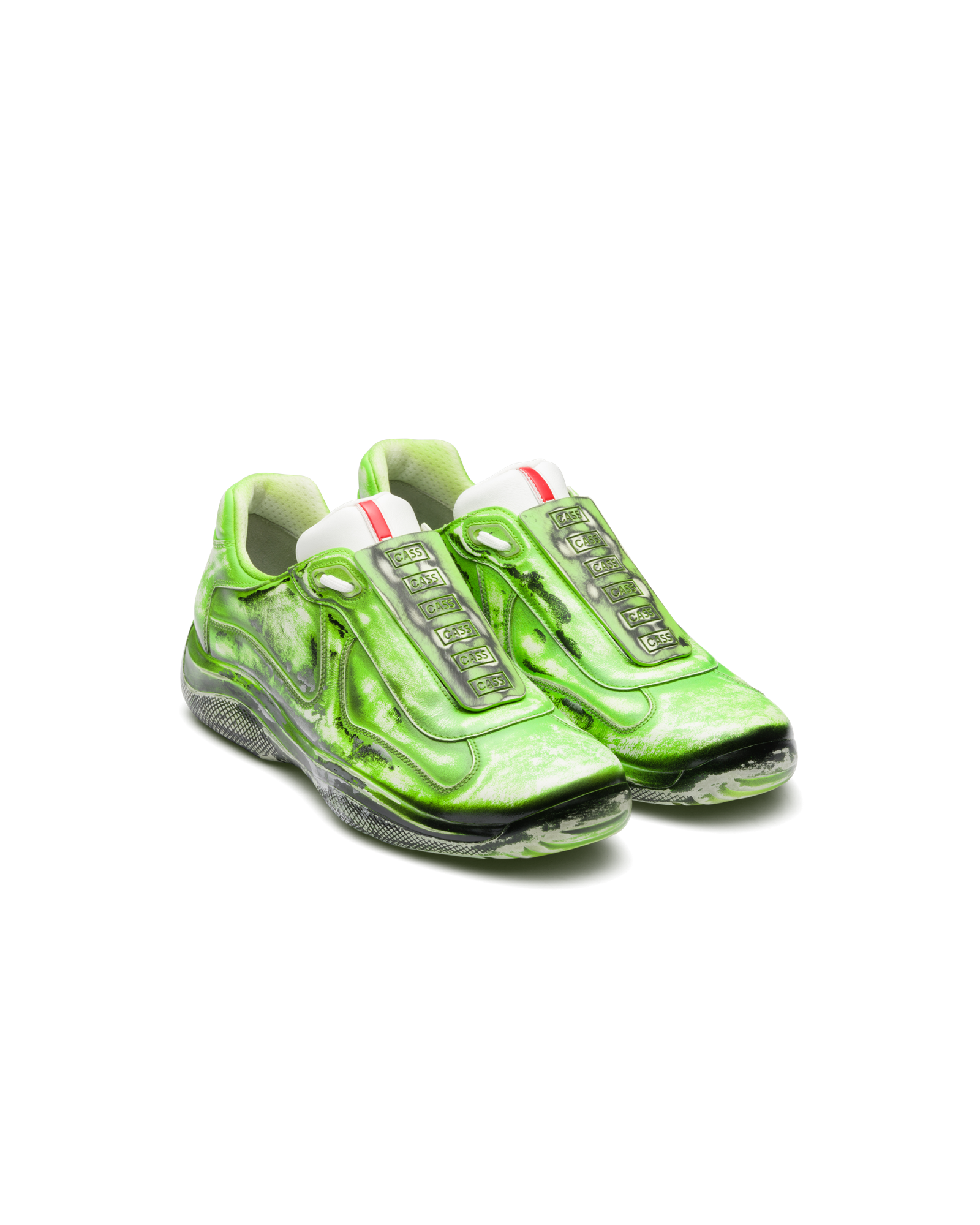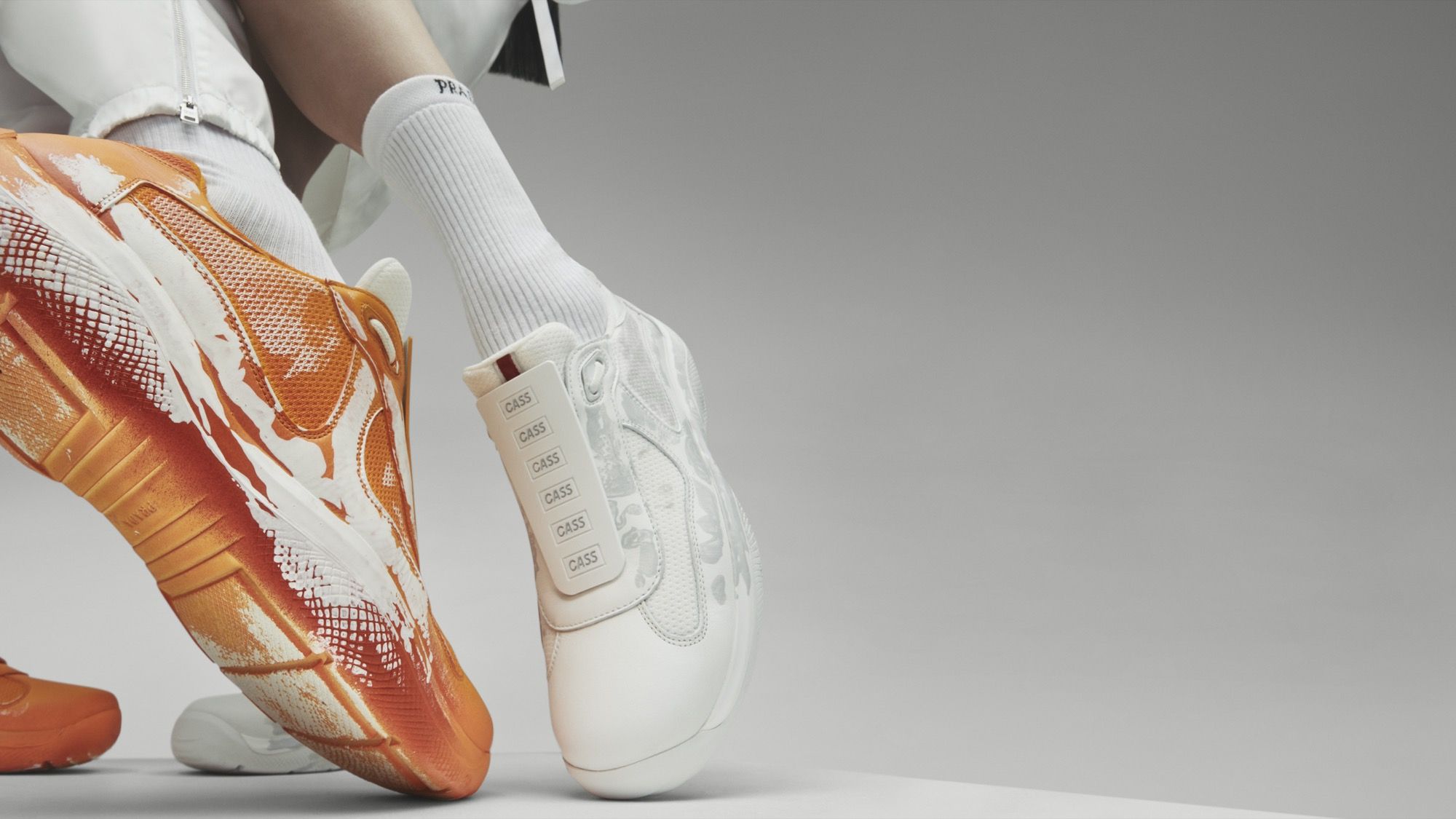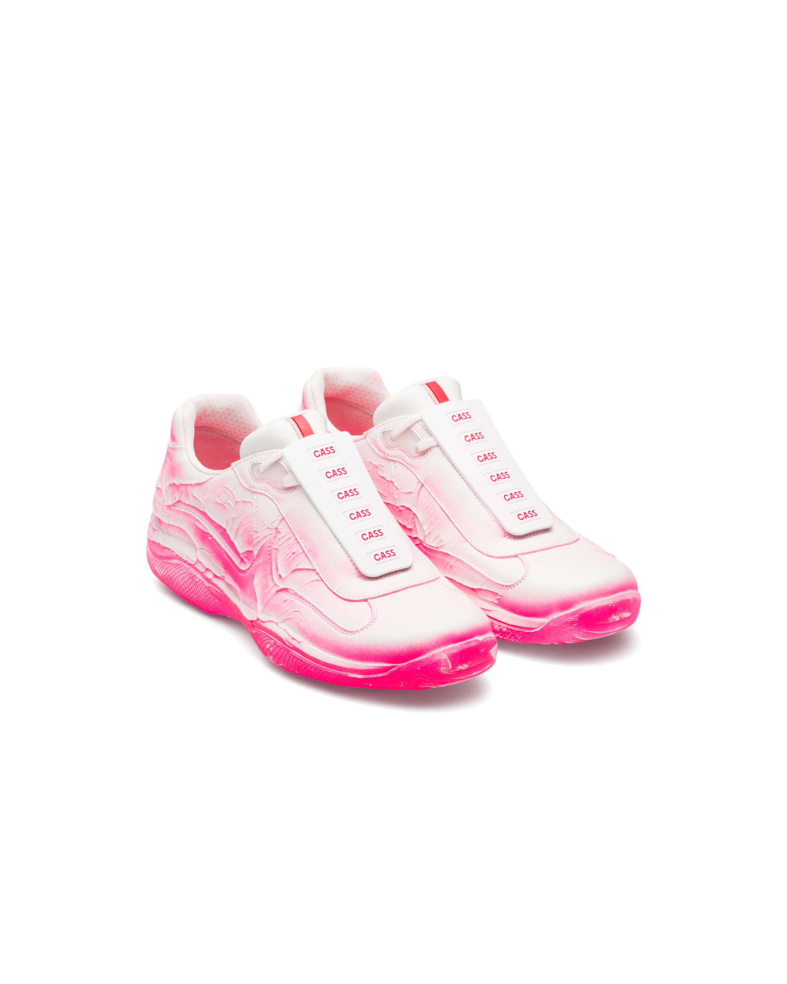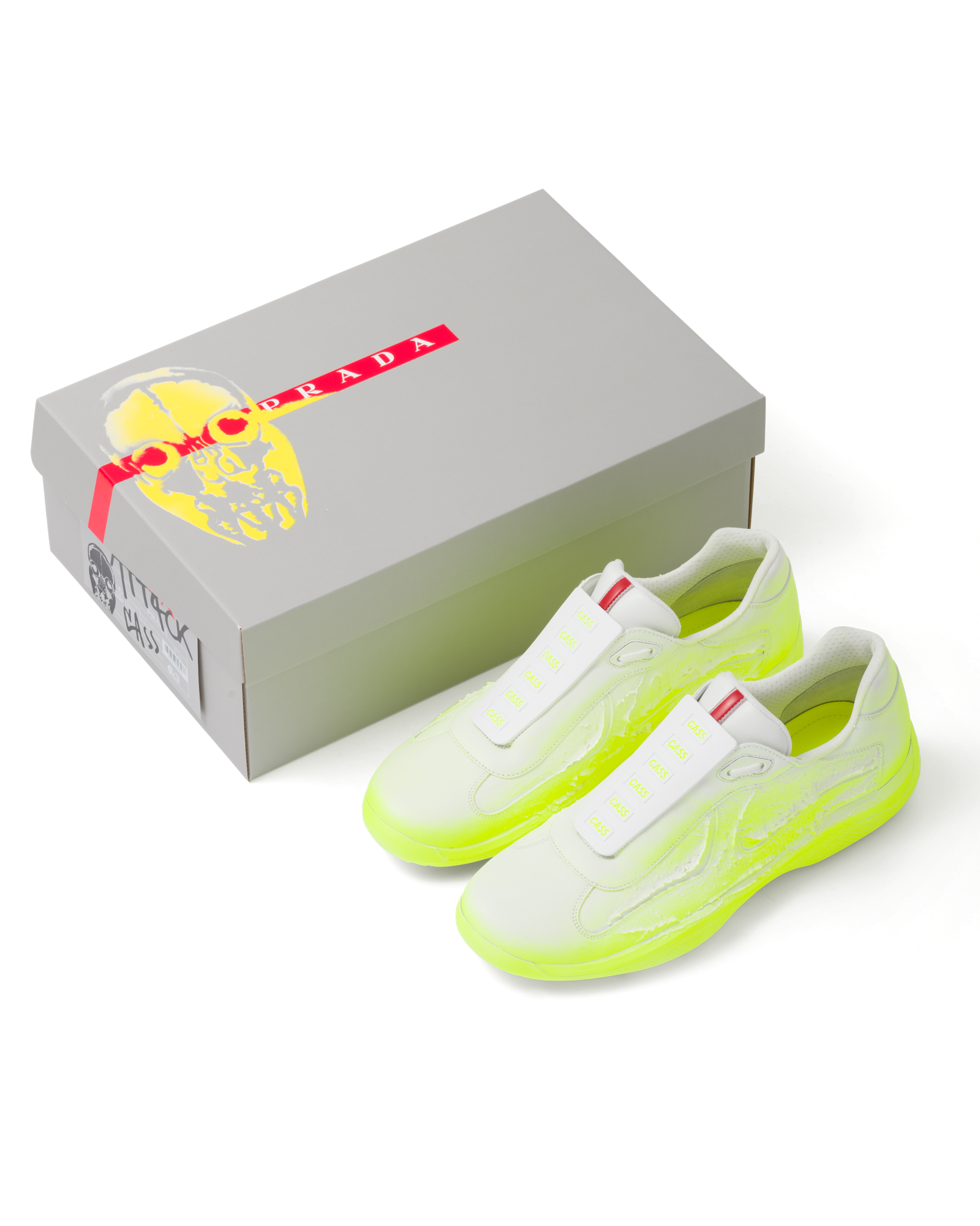 L'America’s Cup, creata alla fine degli anni ‘90 per l’equipaggio di Luna Rossa e realizzata interamente in pelle con i caratteristici inserti in tessuto traspirante a trama incrociata, una silhouette è immediatamente riconoscibile, diventa la tela di infinite reinterpretazioni. Cassius Hirst dipinse il suo primo paio di sneaker all’età di 14 anni come regalo per suo padre, l’artista Damien Hirst. Esposto sin da piccolo al mondo dell’arte, le sneaker sono diventate difatti la sua prima tela: oggetti scultorei le cui topografie sono state reinventate attraverso la pittura a mano con vernice spray, che gli sono valsi la stima di fan del calibro di A$AP Rocky, Playboi Carti, Offset, Rihanna, AJ Tracey e del compianto Virgil Abloh. La collaborazione con Prada è nata per caso, in un pomeriggio di sperimentazione: «Stavo dipingendo le Air Force 1, facevo delle foto e le trasformavo in stencil di vinile molto complessi, che poi diventavano disegni astratti. Coprivo una parte della scarpa e la avvolgevo con lo stencil, proteggendone solo una parte, il risultato era pazzesco. Ho fotografato ogni fase di questo esperimento e ho mandato una delle foto a mio padre. Lui l’ha poi inviata a Miuccia che ha detto: "E’ fantastico, facciamone qualcosa"».