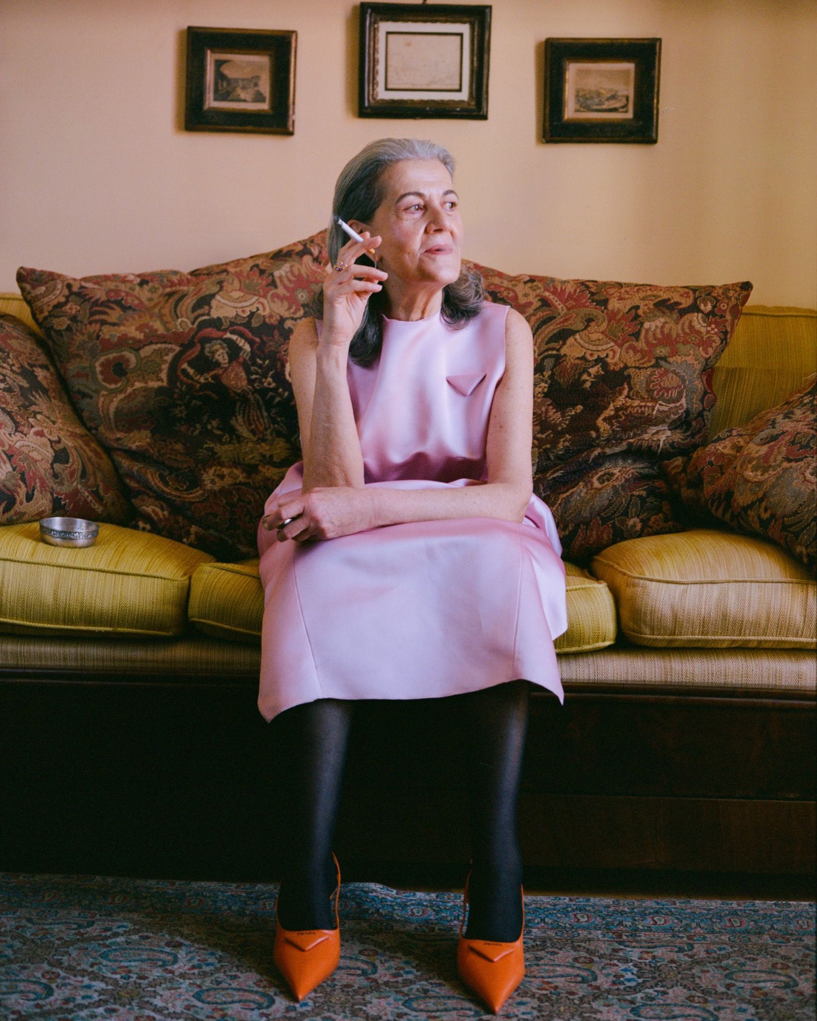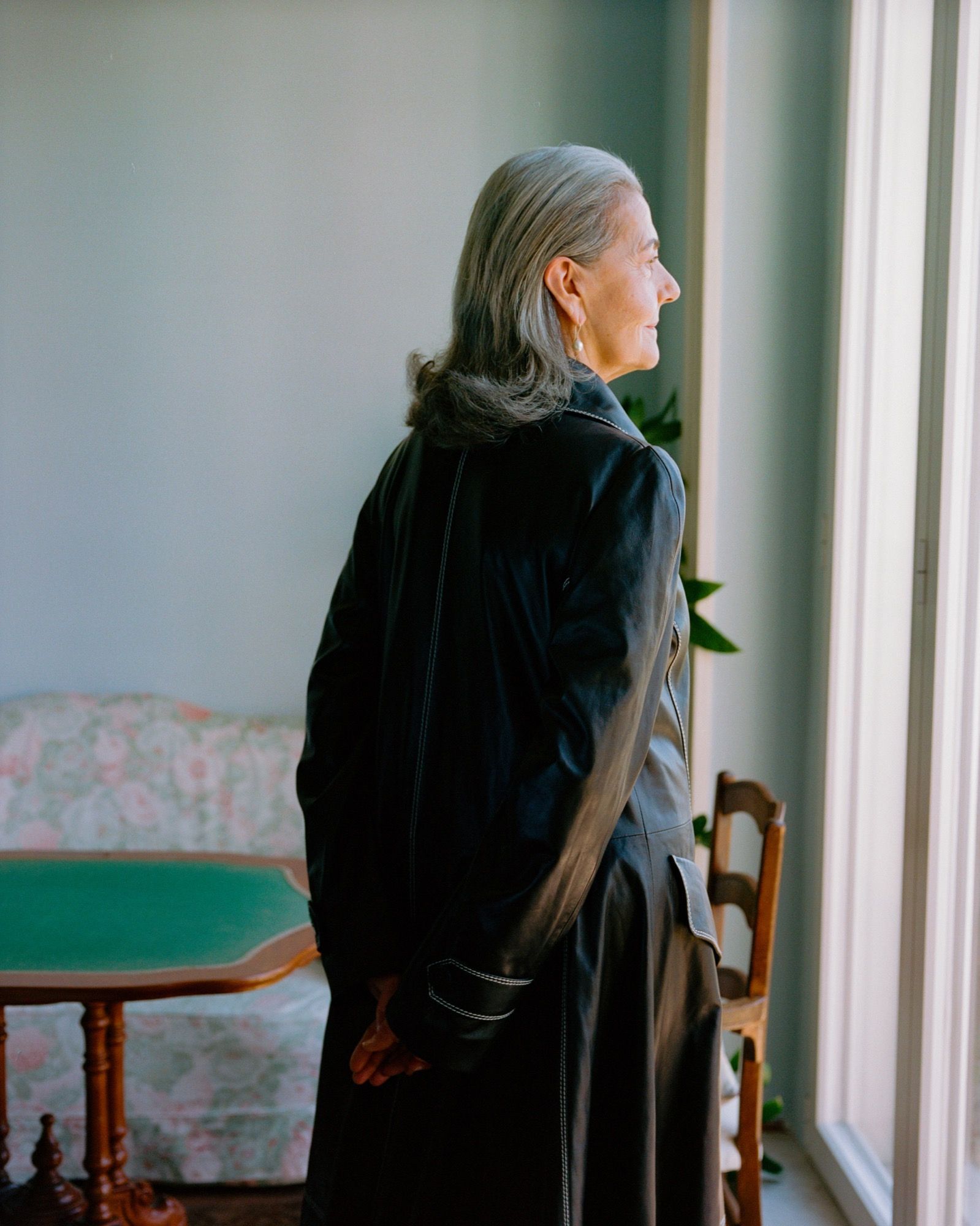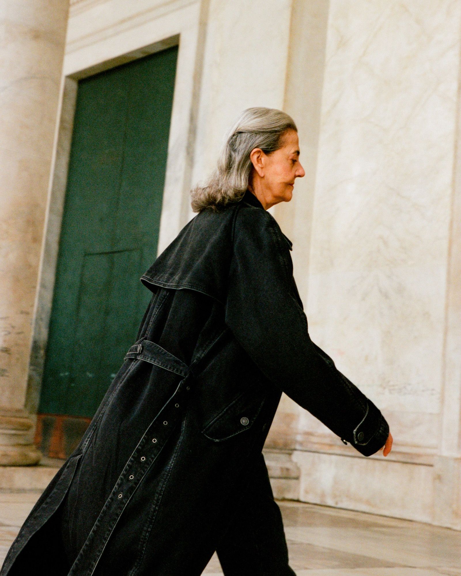 Ad un certo punto, come in una di quelle scene mute che non hanno bisogno di nessun contorno recitato, Spotify sceglie per noi Mi sei scoppiato dentro il cuore e Betti si emoziona, dietro la lente ferma di Eleonora. Per un attimo un’eclisse di emozioni copre quei click, lasciandoci tutti in ascolto, davanti al volto intenso di Betti che non teme i nostri occhi addosso perché il ricordo di una persona importante le sta parlando. Cambiamo canzone e riprendiamo il ritmo, come un cambio di scena, di abito, di personaggio. Si riapre un sipario. Il fumo di sigaretta si fa sempre più intenso, come un’anima che si trascina e che le fa compagnia. Non può separarsene, tanto che fuma anche sul palco a teatro, raccontandoci di quella volta divertente in cui quella sigaretta maledetta non si degnava di accendersi. Ci spostiamo poi in Piazza Plebiscito, tra la folla curiosa che la riconosce e ci chiede se-lei-è-quella-attrice-che e la vestiamo in denim con mules gommate Y/Project, mentre ci cammina tra i colonnati, divertita e completamente a suo agio, forse perché noi, involontariamente, ancora una volta, altro non siamo che il suo pubblico. Così Elisabetta Pedrazzi, per tutti Betti, per i social ormai @bettipedrazzi, è una donna senza filtri, che a sessanta-e-non-ci-importa-quanti si è messa in gioco per noi, nei panni di qualcuno, di chi nello specifico non ha voluto dircelo, per dimostrare che, forse, quella umanità orrenda sa regalarci, a volte, delle sorprese.