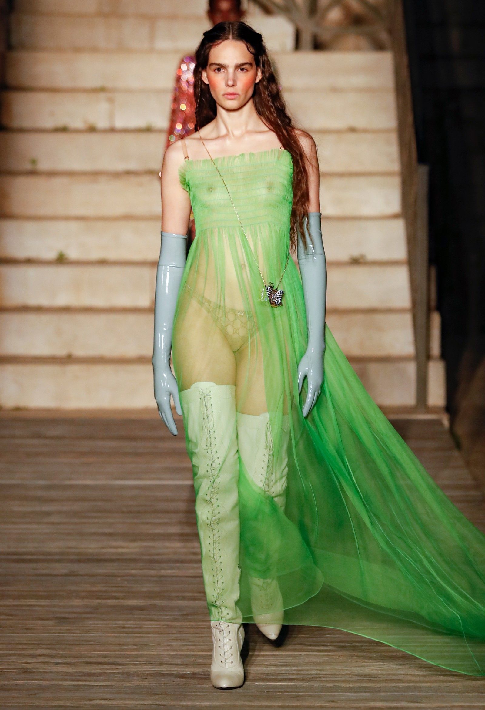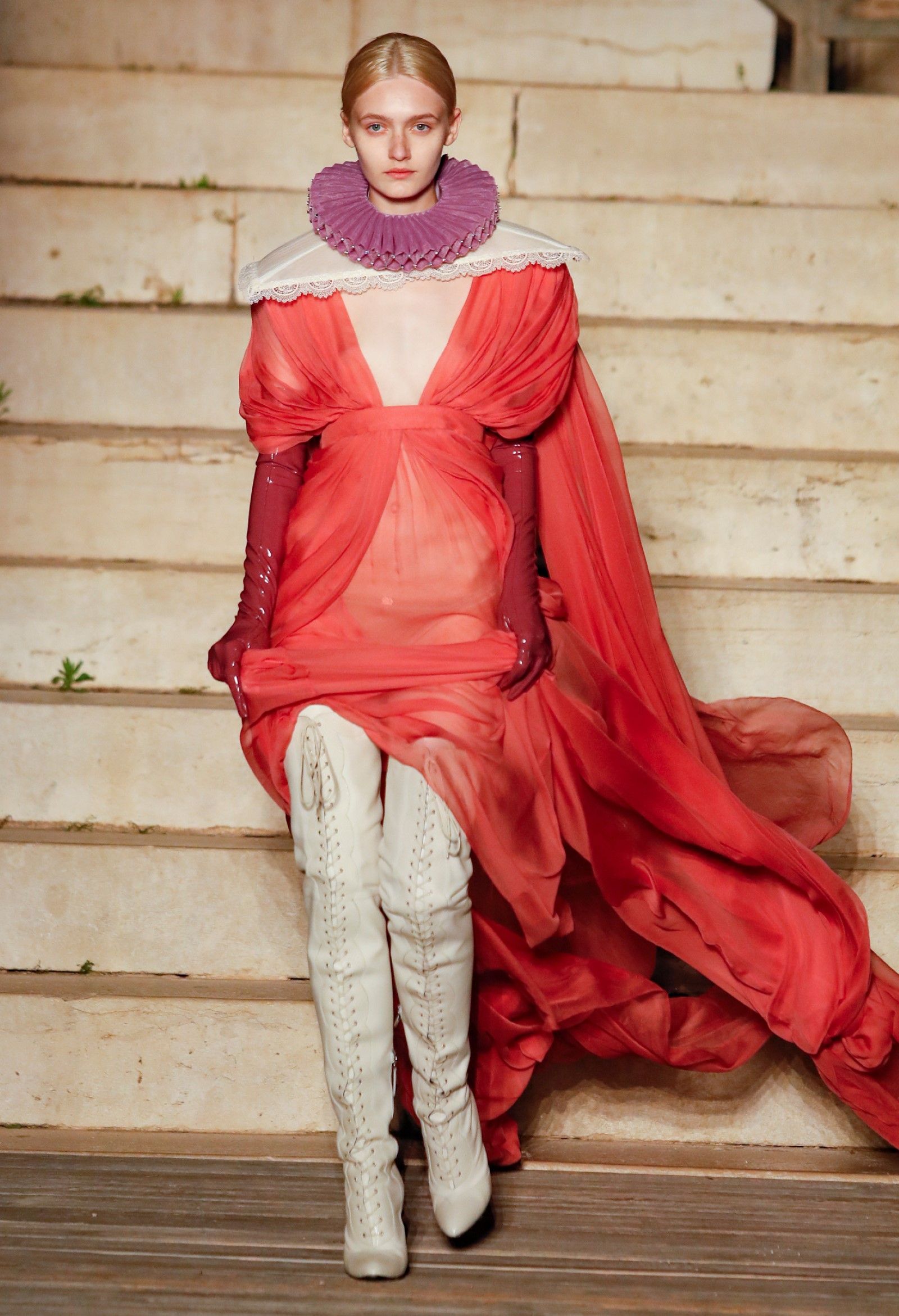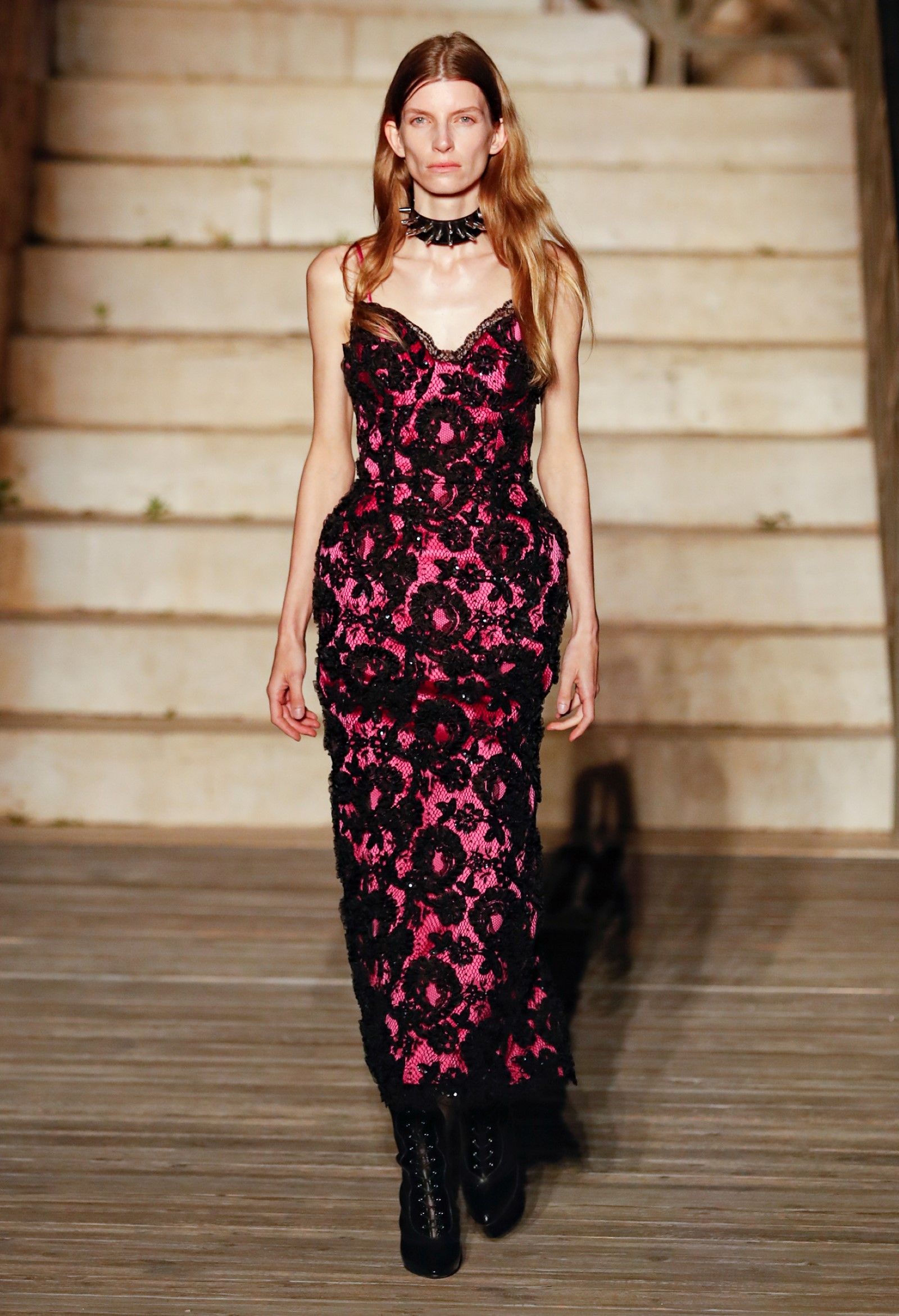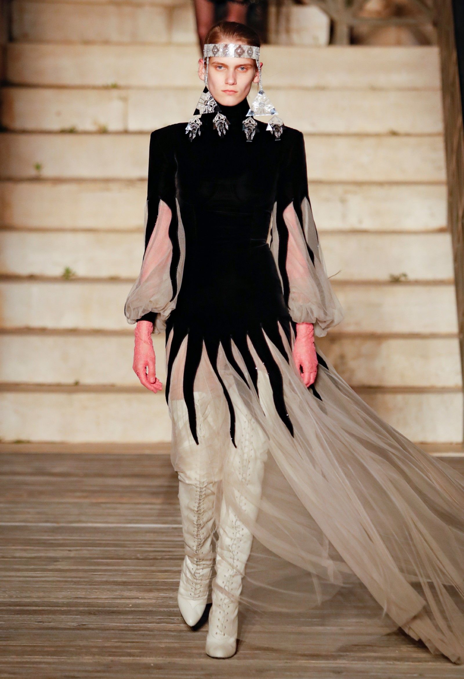 Scorrendo i look si può avere un’idea di questo campionario di personaggi romantici: principesse dalle lunghe gonne, nobildonne in cappe d’ermellino, arlecchini elisabettiani, figlie dei fiori vestite di jeans scintillanti, una modella aveva un abito nero che omaggiava icone horror anni ’50 come Morticia Addams e Vampira, un’altra indossava un costume a metà tra la Grecia e l’Impero Ottomano, c’erano starlet anni ’50 in lunghe gonne da sirena, ragazze nude sotto un velo che sembravano la Venere di Botticelli, rimandi a Crudelia DeMon, ai costumi cinematografici dei classici noir – un look nello specifico, il 29, abbinava un abito in stile anni ’20 con una corona con pendenti in stile bizantino che era curiosamente simile al camaleuco di Costanza d'Aragona, la moglie di Federico II che costruì proprio Castel del Monte, e che oggi è conservato a Palermo.