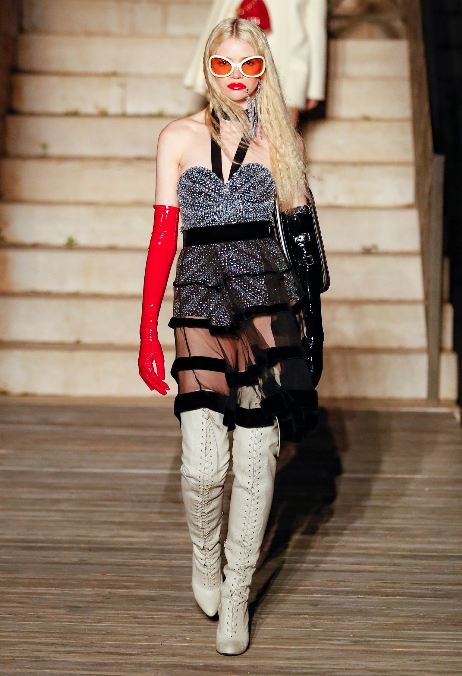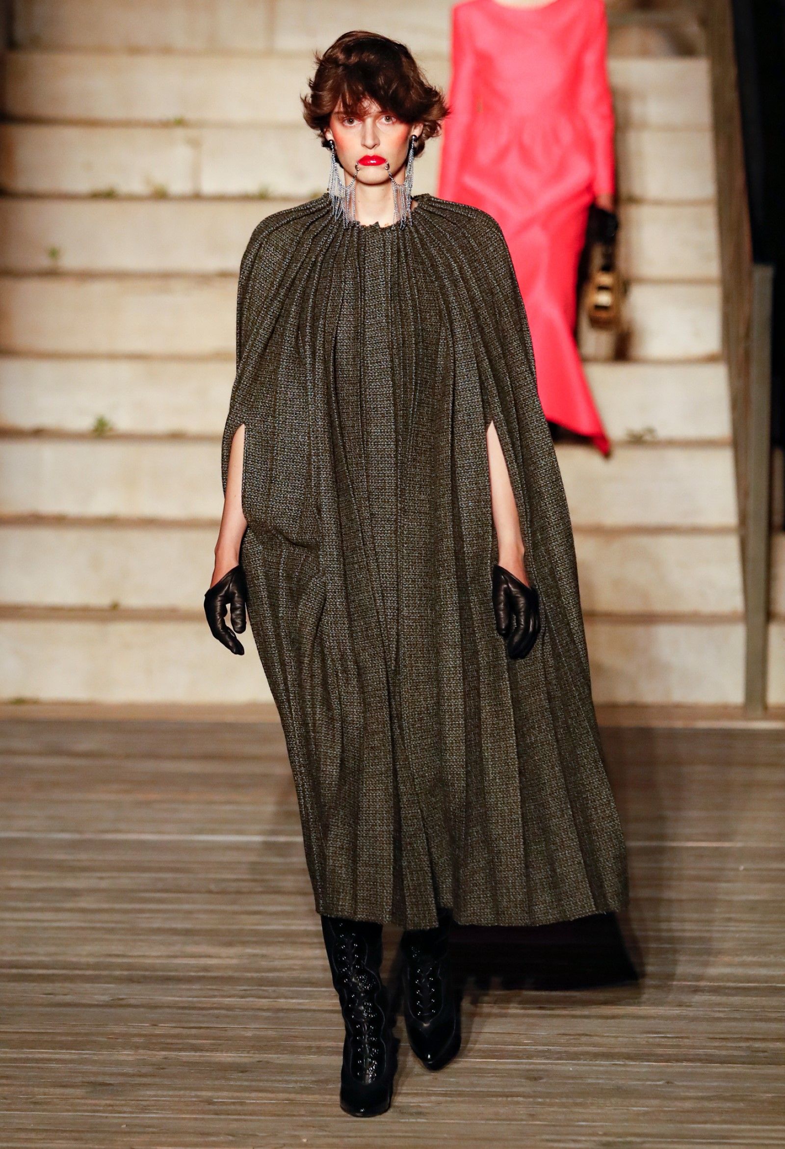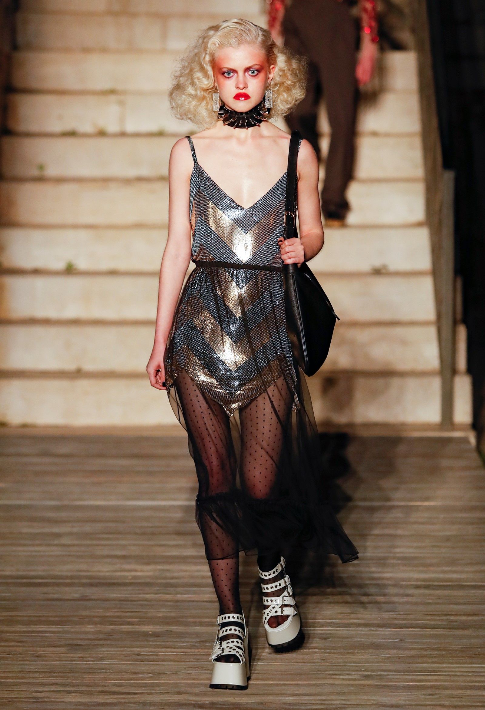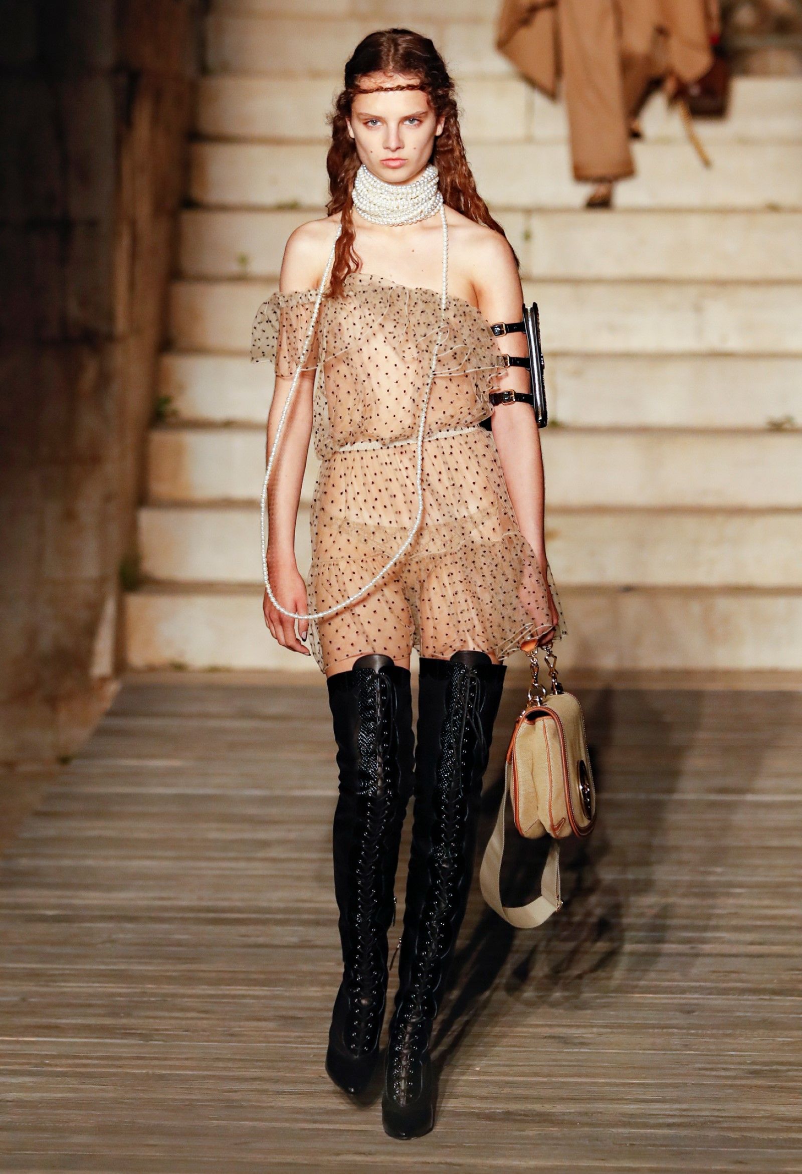 Scorrendo i look si può avere un’idea di questo campionario di personaggi romantici: principesse dalle lunghe gonne, nobildonne in cappe d’ermellino, arlecchini elisabettiani, figlie dei fiori vestite di jeans scintillanti, una modella aveva un abito nero che omaggiava icone horror anni ’50 come Morticia Addams e Vampira, un’altra indossava un costume a metà tra la Grecia e l’Impero Ottomano, c’erano starlet anni ’50 in lunghe gonne da sirena, ragazze nude sotto un velo che sembravano la Venere di Botticelli, rimandi a Crudelia DeMon, ai costumi cinematografici dei classici noir – un look nello specifico, il 29, abbinava un abito in stile anni ’20 con una corona con pendenti in stile bizantino che era curiosamente simile al camaleuco di Costanza d'Aragona, la moglie di Federico II che costruì proprio Castel del Monte, e che oggi è conservato a Palermo.
