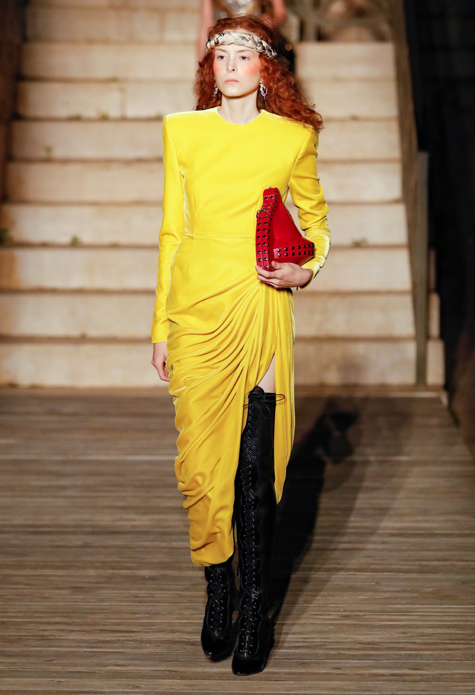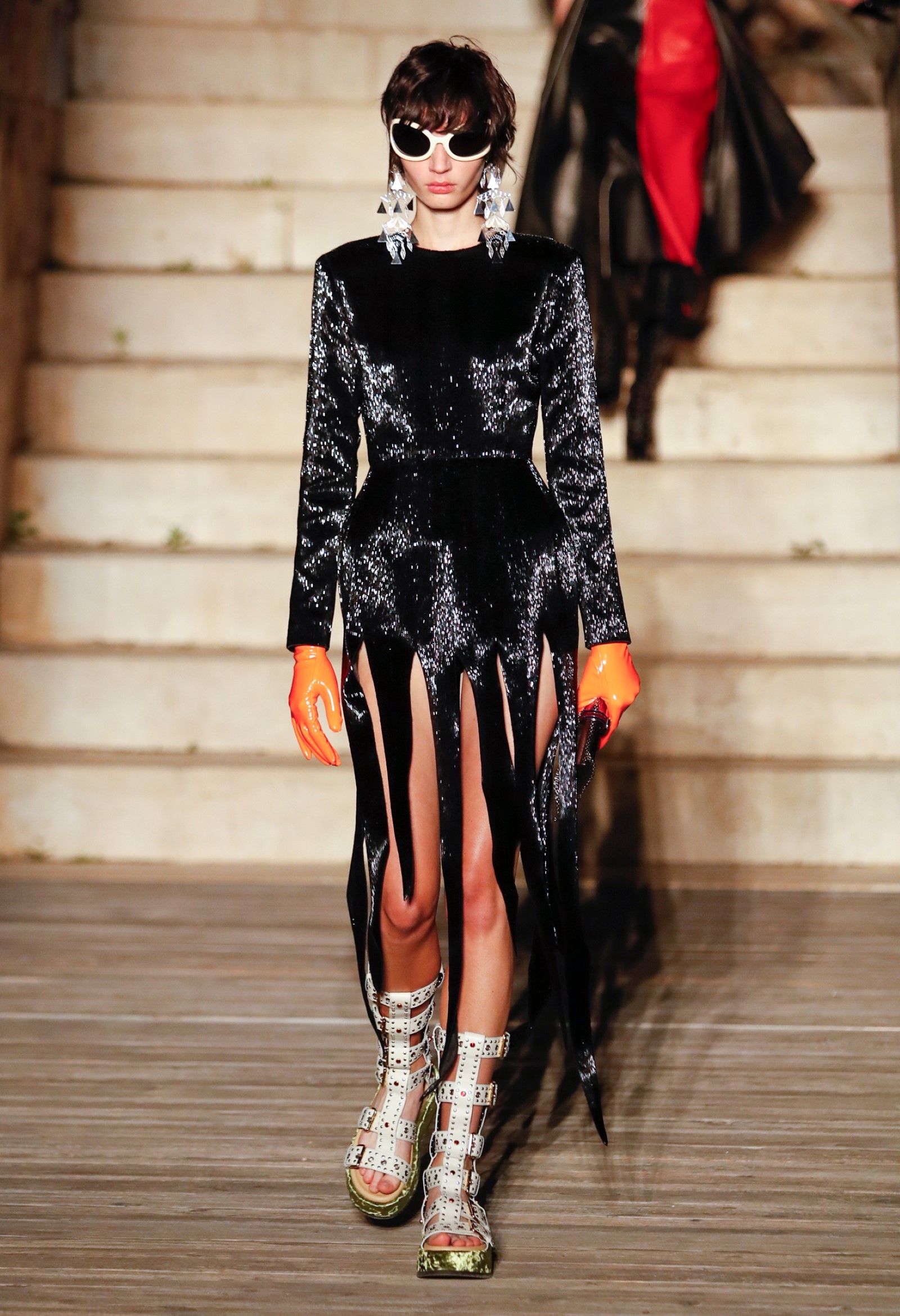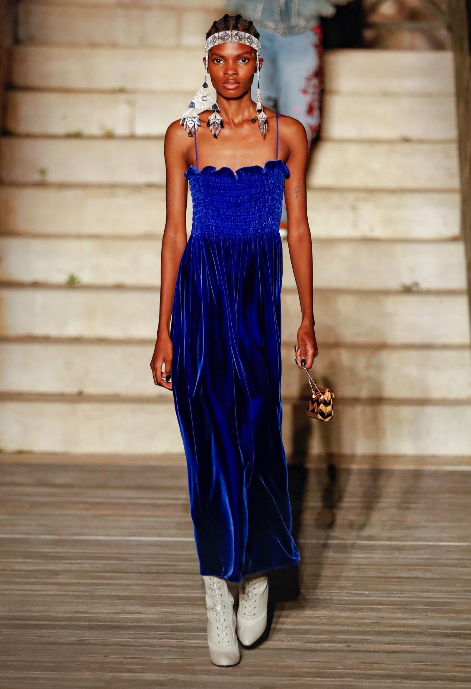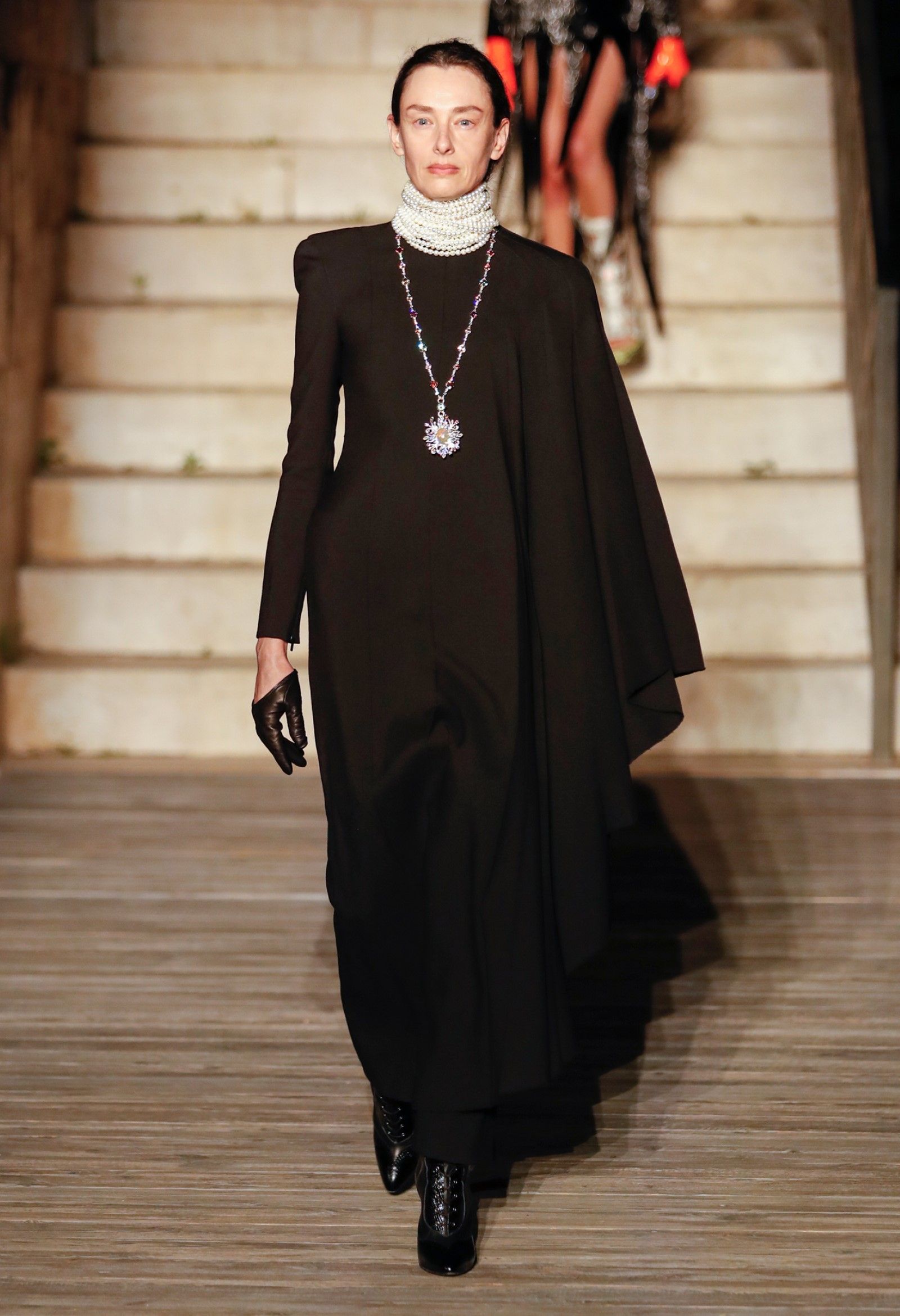 Scorrendo i look si può avere un’idea di questo campionario di personaggi romantici: principesse dalle lunghe gonne, nobildonne in cappe d’ermellino, arlecchini elisabettiani, figlie dei fiori vestite di jeans scintillanti, una modella aveva un abito nero che omaggiava icone horror anni ’50 come Morticia Addams e Vampira, un’altra indossava un costume a metà tra la Grecia e l’Impero Ottomano, c’erano starlet anni ’50 in lunghe gonne da sirena, ragazze nude sotto un velo che sembravano la Venere di Botticelli, rimandi a Crudelia DeMon, ai costumi cinematografici dei classici noir – un look nello specifico, il 29, abbinava un abito in stile anni ’20 con una corona con pendenti in stile bizantino che era curiosamente simile al camaleuco di Costanza d'Aragona, la moglie di Federico II che costruì proprio Castel del Monte, e che oggi è conservato a Palermo.