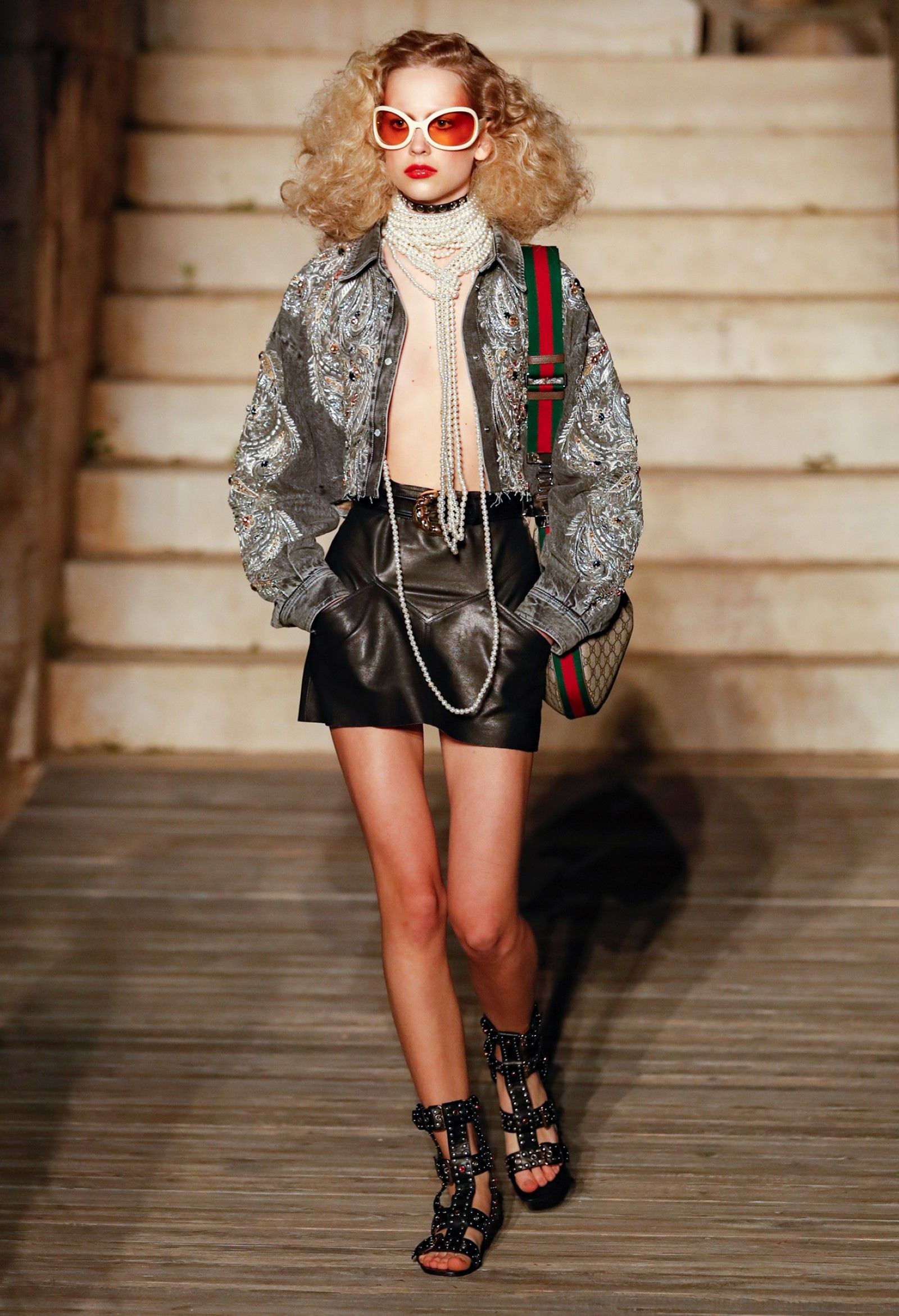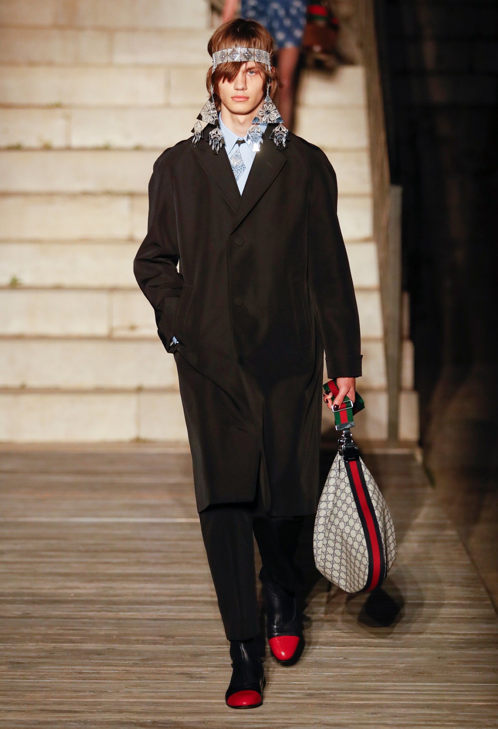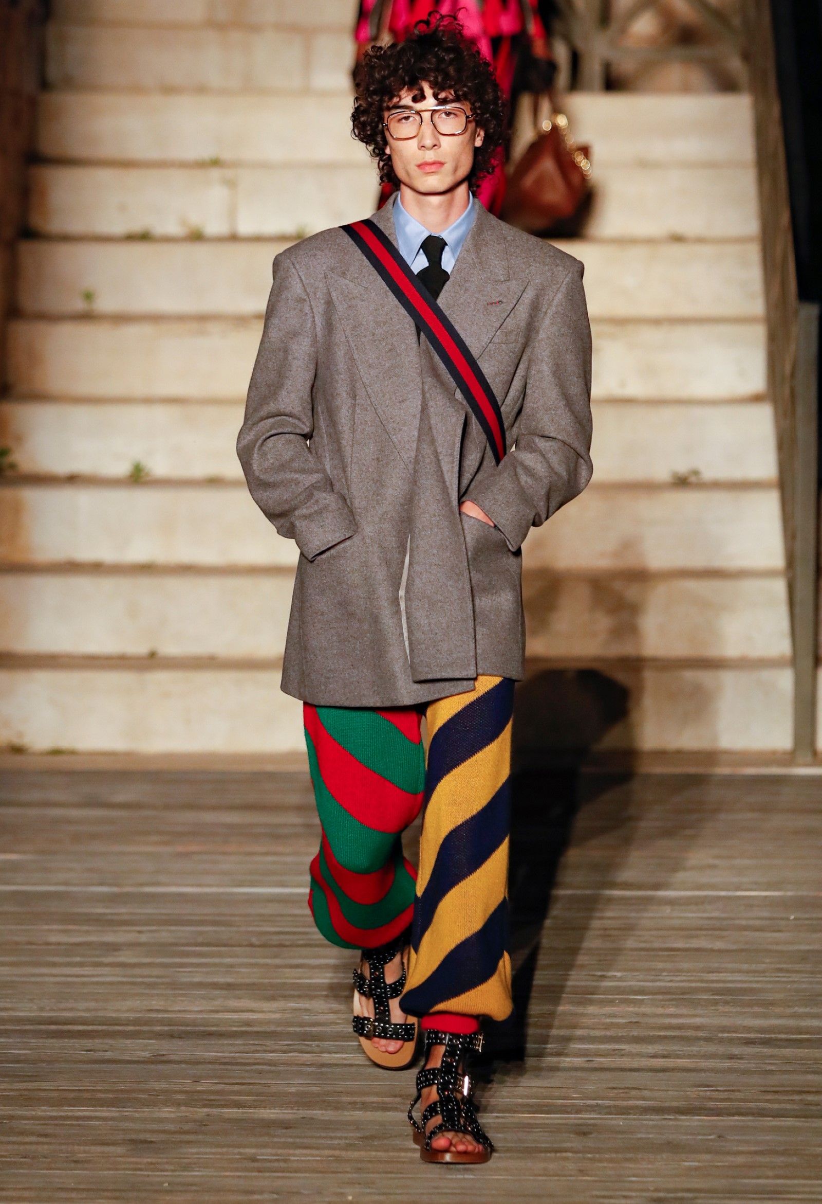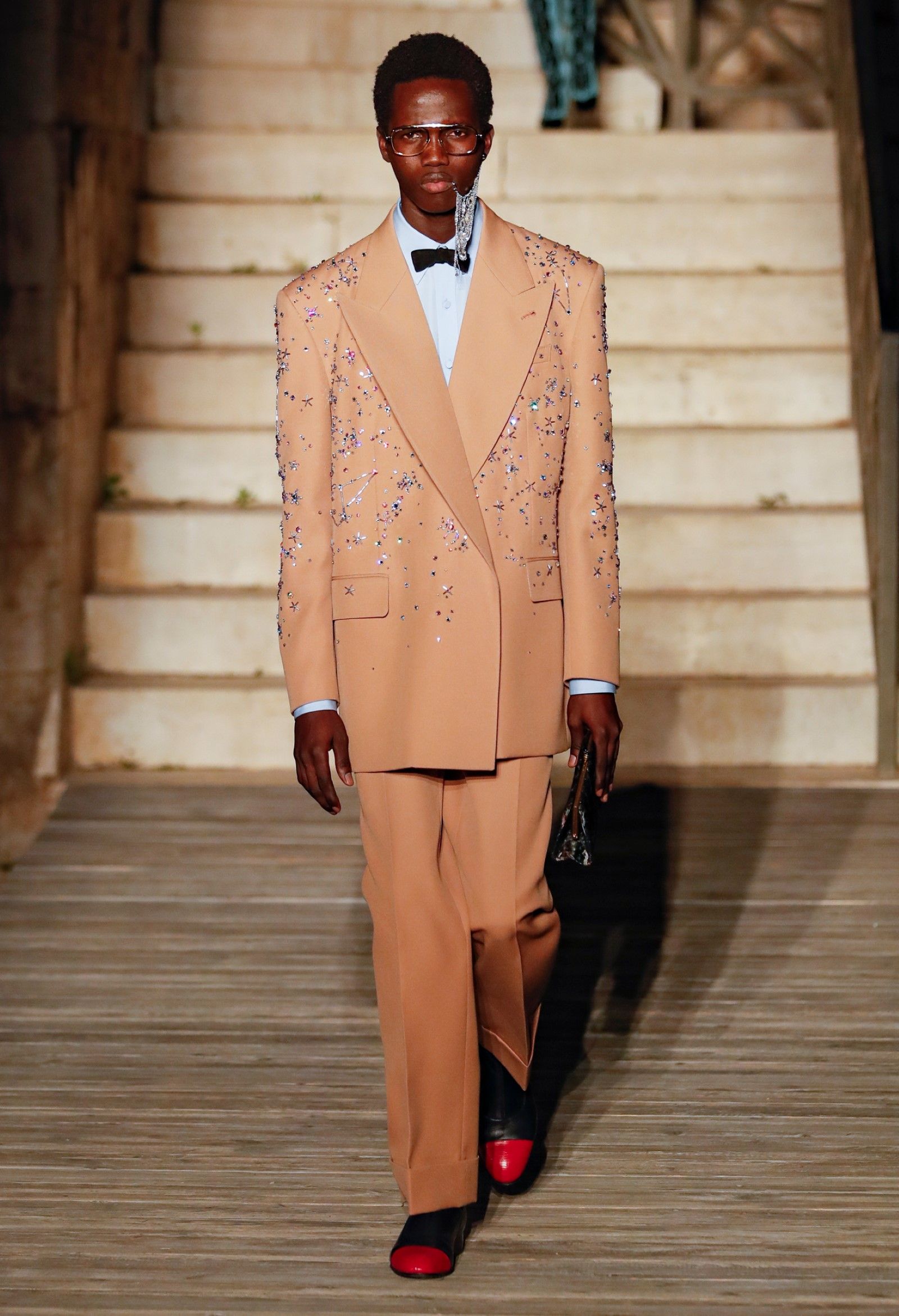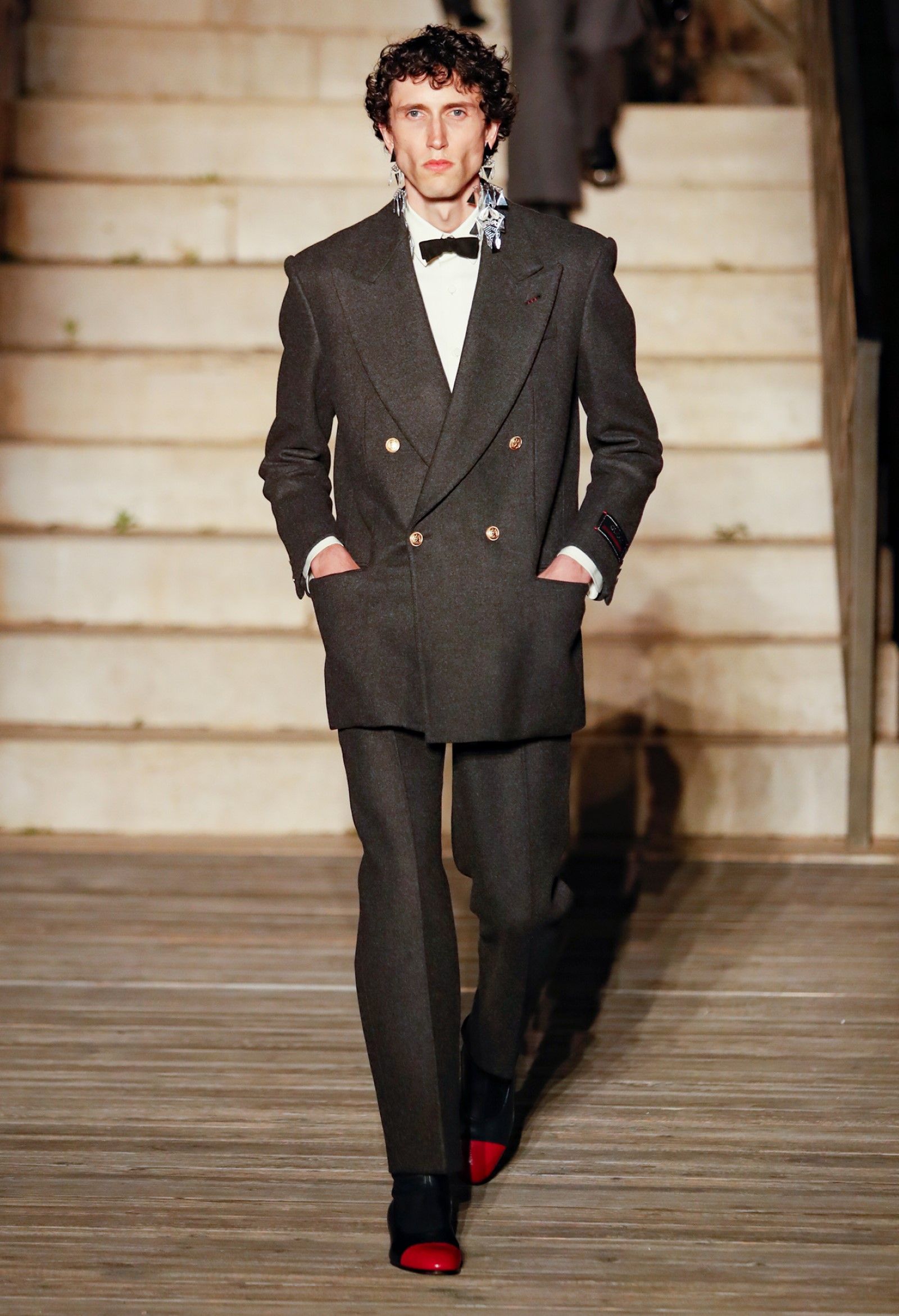 È chiaro, potremmo aggiungere, che Michele si è trovato pienamente a suo agio nel creare questa nuova collezione, sbizzarrrendosi insieme al suo team per esplorare non solo location diverse ma anche messe in scena spettacolari – che sono poi il fondale migliore per lo specifico tipo di reverie in cui Michele si è specializzato. Questa collezione, ad esempio, proprio come Gucci Love Parade, possedeva un respiro più ampio, un numero di look superiore al centinaio e un qualcosa di monumentale: tutti segni di una fantasia che si realizza non solo per merito della collezione in sé, ma anche della location, della vision che la ispira, della sintonia delle tanti parti mobili che stanno dietro al “momento” dello show come punto più alto della comunicazione/espressione del brand. Parlando con WWD, Michele ha paragonato la moda a «un grande coro», un richiamo alla collettività, ai vari elementi che, per citare il salmo, convenerunt in unum – esattamente come i molti astri diversi che compongono la medesima costellazione.