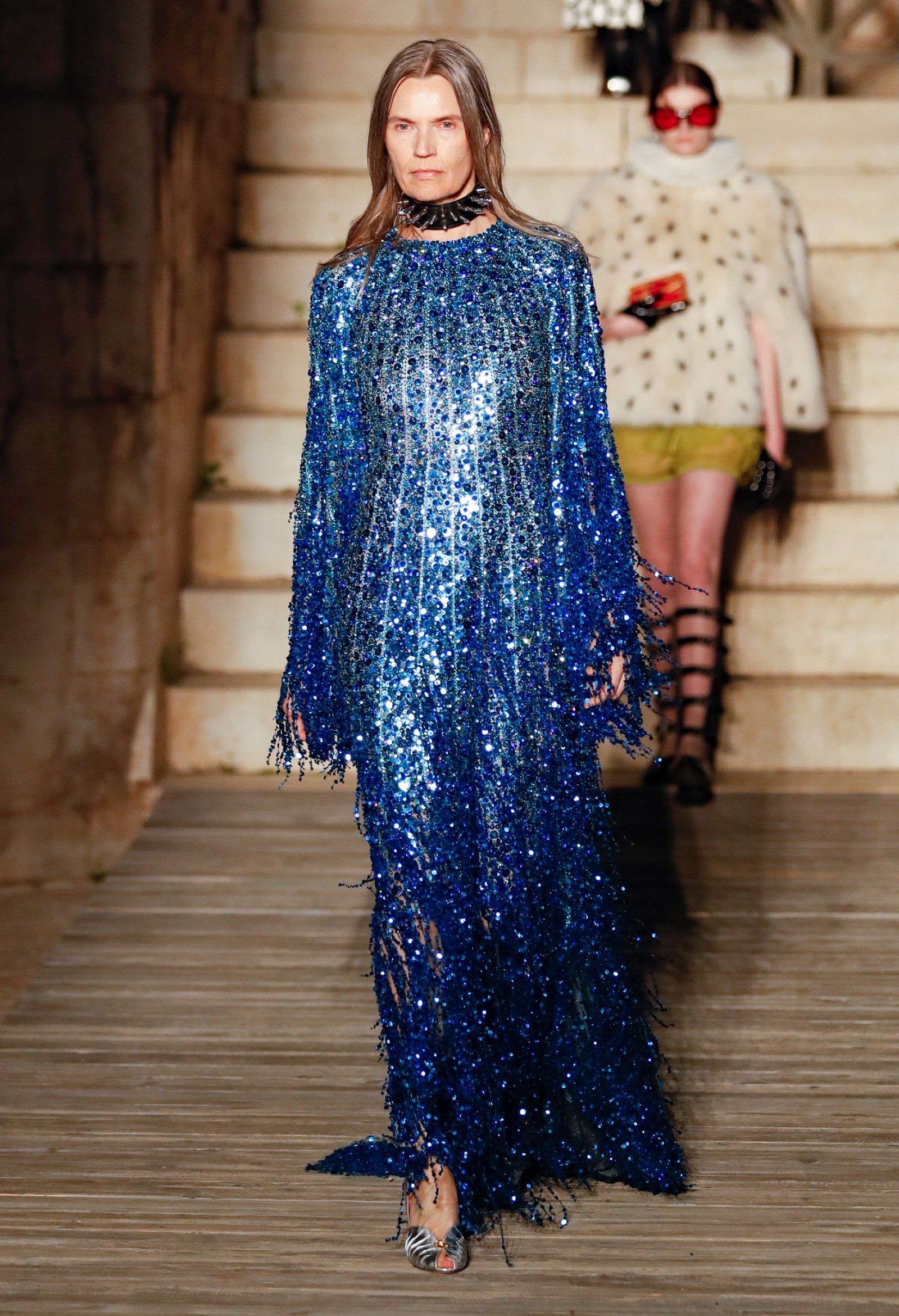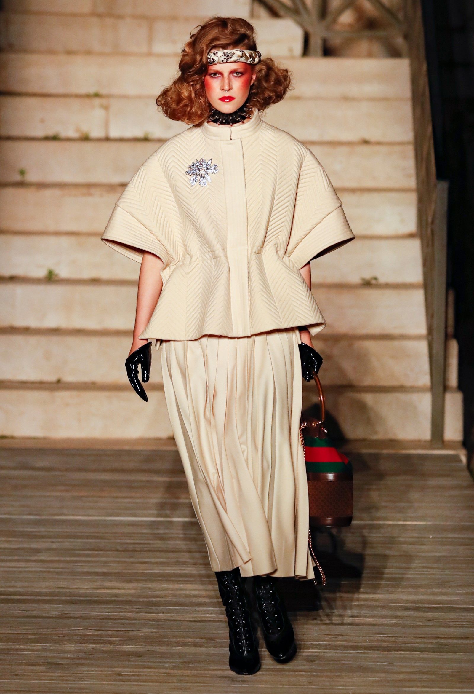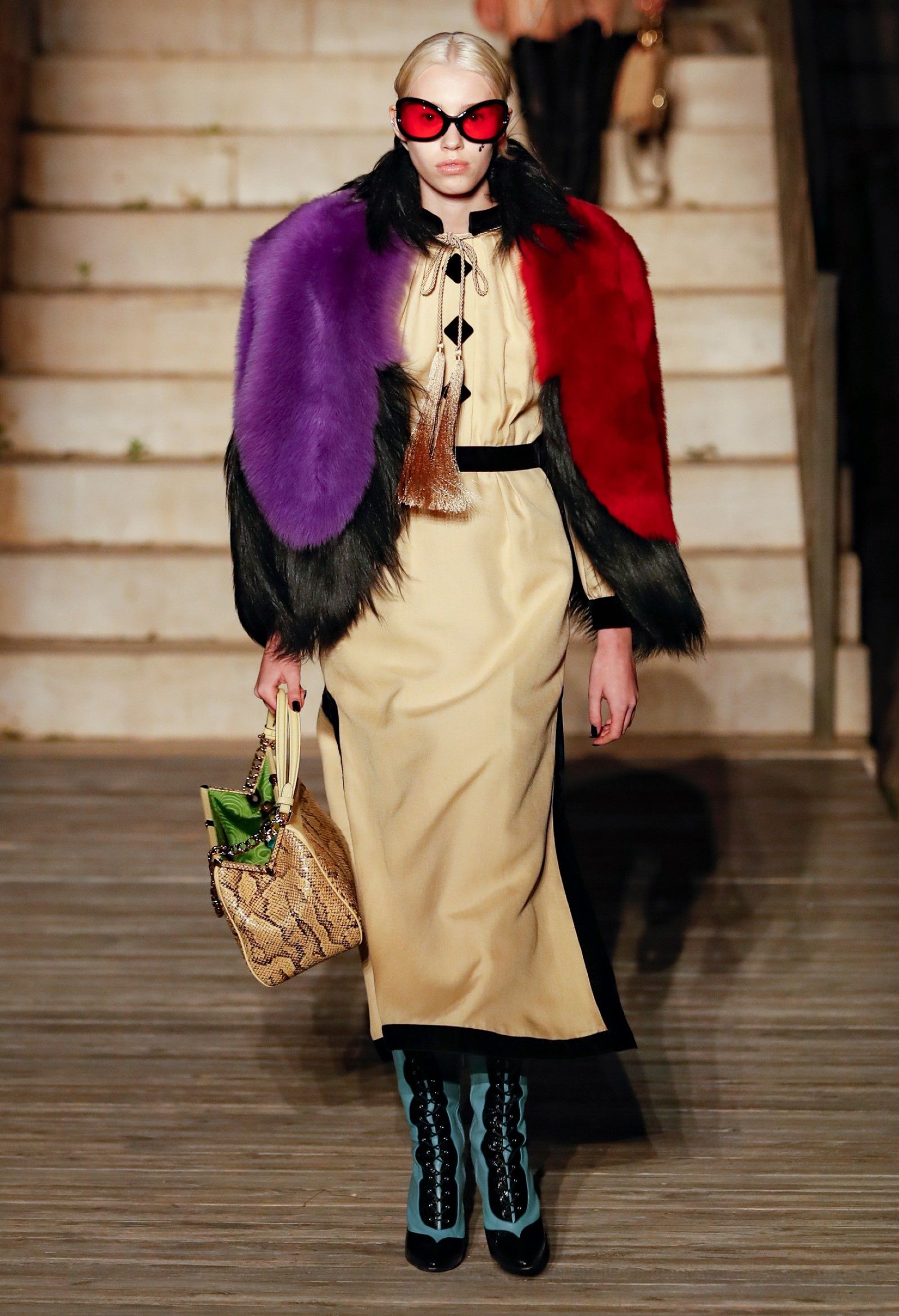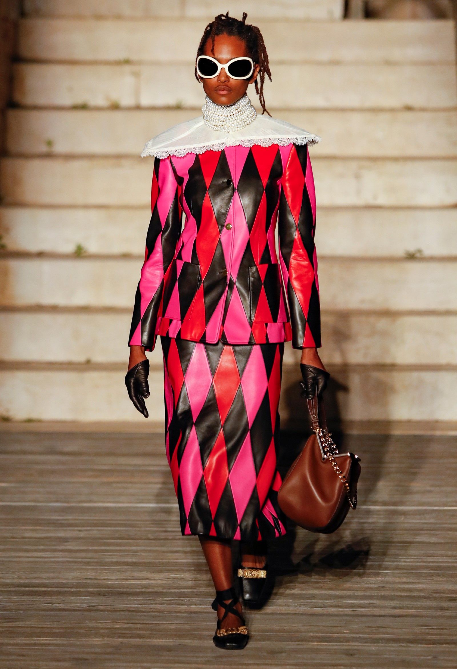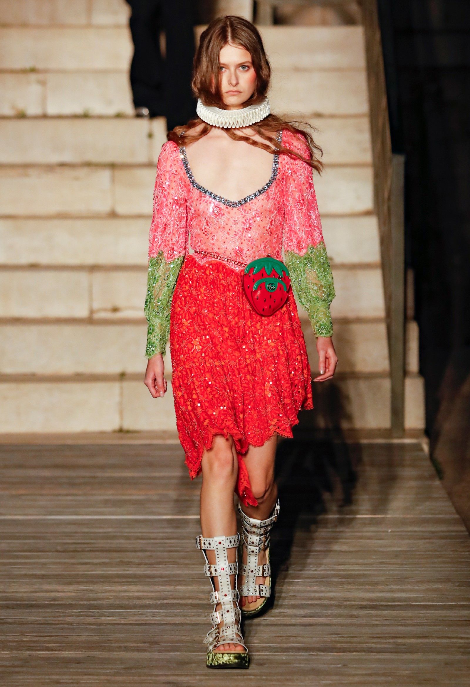 È chiaro, potremmo aggiungere, che Michele si è trovato pienamente a suo agio nel creare questa nuova collezione, sbizzarrrendosi insieme al suo team per esplorare non solo location diverse ma anche messe in scena spettacolari – che sono poi il fondale migliore per lo specifico tipo di reverie in cui Michele si è specializzato. Questa collezione, ad esempio, proprio come Gucci Love Parade, possedeva un respiro più ampio, un numero di look superiore al centinaio e un qualcosa di monumentale: tutti segni di una fantasia che si realizza non solo per merito della collezione in sé, ma anche della location, della vision che la ispira, della sintonia delle tanti parti mobili che stanno dietro al “momento” dello show come punto più alto della comunicazione/espressione del brand. Parlando con WWD, Michele ha paragonato la moda a «un grande coro», un richiamo alla collettività, ai vari elementi che, per citare il salmo, convenerunt in unum – esattamente come i molti astri diversi che compongono la medesima costellazione.