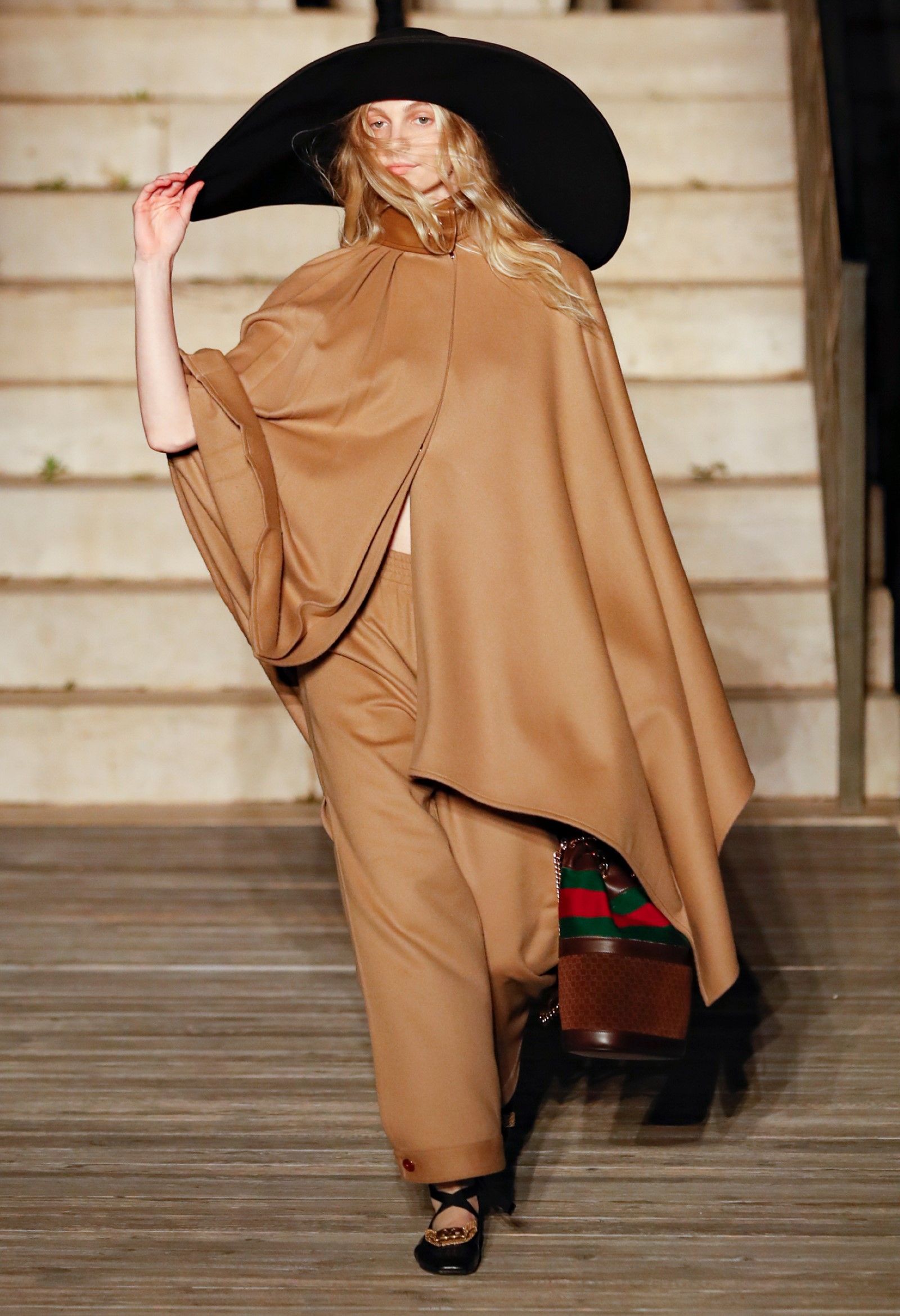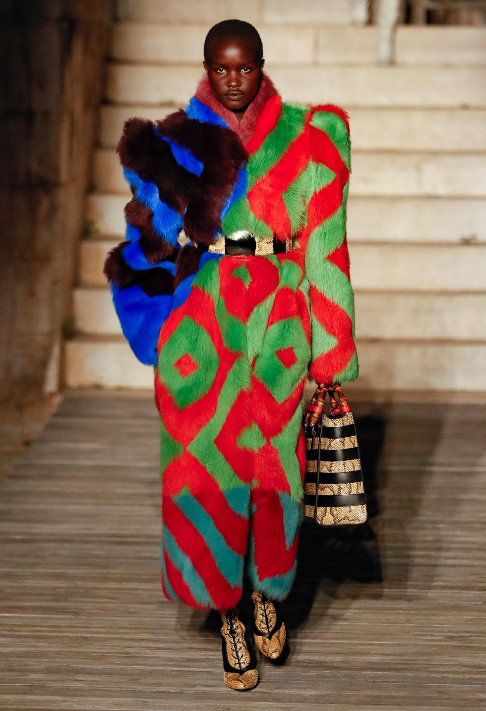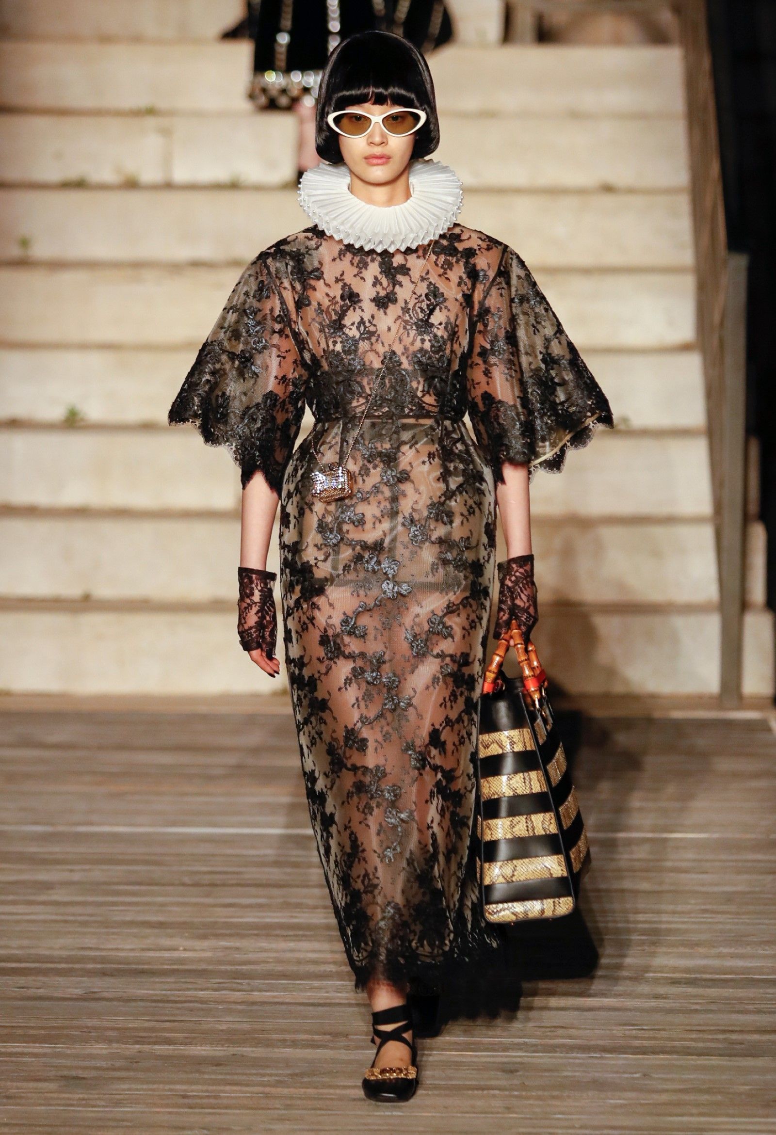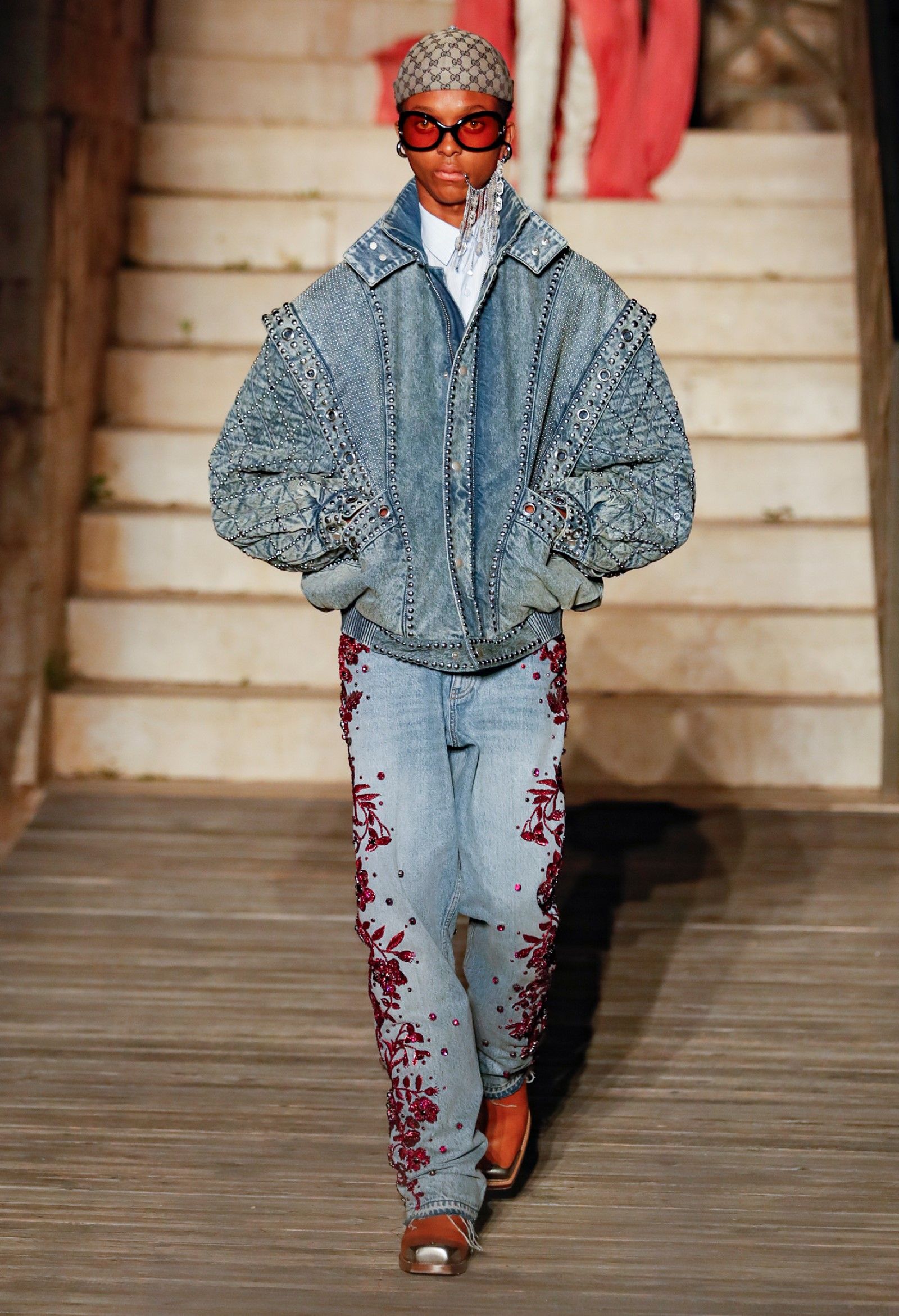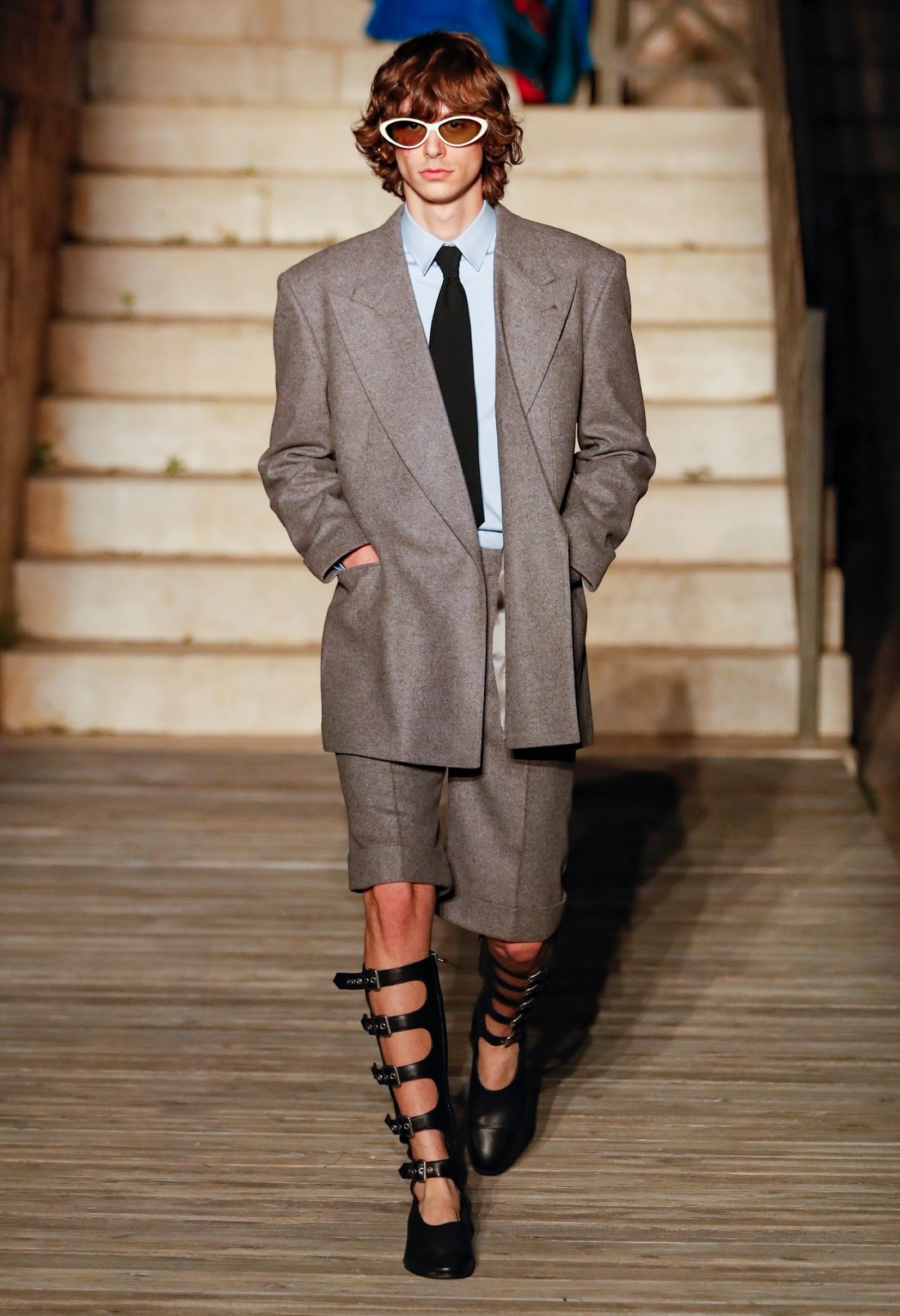 È chiaro, potremmo aggiungere, che Michele si è trovato pienamente a suo agio nel creare questa nuova collezione, sbizzarrrendosi insieme al suo team per esplorare non solo location diverse ma anche messe in scena spettacolari – che sono poi il fondale migliore per lo specifico tipo di reverie in cui Michele si è specializzato. Questa collezione, ad esempio, proprio come Gucci Love Parade, possedeva un respiro più ampio, un numero di look superiore al centinaio e un qualcosa di monumentale: tutti segni di una fantasia che si realizza non solo per merito della collezione in sé, ma anche della location, della vision che la ispira, della sintonia delle tanti parti mobili che stanno dietro al “momento” dello show come punto più alto della comunicazione/espressione del brand. Parlando con WWD, Michele ha paragonato la moda a «un grande coro», un richiamo alla collettività, ai vari elementi che, per citare il salmo, convenerunt in unum – esattamente come i molti astri diversi che compongono la medesima costellazione.