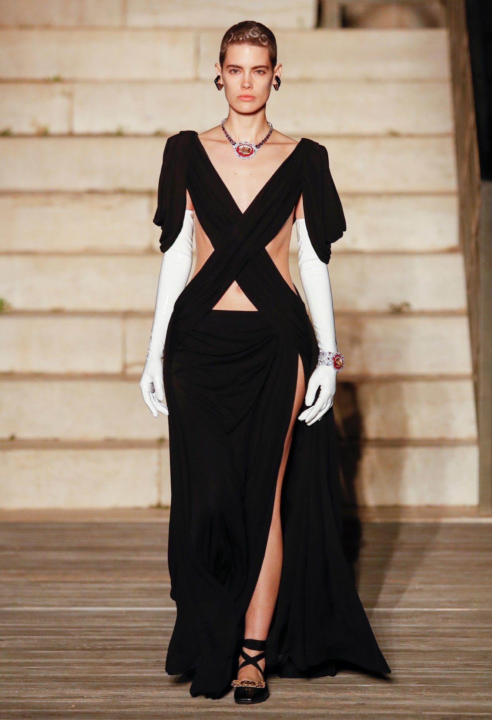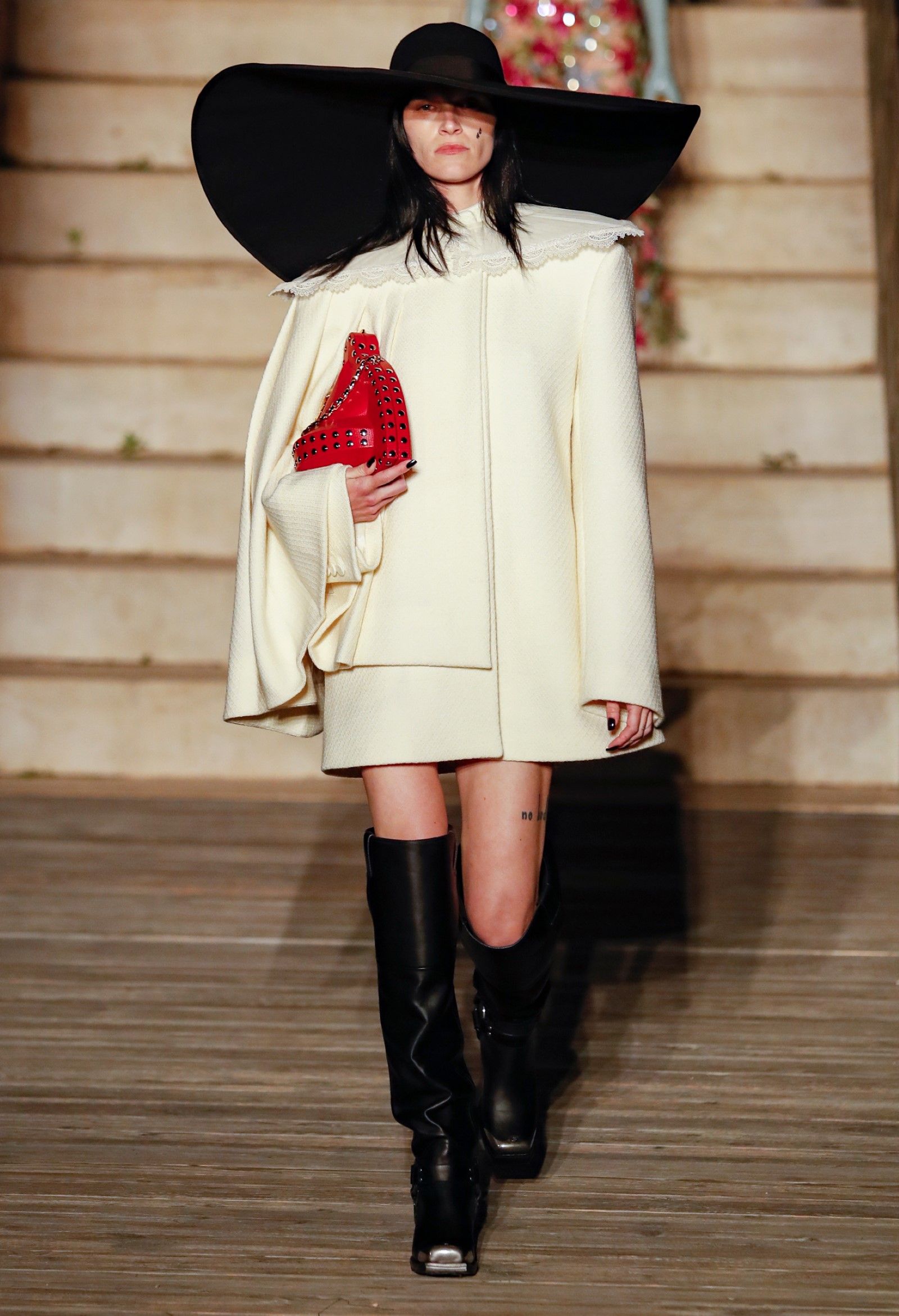 Un Castel del Monte ricoperto di stelle e comete, sotto un plenilunio che illuminava le campagne pugliesi, è stato il fondale dello show Gucci Cosmogonie, la collezione SS23 di Gucci, sulla cui front row sedevano un numero imprecisato di star, da Lana del Rey, ai Maneskin, passando per Mark Ronson e Alessandro Borghi. L’invito della collezione, che includeva un disegno delle fasi lunari e il certificato di adozione di una stella, faceva presagire un tema astronomico o esoterico. Le show notes invece hanno utilizzato il senso della parola “costellazione” nel senso semiotico del termine – ossia quello di connessione in un unico disegno coerente di punti solo in apparenza separati tra loro. Su questo tema si è costruito il discorso delle show notes, che hanno recuperato la vicenda del filosofo suicida Walter Benjamin e di Hanna Arendt, creando un parallelismo tra il primo e Alessandro Michele – entrambi «pescatori di perle», entrambi eclettici citazionisti, compilatori di references che, messe tutte insieme, creano un mondo. E così è stata la collezione che, lungi dal legarsi al tema medievale della location o a quello astronomico del cielo stellato, ha invece sfruttato il set onirico di Castel del Monte, le fumate drammatiche, le luci e i suoni per creare una sorta di surreale carosello in cui apparivano visioni di creature fantatiche, il cast immaginario di un’epica pièce teatrale o, come dicono le show notes, «inedite configurazioni di realtà capaci di rompere i vincoli della tradizioni».