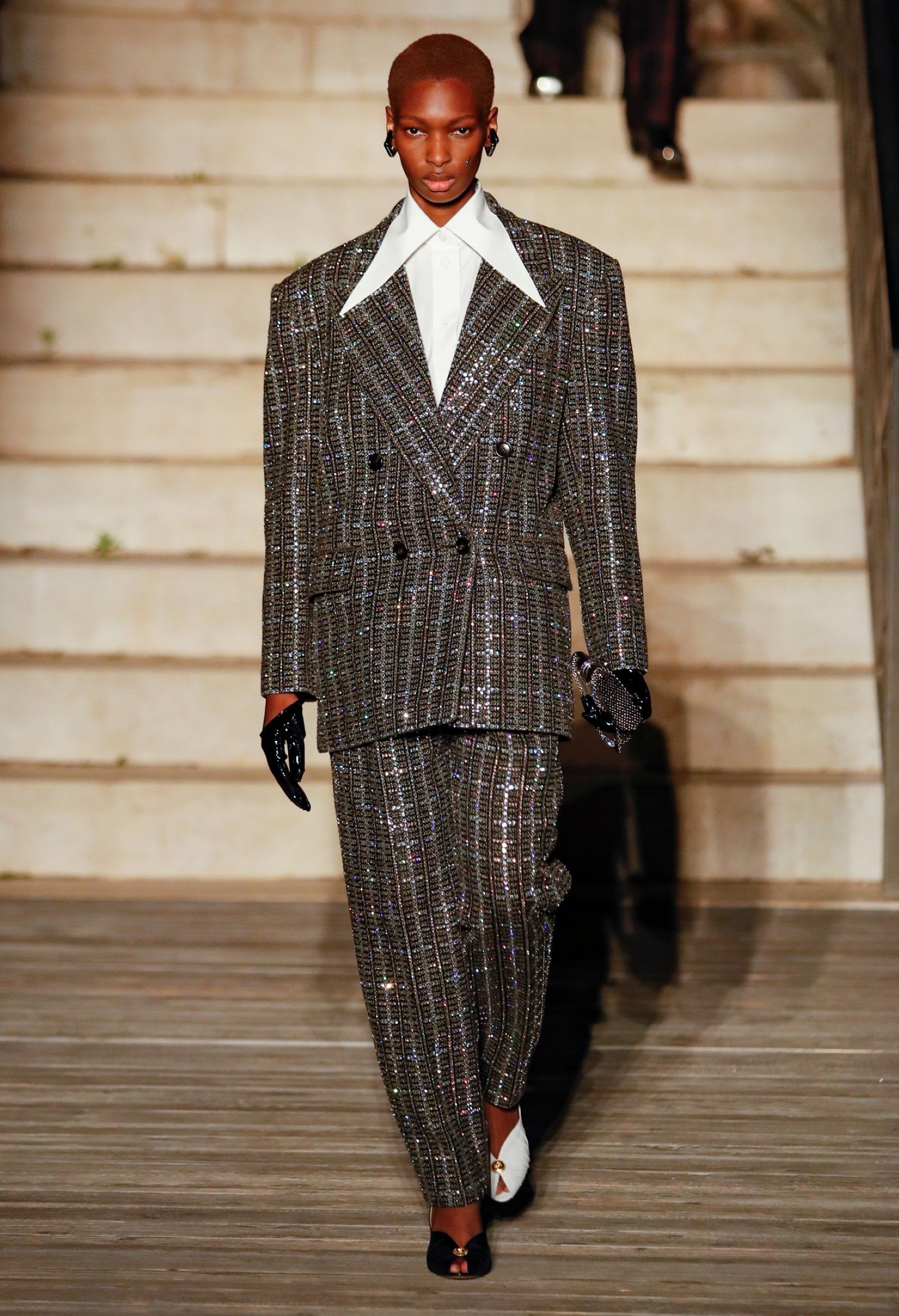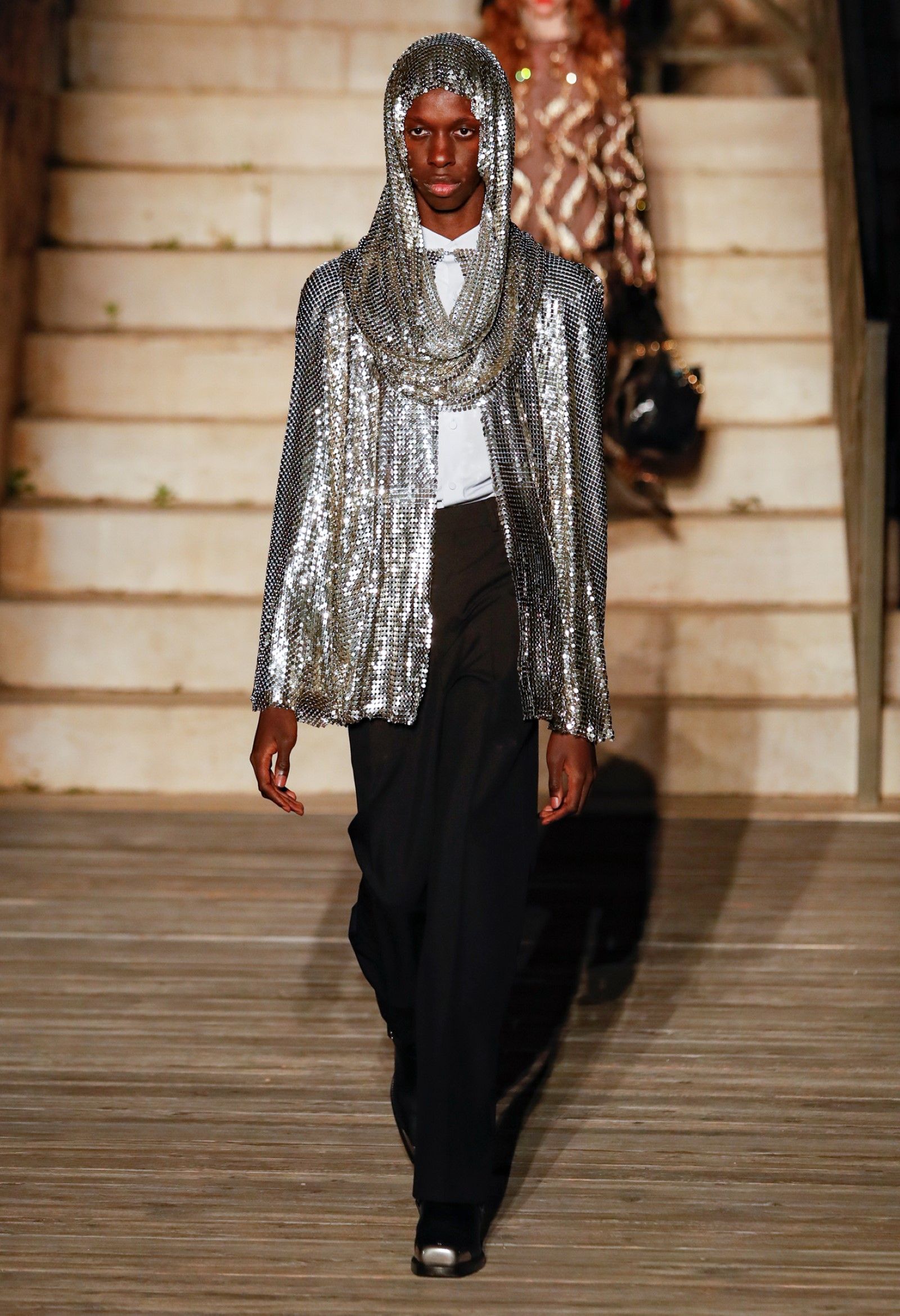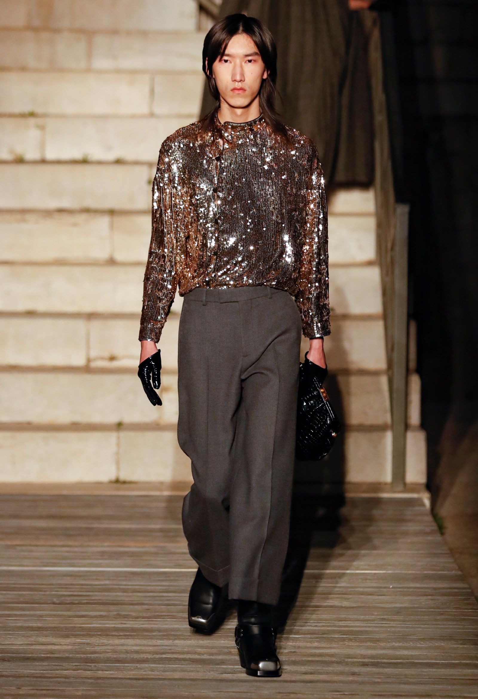 C’erano anche reference che traducevano in termini più letterali il tema visivo/discorsivo della costellazione, ricoprendo giacche, completi e jeans di ricami cristallini e scintillanti paillettes culminando con il ventesimo look, che includeva un cappotto con orli di ECOpelliccia su cui le costellazioni erano ricamate in cristalli. Un altro, il settantaduesimo, trasformava i cristalli in grandi placche che decoravano un completo color oro scintillante che pareva riferirsi tanto ai completi di tweed francesi che a un barbarico costume longobardo. Citazioni a parte, proprio in questa sfilata più che in altre, emergeva evidente e priva di sbavature a la stratificazione delle citazioni e delle reference che ispiravano Michele – citazioni così disparate tra loro che la loro unione sotto la stella dell’immaginazione del designer romano il cui processo creativo diventa sempre più lucido e sognante, sempre più preciso nell’evocare un mood (anzi, evocarne molteplici) per condensarli in una fantasia che, proprio come le costellazioni che ispirano la collezione, evoca immagini e mitologie che prima non c’erano.