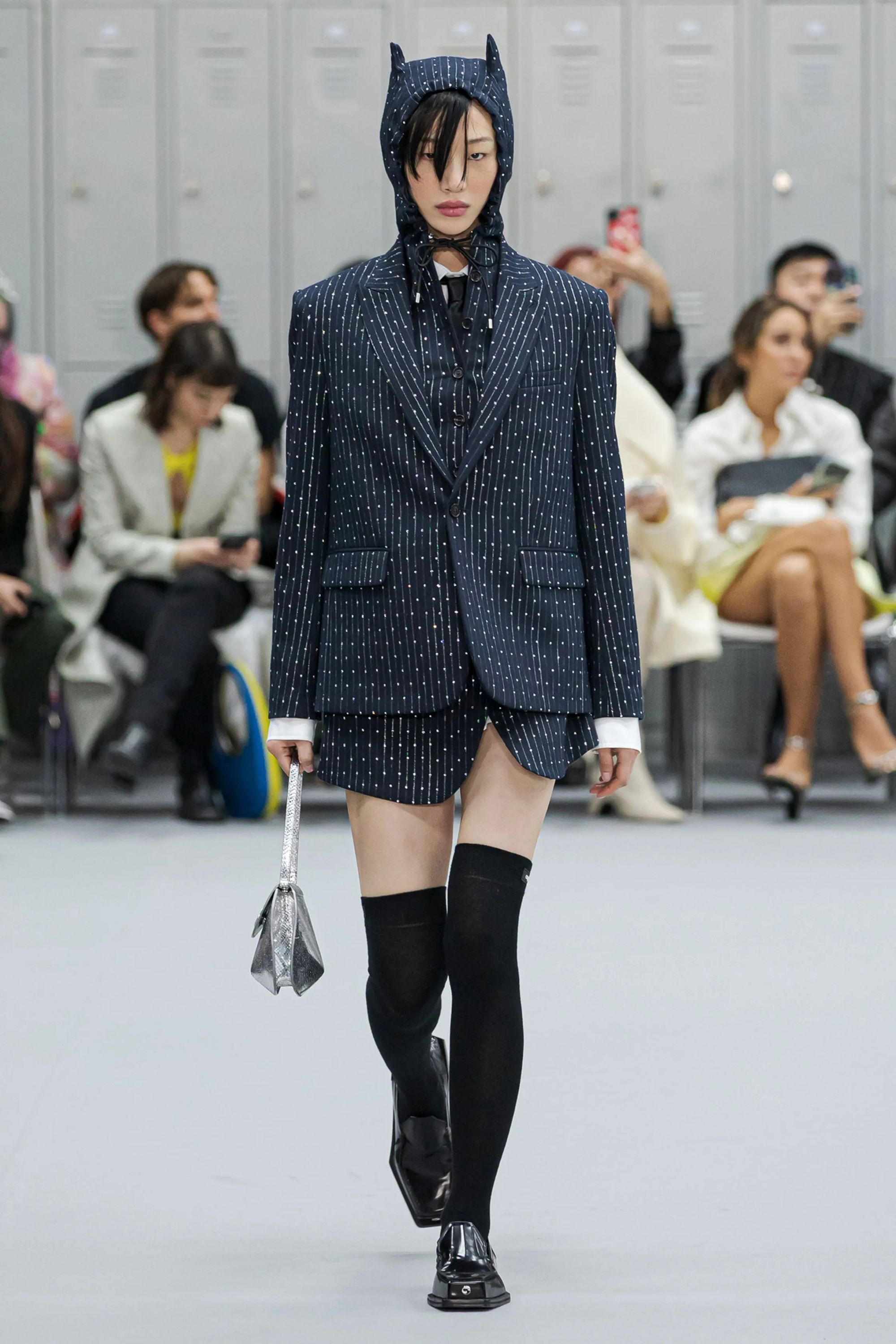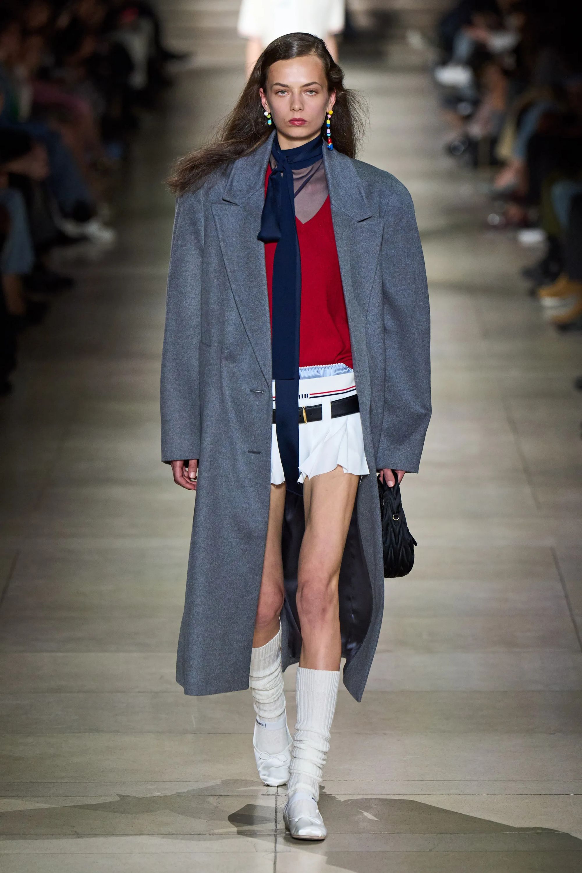 O ancora, e forse in maniera ancora più incisiva, il lavoro di Thom Browne ha fatto sì che il preppy e l’uniforme scolastica diventassero il core di un’estetica in grado di rendere sovversivo il mood di uno studente qualunque alle prese con libri, matite e lezioni più o meno noiose. Per una strana affinità con l’ingenuità tipica della ribellione, la moda ha trovato un punto di contatto con tutto ciò che è associato alle questioni giovanili in senso lato. Da qui il successo di serie tv come Gossip Girl i cui protagonisti, per potere resistere all’interno di uno scenario scolastico fortemente classista e appagato solo in superficie da un lifestyle improntato sul glamour più sfrenato dell’Upper East Side, dovessero personalizzare la propria divisa scolastica. Dal 2021 la moda ha iniziato così ad attingere prepotentemente alla prima decade degli anni 2000, innescando una serie di riflessioni solo in parte sovrapponibili con un effetto throwback Y2K. Soprattutto quando, di fronte alla SS22 di Miu Miu, siamo tutti rimasti affascinati dalla semplicità con cui Miuccia Prada sia riuscita a prendere coscienza del fatto che ci fosse bisogno di un’uniforme frammentaria, leggera e spigolosa per potere reggere il confronto con il presente. Quelle minigonne striminzite con maglioni cropped letteralmente tagliati hanno fatto sì che il concetto di uniforme fosse tradotto in un abito feticcio non privo di contraddizioni. L’operazione di revisione dell’uniforme si è ulteriormente sviluppata e ha raggiunto forse piena maturità nella collezione Miu Miu AW22, distaccandosi però dall’idea di scolaretta collegiale cattolica e portando in scena una divisa più vicina alla tenuta da tennis.