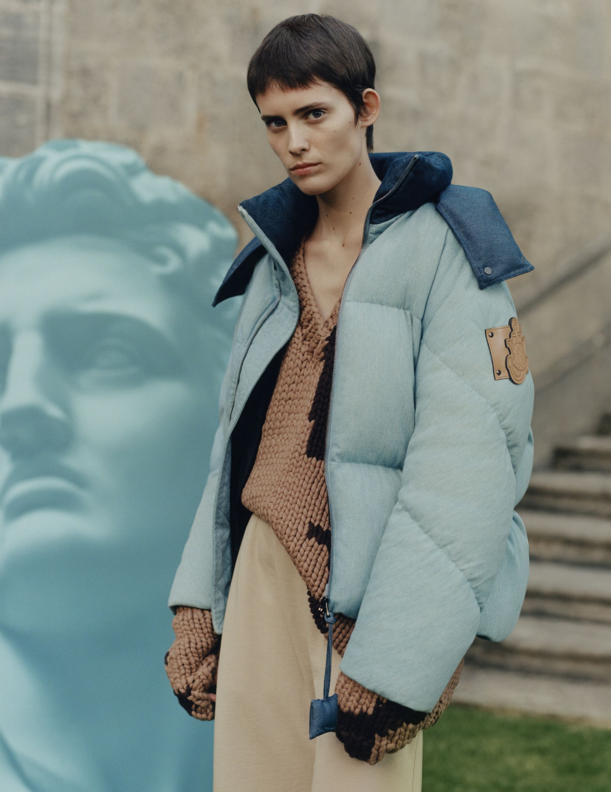 I colori esplodono in motivi quasi primitivi, pois “spray” di diverse grandezze, onde a spirale e macchie di colore, interpretati sulle stampe dei tessuti e dei filati stampati e sulle intessiture jacquard dei maglioni spessi e avvolgenti. La speciale tintura invece conferisce ai capispalla un effetto irregolare, aggiungendo un ulteriore elemento di stimolazione visiva e materica. L'intensità dei colori - con sfumature di giallo, verde, azzurro, rosa confetto, blu elettrico, marrone e corallo – svela opacità attraverso i cotoni lavati e il denim, che vengono mixati con il nylon e i tessuti tecnici di Moncler. Infine le finiture dry conferiscono ricchezza e profondità alle superfici esaltando al massimo i colori. L’idea di imbottitura e di oversize caratterizza gli accessori, dalle tote-bag capienti alle slide con intrecci tubolari, dai Chelsea boot con dettagli in bouclé ai cappellini crochet.