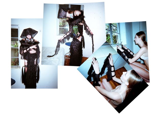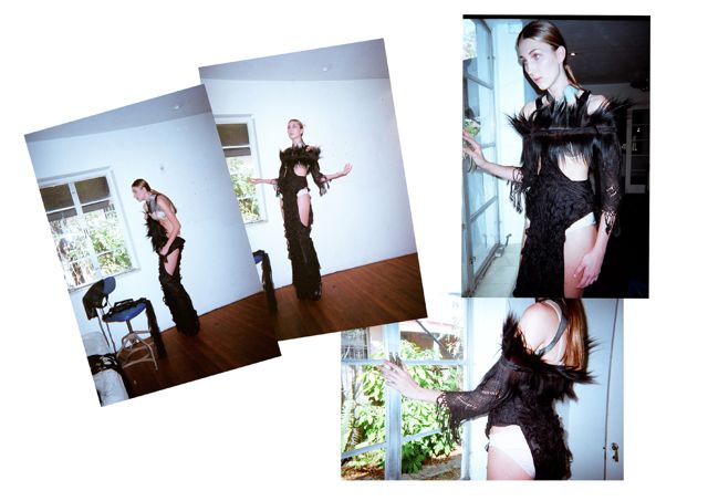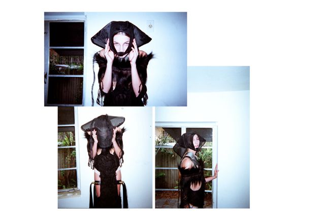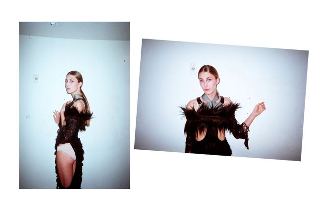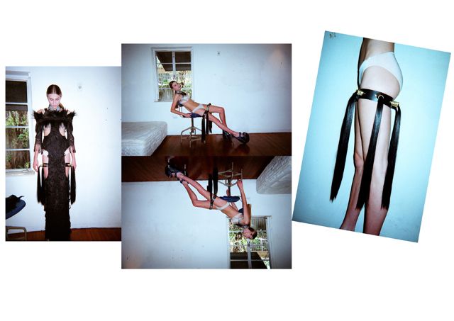 Un Self-Portrait is the latest creative project of designer Gabriella Marina Gonzalez. American born, Gabriella grew up in Miami with a Cuban father and Italian mother, and after graduating from Central Saint Martens in 2009, she based her life and work in London, where she immediately gained the attention of the English press. Her eccentric works approach in a very artistic way the fetish aesthetic, focusing on the use of leather to realize structured accessories and pieces that look like orthopedic splints. Gonzalez's imaginary is full of macabre and hard-core references, tell through a dramatic poetry, which is filtered by her extremely suggestive creations. "Un Self Portrait" was designed, hand made and shot by the designer while traveling abroad in the United States. Each element traps a memory, which becomes a sort of concrete thing. Gathering the encounters one experiences while traveling and interpreting them into individual pieces inspired the collection. The materials were sourced in a similar manner, picked up along the way by Gabriella herself. The collection includes vintage monkey fur reassembled from a 1920’s coat to form part of the showpiece dress. In the designer’s signature style, shredded silk appliqué was made from discontinued chiffon. Vinyl from a 1950’s table cover manufacturer’s dead stock was used to create metal like tubes and a new take on the GMG harness. Silk rope from home decor was used to create luxury straps on high gloss wooden platform shoes. The cloth's appeal breaks any rules, causing a strong visual impact on the viewer. Complex and excessive, Gabriella Marina Gonzalez' s pieces seem to be designed for a tribe of post apocalyptic freaks, awaking also the interests of common people through their mad uniqueness.