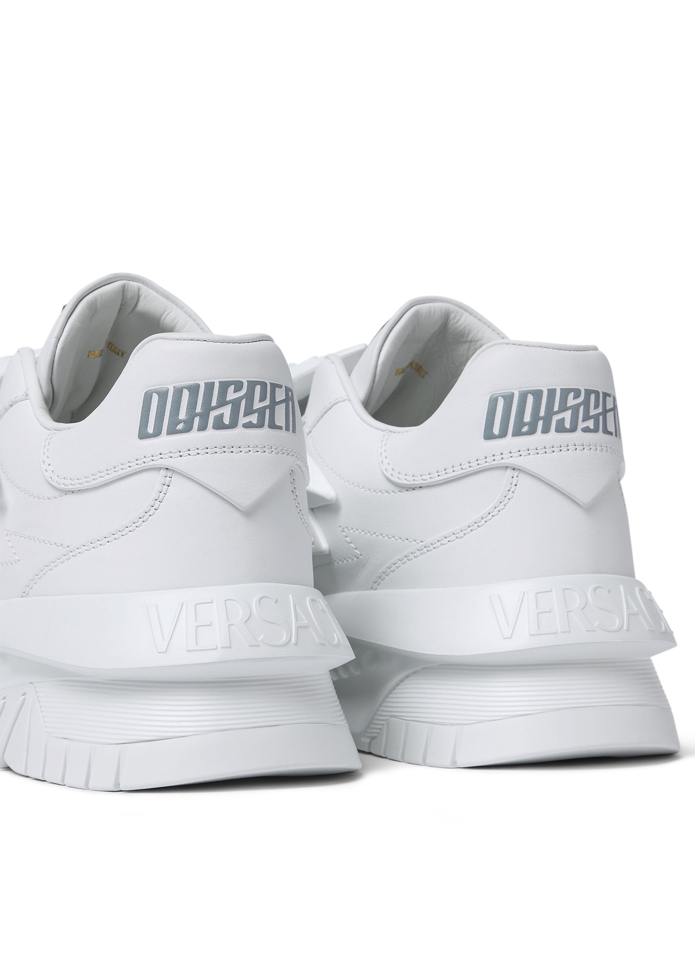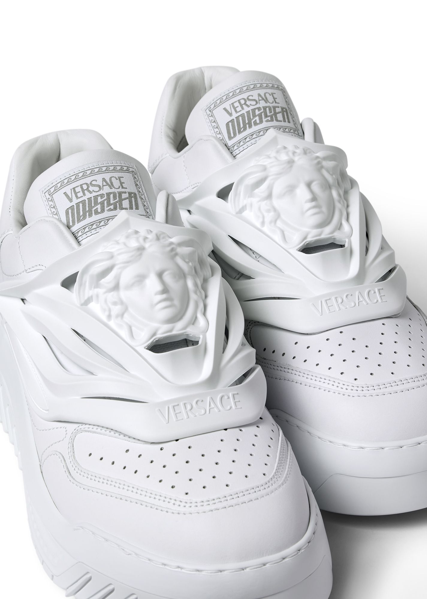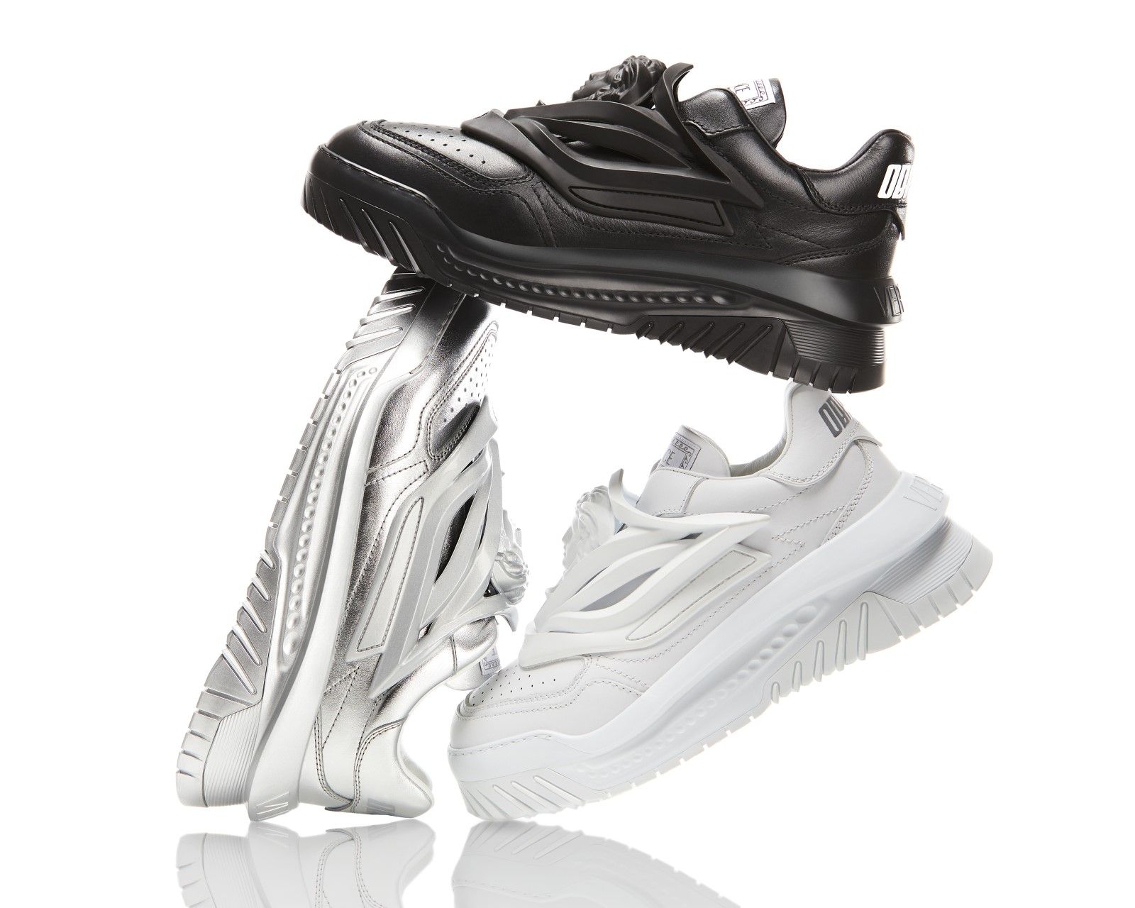 L’idea alla base del suo design è quella del dinamismo totale – idea abbastanza appropriata per una sneaker, che viene evocata tramite gli elementi strutturali in gomma integrati alla classica tomaia in pelle. Il principale di questi, oltre che il più vistoso, è sicuramente la Medusa 3D che definisce l’estetica dell’intera silhouette. Altro importante elemento strutturale è la midsole, che presenta una struttura sporgente che si allunga sul tallone, ricordando l’alettone di un’auto da corsa, e che reca il branding di Versace inciso sopra. Il motivo visivo della strutturazione architettonica prosegue per tutta la suola percorsa da scanalature. La tomaia in pelle, invece, segue lo stile delle sneaker da basket, con il puntale forato e una heel tab su cui è scritto il lettering “Odissea” che viene ripetuto anche sulla linguetta al di sotto del branding. Tutti i diversi elementi della sneaker sono armonizzati dalla colorway monocromatica di cui sono presenti sei diverse sfumature: nero, bianco, blu oltremare, rosa, marrone e argentato.