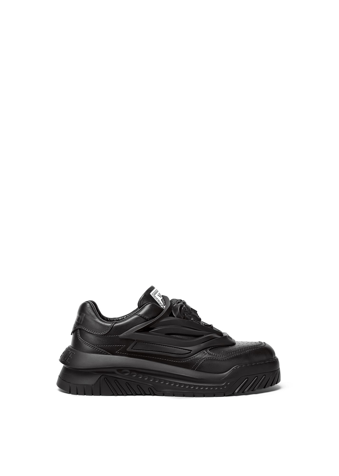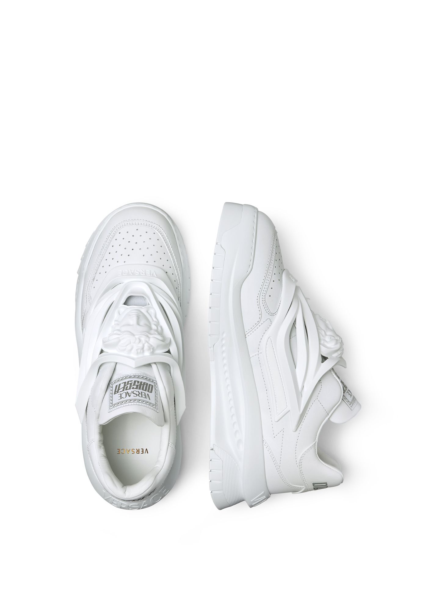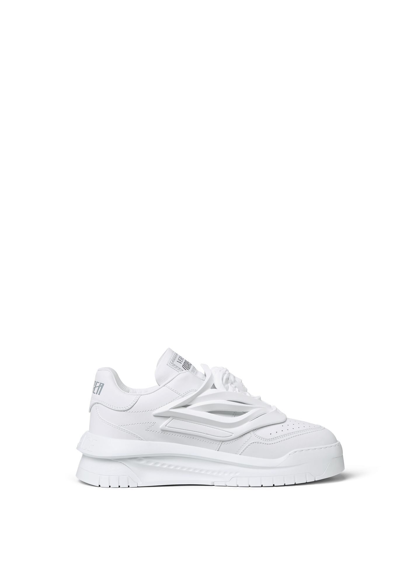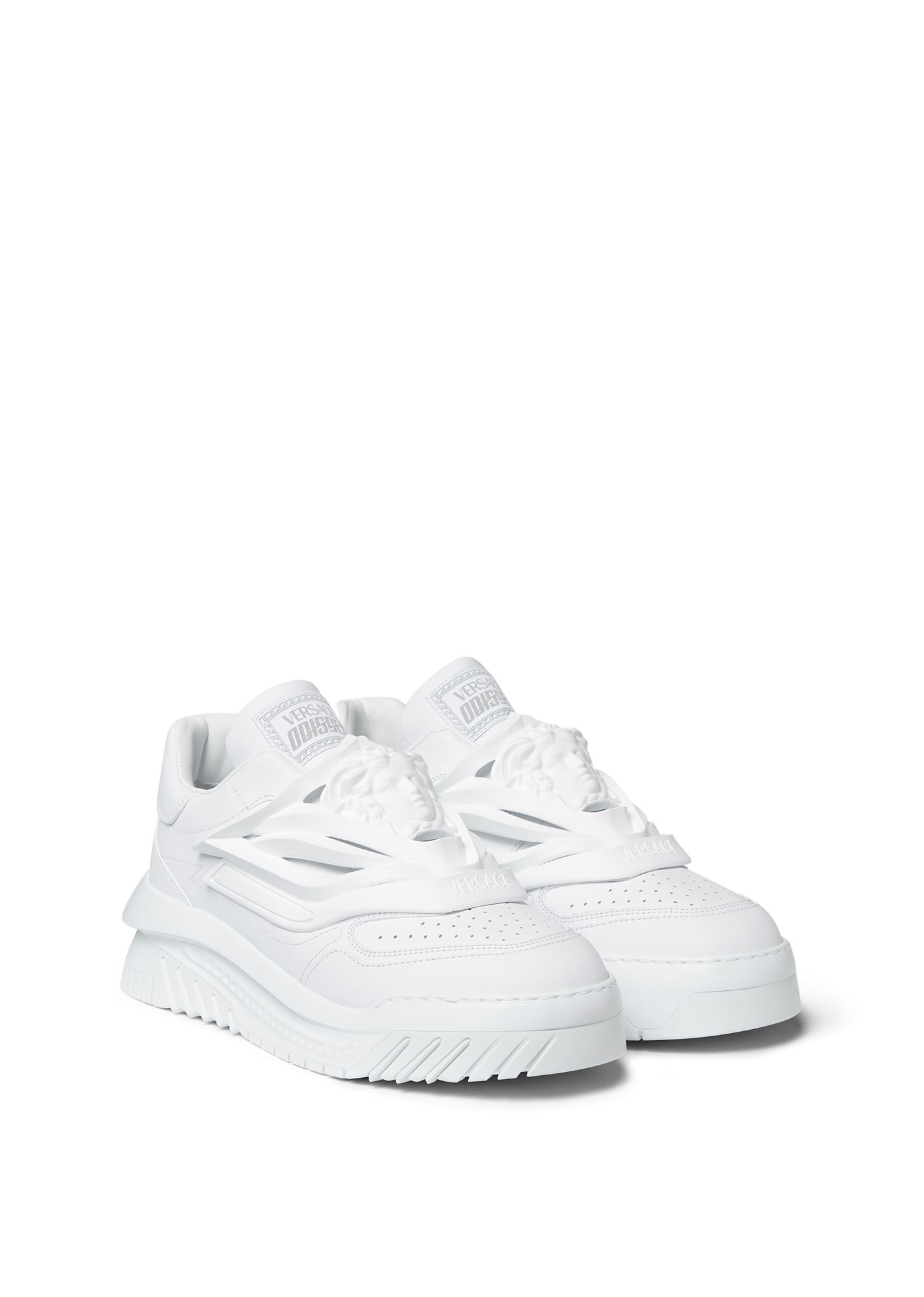 L’idea alla base del suo design è quella del dinamismo totale – idea abbastanza appropriata per una sneaker, che viene evocata tramite gli elementi strutturali in gomma integrati alla classica tomaia in pelle. Il principale di questi, oltre che il più vistoso, è sicuramente la Medusa 3D che definisce l’estetica dell’intera silhouette. Altro importante elemento strutturale è la midsole, che presenta una struttura sporgente che si allunga sul tallone, ricordando l’alettone di un’auto da corsa, e che reca il branding di Versace inciso sopra. Il motivo visivo della strutturazione architettonica prosegue per tutta la suola percorsa da scanalature. La tomaia in pelle, invece, segue lo stile delle sneaker da basket, con il puntale forato e una heel tab su cui è scritto il lettering “Odissea” che viene ripetuto anche sulla linguetta al di sotto del branding. Tutti i diversi elementi della sneaker sono armonizzati dalla colorway monocromatica di cui sono presenti sei diverse sfumature: nero, bianco, blu oltremare, rosa, marrone e argentato.