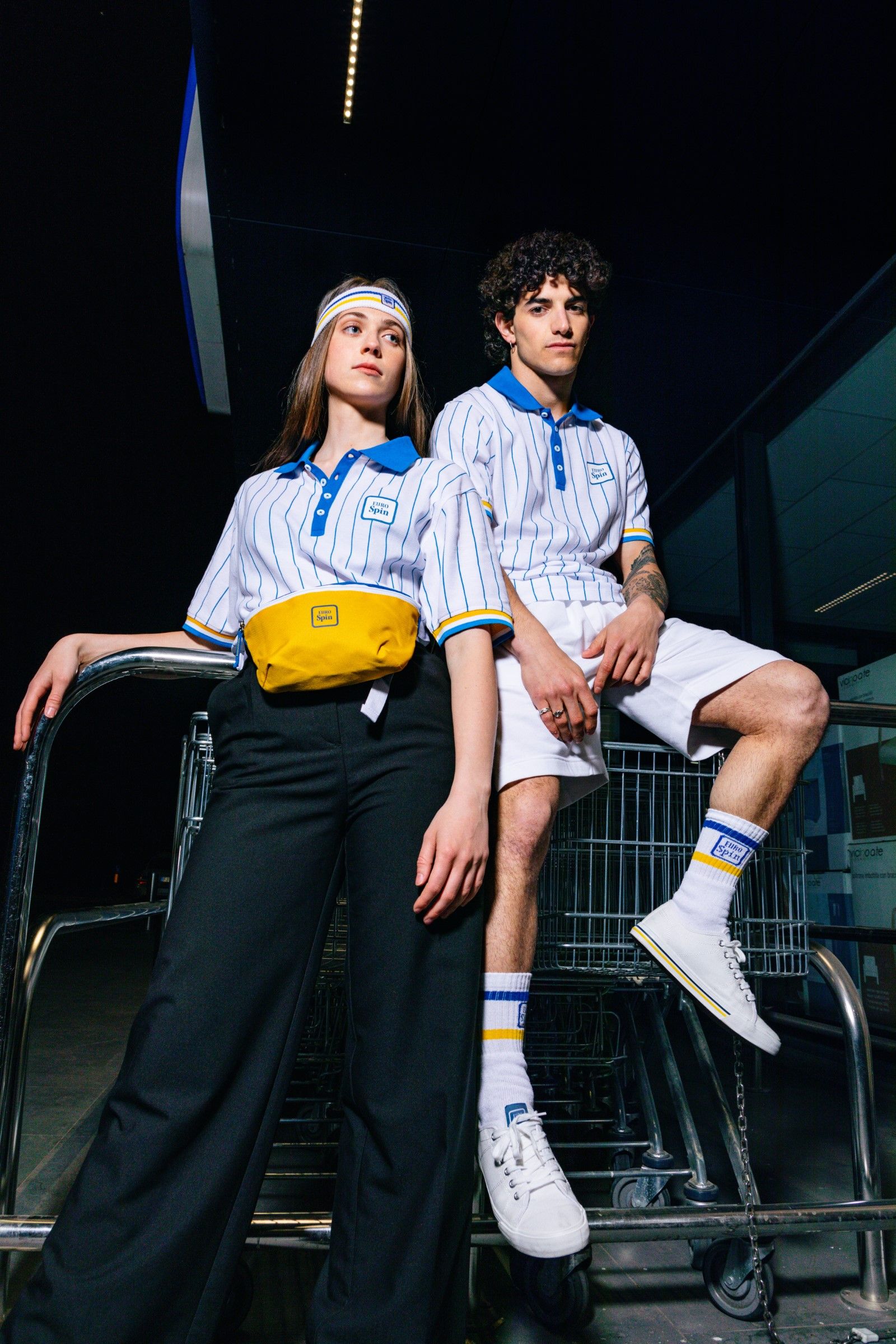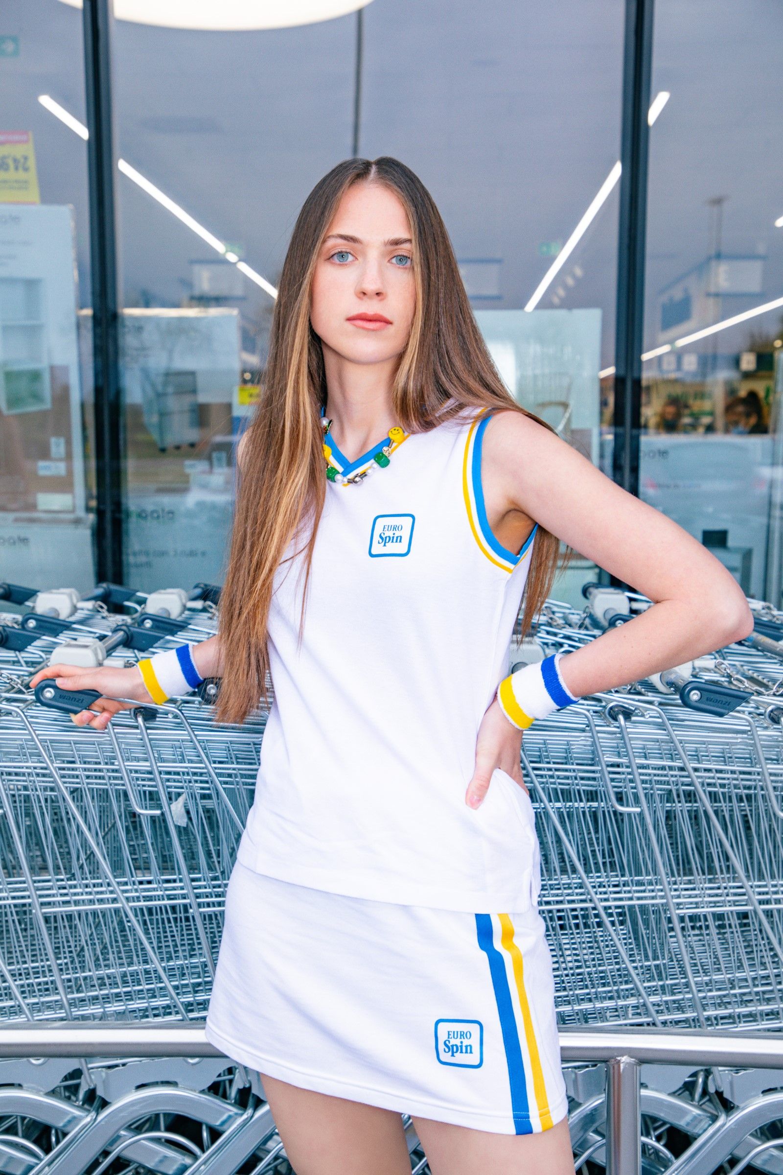 La capsule, interamente genderless e ispirata ai classici set da tennis anni ’80, include polo e t-shirt, set di pantaloncini e track jacket, gonne e reggiseni sportivi, una sneaker oltre che accessori come marsupi, headband e calze. Ma non mancheranno, anche per le occasioni più speciali, pezzi di underwear come perizomi e boxer da uomo. L’idea alla base è capovolgere il concetto di aspirazionalità della moda “tradizionale” sostituendolo con quello della rappresentazione: è chiaramente autoironico sfoggiare una polo con il branding di una catena di discount della grande distribuzione organizzata – eppure rimane vero che proprio un'azienda di questo tipo può essere più presente nella vita quotidiana di milioni di persone (e dunque nella cultura pop di interi paesi o continenti) in maniera molto più capillare di qualunque altro brand di moda tradizionale. Proprio per rivendicare il proprio peso nella pop culture italiana Eurospin renderà la sua capsule protagonista di una sfilata che si svolgerà a sorpresa proprio in uno dei punti vendita italiani della catena. È impossibile dimenticarsi l’arrivo di Eurospin nella provincia italiane nei primi anni 2000, nel giro di pochi anni quei punti vendita per lo più anonimi ma dall’inconfondibile logo blu e giallo divennero una presenza fissa per un numero incalcolabile di città italiane. Il risultato fu qualcosa di inedito: arrivato in Italia agli albori di Internet e dei social media, Eurospin entrò nel mondo dei meme online trasformandosi in una sorta di icona nazional-popolare in cui tutti si riconoscevano, una presenza proverbiale nella pop culture italiana degli anni 2000. Non è un caso se la più eclatante apparizione della capsule è stata indosso a Fedez nel suo podcast di culto Muschio Selvaggio.