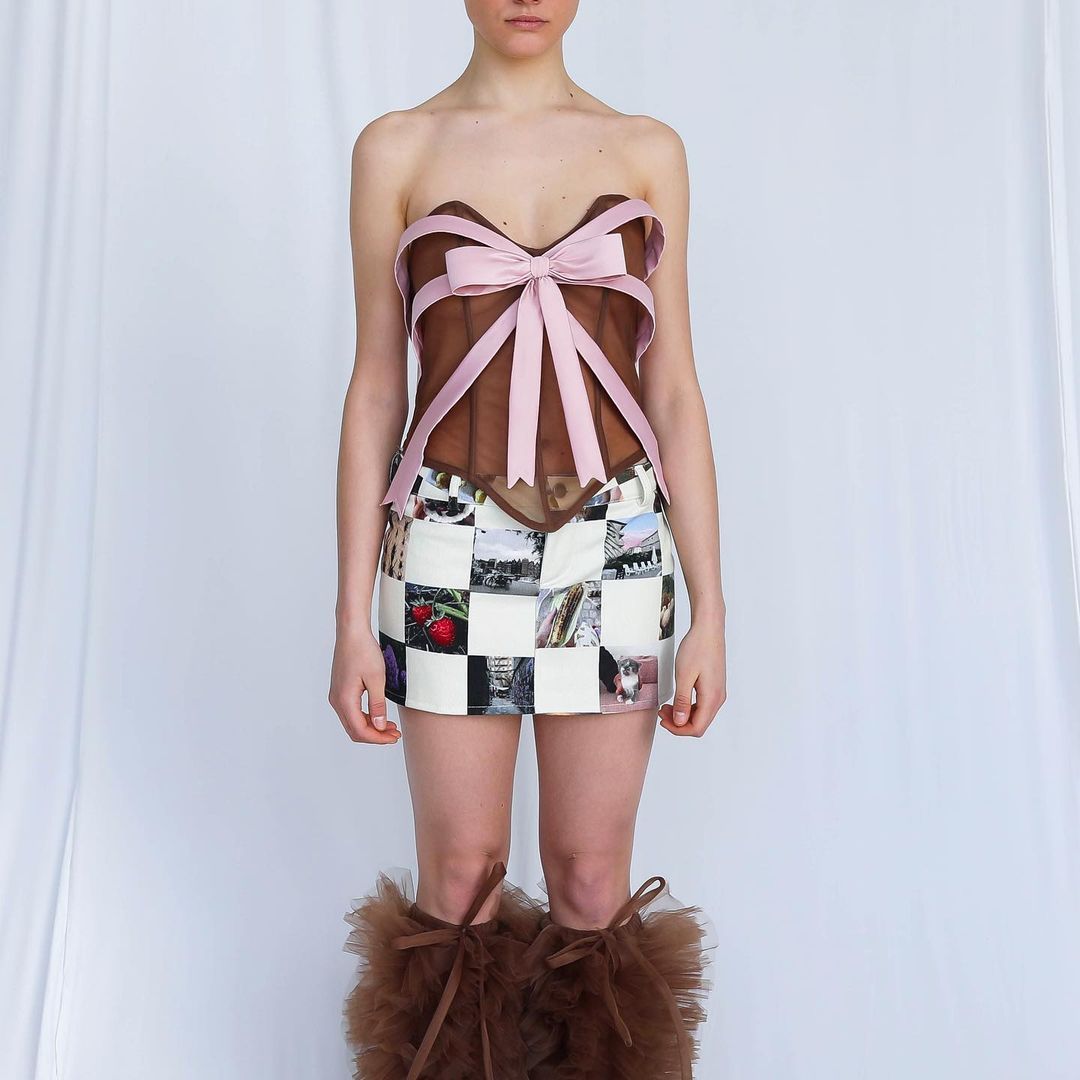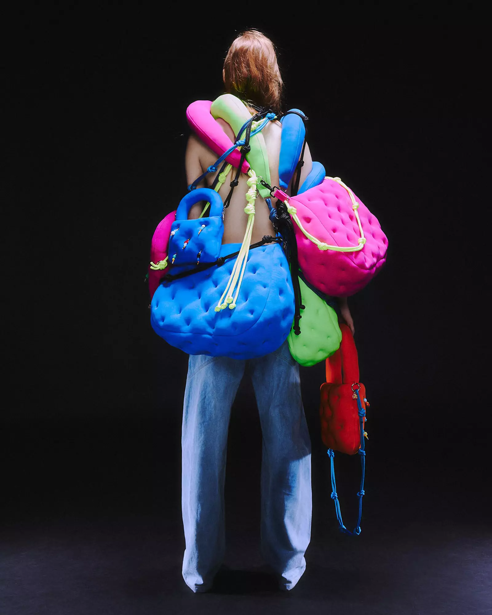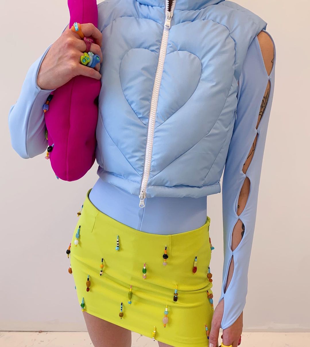 Lo stilista di Brooklyn, che si è trasferito da Denver per studiare al Fashion Institute of Technology, si è rapidamente guadagnato un seguito di culto grazie alle sue borse di peluche con perline di vetro, costantemente sold out sull'e-store, le maglie cut out in tendenza su Ssense e un'estetica massimalista virale sui social. Ha anche sviluppato un vocabolario visivo caratteristico da colori neon, ritagli audaci e maglieria kidcore. Il suo lavoro ha già attirato l'attenzione di celebrità come Miley Cyrus, che di recente ha indossato un completo di perline dello stilista per la sua esibizione alle Backyard Sessions, e Hunter Schafer, che ha indossato la borsa di peluche verde in una recente foto su IG. Un brand che parla direttamente alla Gen Z con capi indossabili nel quotidiano e allo stesso tempo unici nel loro genere.