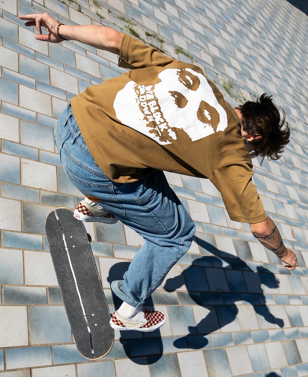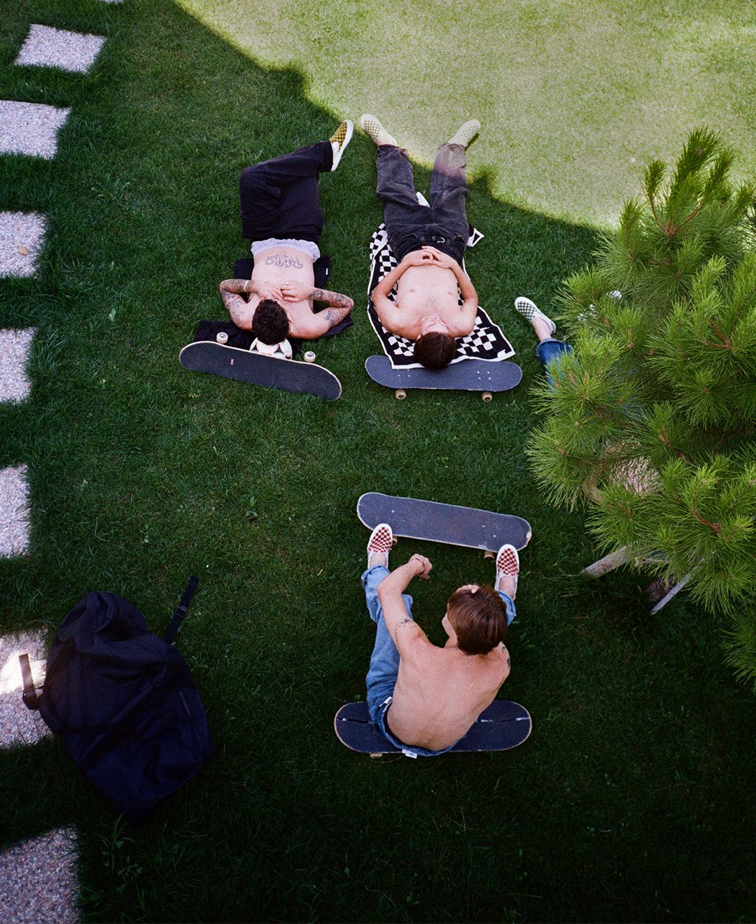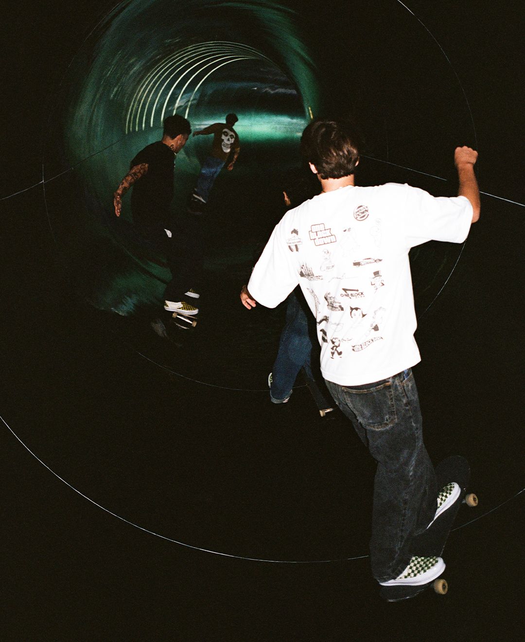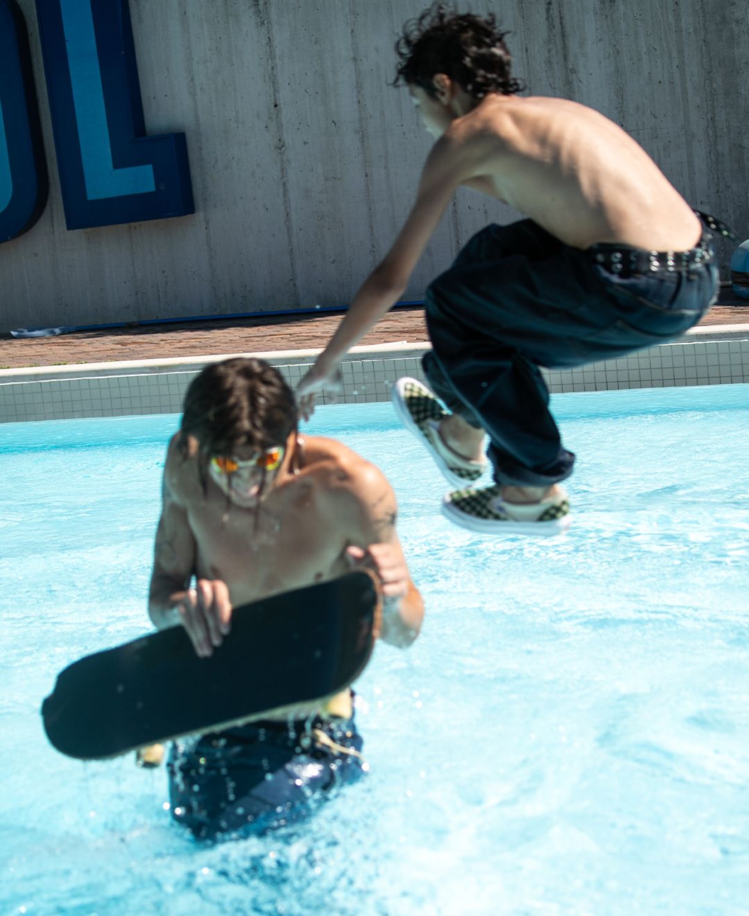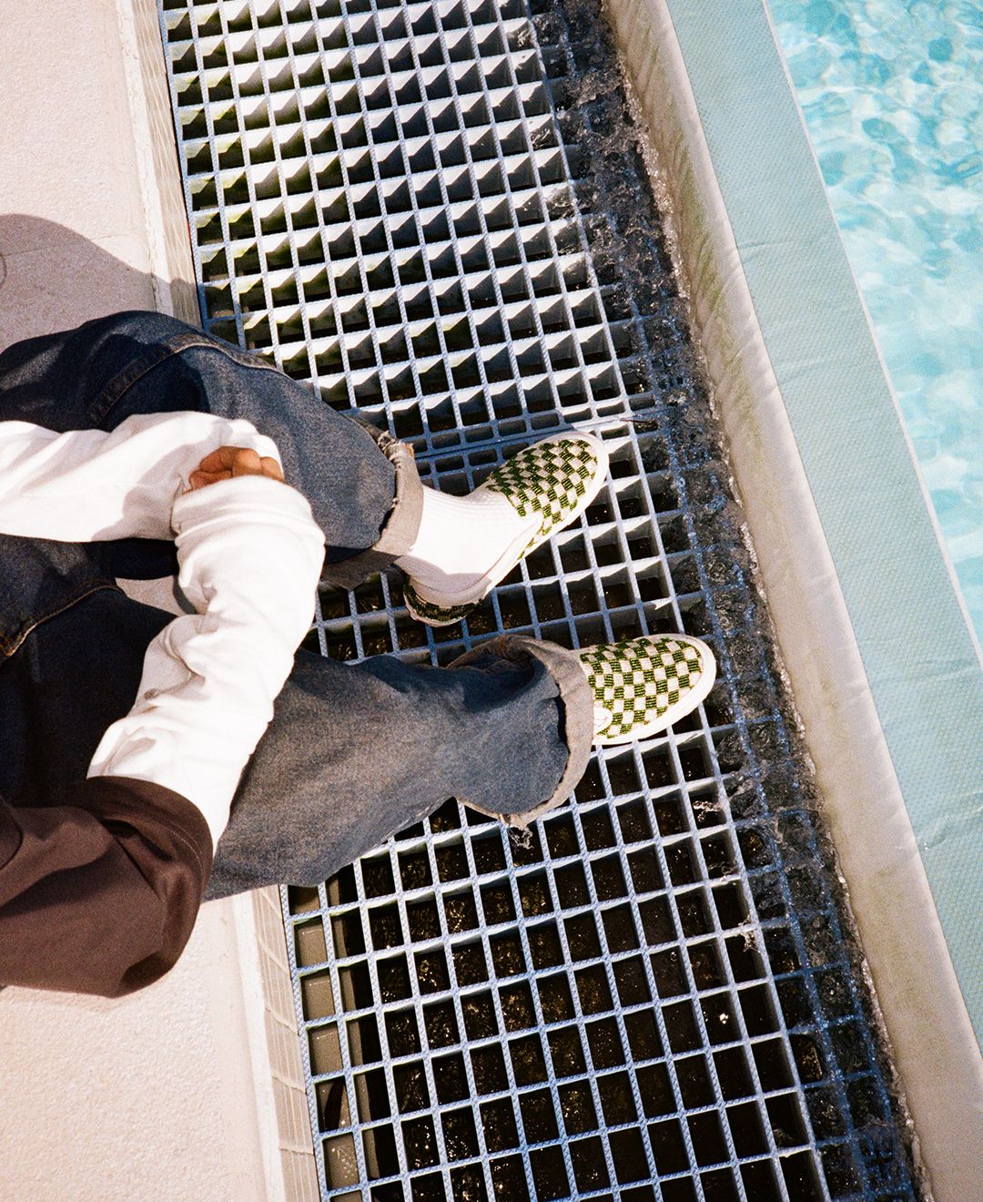 Per il suo ultimo progetto, One Block Down ha esplorato l'impatto di Vans nella storia dello skateboard. Intitolato "Dog Days", il progetto celebra la slip-on a scacchiera del brand californiano, icona onnipresente della scena skate dagli anni '70, quando lo skateboard divenne iper-popolare insieme a tutto il mondo dei surfisti californiani che, dopo una grave siccità che colpì la regione, si intrufolarono nei cortili dei sobborghi per praticare i loro trick nelle piscine prosciugate. Man mano che la disciplina si diffondeva, le Vans divennero parte dell’uniforme degli skater – e specialmente quelle decorate dal motivo a scacchiera, che nacque a partire dalla maniera in cui i giovani skateboarder coloravano le proprie sneaker bianche con il pennarello.