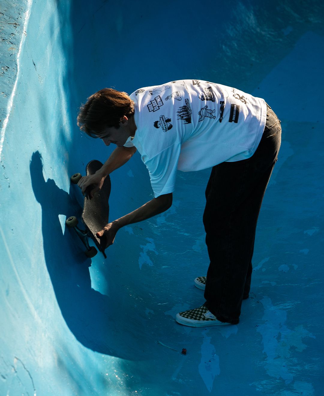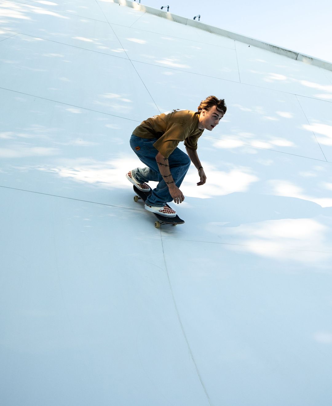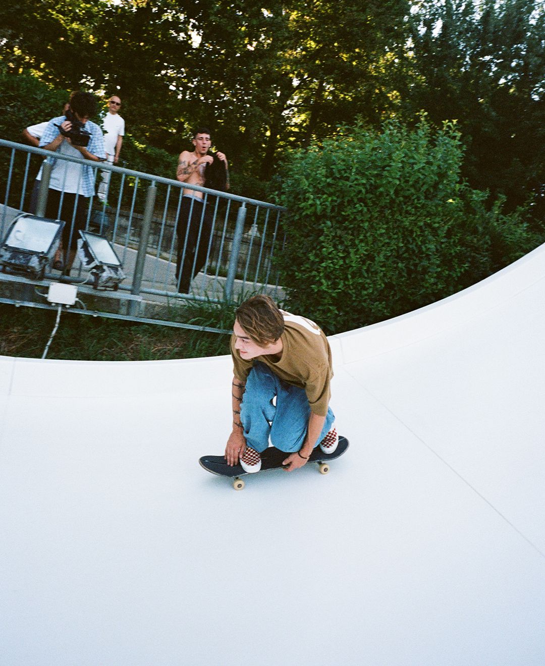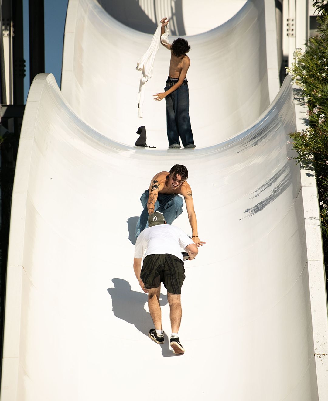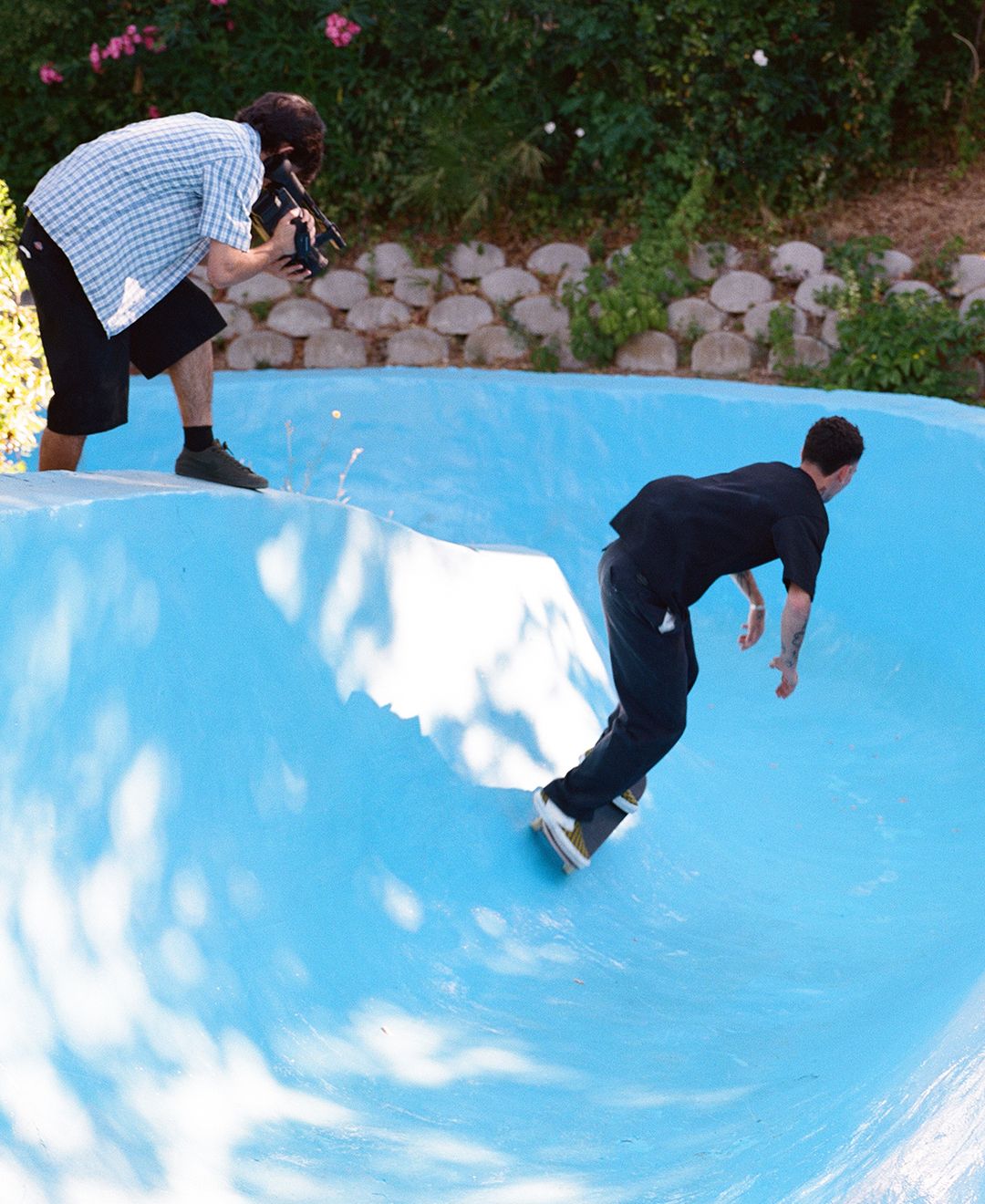 Per il suo ultimo progetto, One Block Down ha esplorato l'impatto di Vans nella storia dello skateboard. Intitolato "Dog Days", il progetto celebra la slip-on a scacchiera del brand californiano, icona onnipresente della scena skate dagli anni '70, quando lo skateboard divenne iper-popolare insieme a tutto il mondo dei surfisti californiani che, dopo una grave siccità che colpì la regione, si intrufolarono nei cortili dei sobborghi per praticare i loro trick nelle piscine prosciugate. Man mano che la disciplina si diffondeva, le Vans divennero parte dell’uniforme degli skater – e specialmente quelle decorate dal motivo a scacchiera, che nacque a partire dalla maniera in cui i giovani skateboarder coloravano le proprie sneaker bianche con il pennarello.