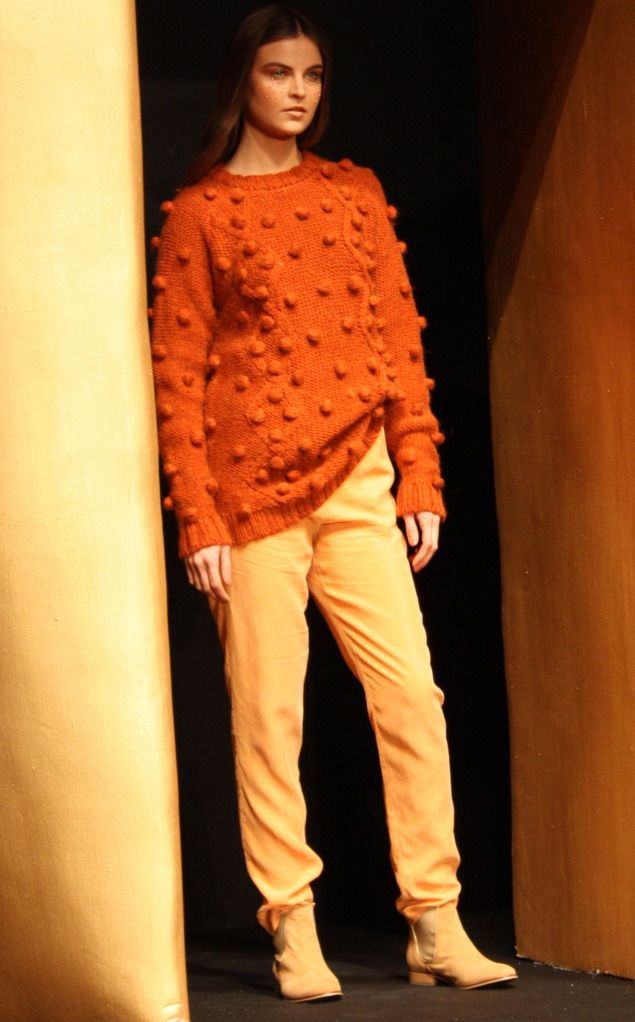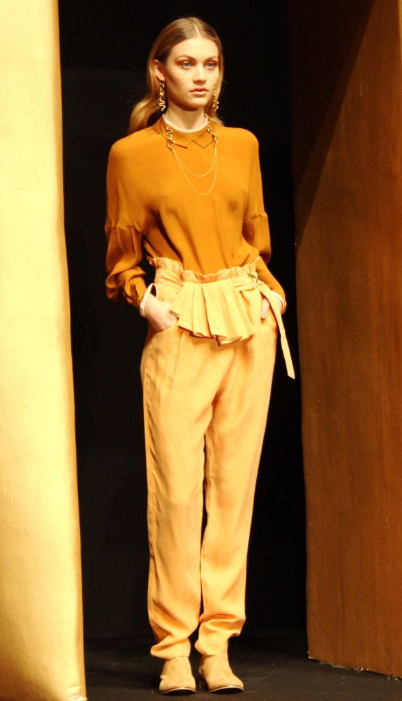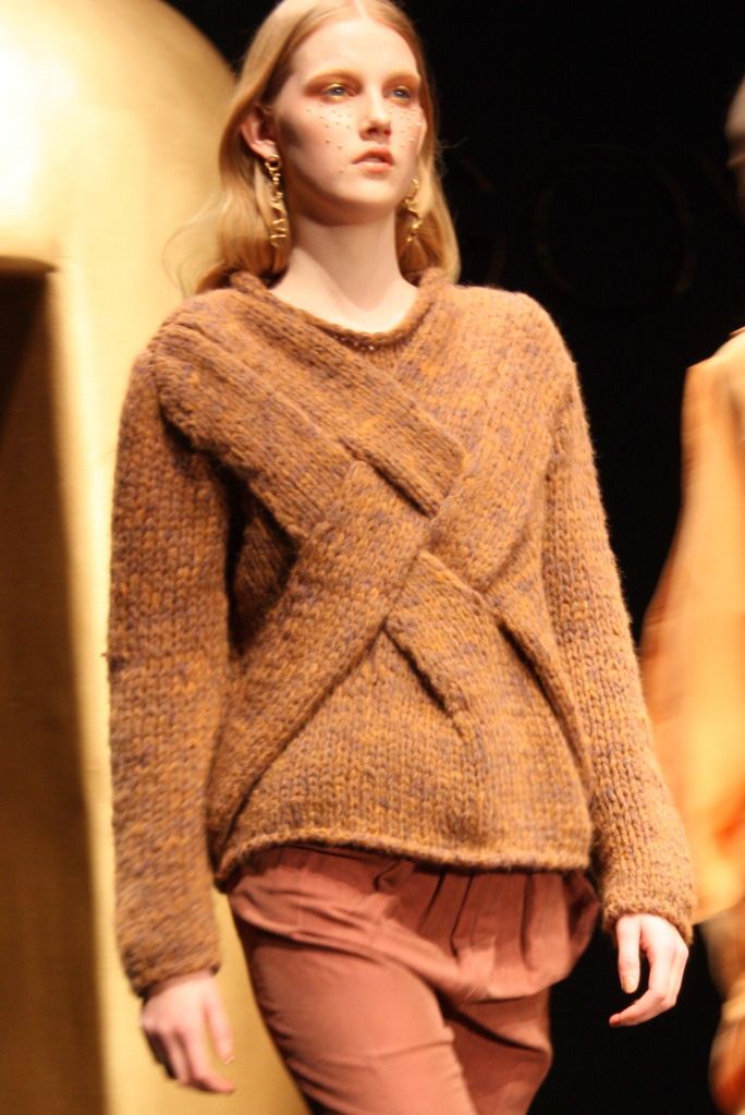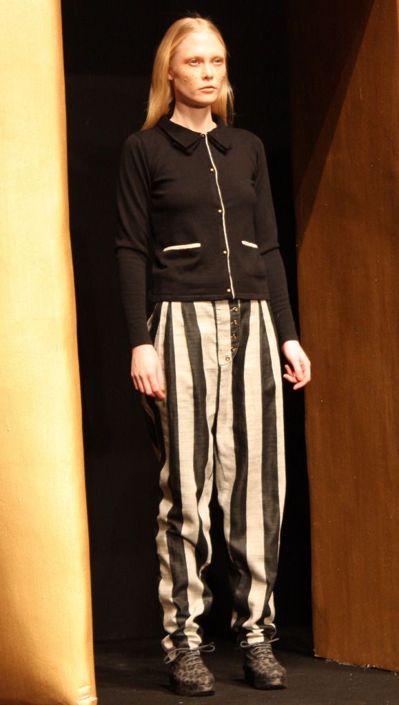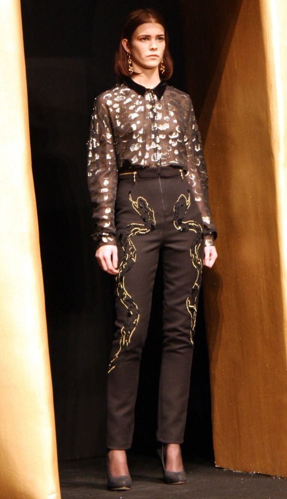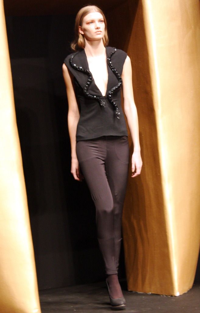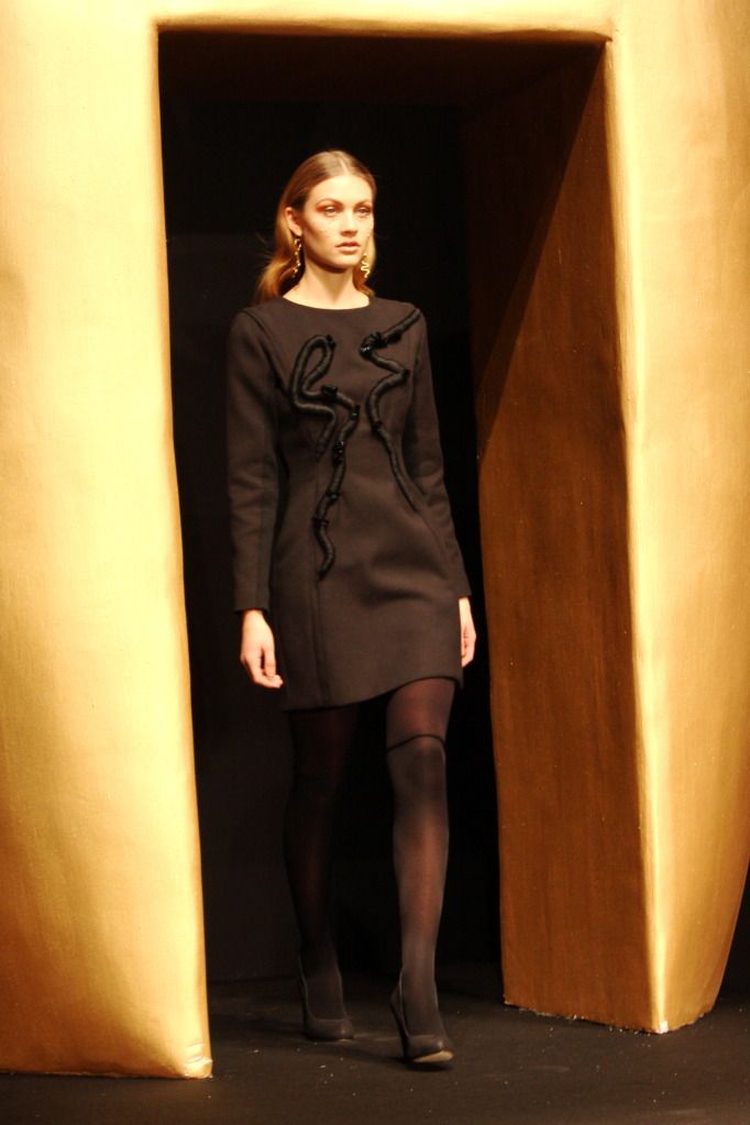 The F/W collection 2012, Seduction de la Nature, breaks with brand’s tradition. The clothes proposed are mainly black, with some notes of mustard, rug, grey and white. The pieces aren’t many, but easy to mix. The lines and the cuts are clean, classic. The clothes are soft, slides on the body, leaving the job of emphasizing it to the black over the knees socks. Besides there are cable-knit sweater, shirts with overlapping collars, high wasted trousers and shorts with embroidered golden snakes, which reminds the earrings made by Sophie Bille Brahe.