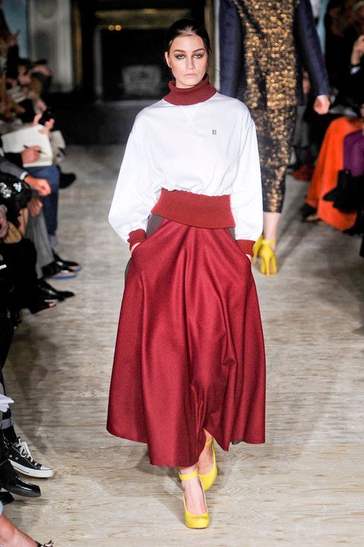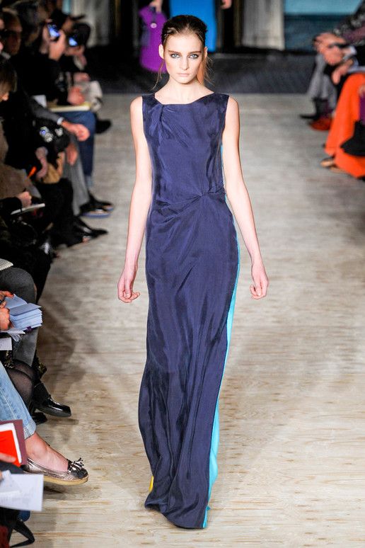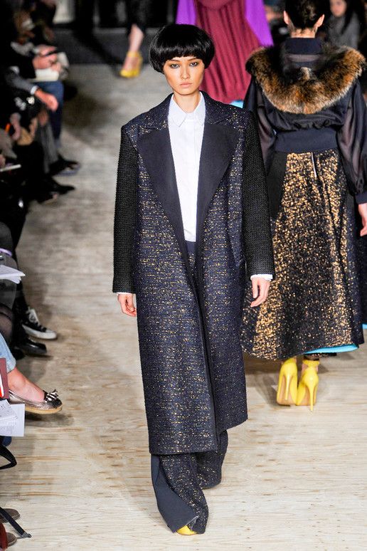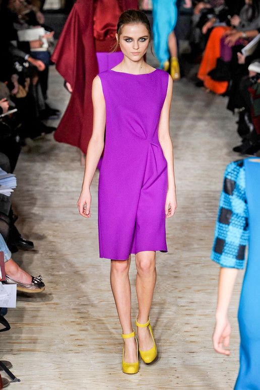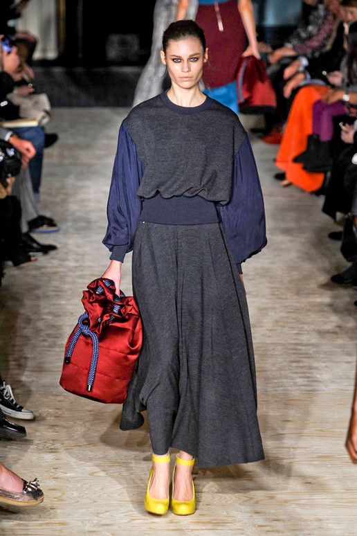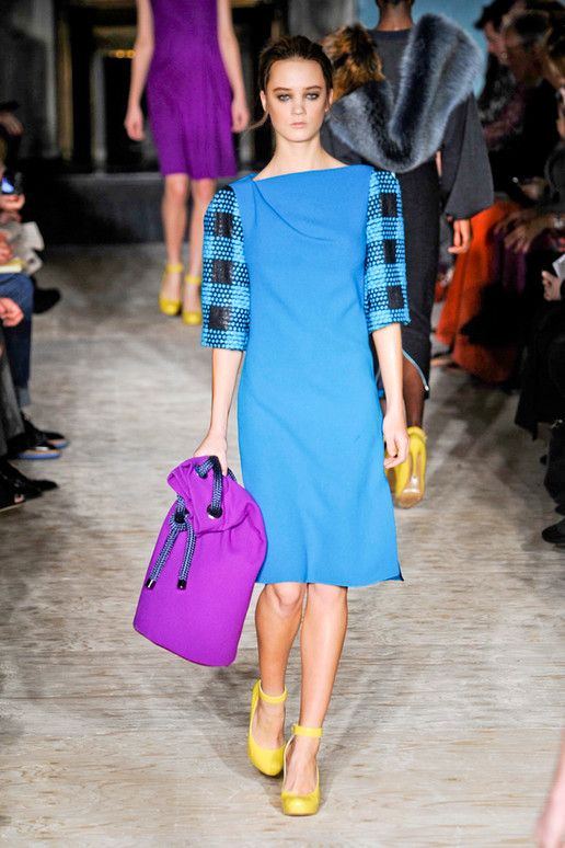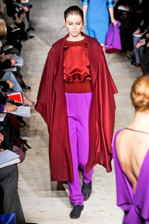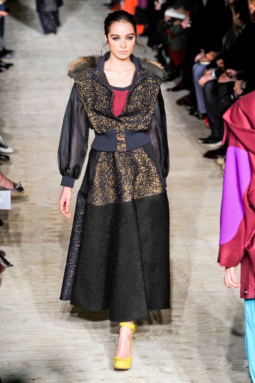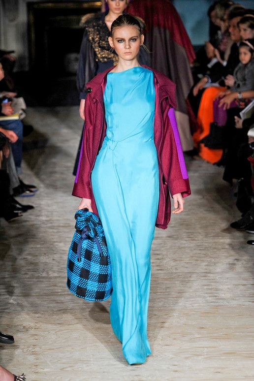 Also the FW 2012/2013 collection seems to be suitable for an important and aware woman. Combinations of fabric intersects jersey, silk, cashmere, satin and insertion of fur. Glamour reigns over each item, over the log satin dresses, over the parkas, over the full skirts, the fluid trousers, the sweaters and over the oversized coat. The soft lines, the maxi proportions and the combination of sporty elements with other definitely lady-like with 40s echoes emphasizes the aristocratic style of the collection. As much sophisticated is the colour palette: cranberry, turquoise, Bordeaux, blue, purple, fuchsia, white and the stroke of yellow of ankle-strap pumps.