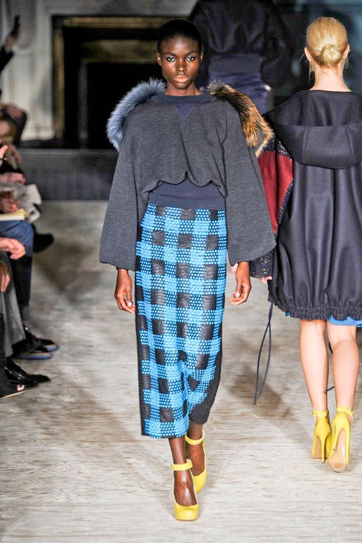 Anche la collezione AW 2012/2013 sembra essere adatta ad una donna importante e consapevole. Combinazioni di tessuti differenti interessano jersey, seta , cachemire, raso ed inserti di pelliccia. Il glamour regna su ogni capo, sui lunghi abiti di raso, sui parka, sulle gonne a matita, i pantaloni fluidi, le felpe e sui cappotti oversized. Le linee morbide, le proporzioni maxi e l’accostamento di elementi sportivi con altri decisamente lady-like dagli echi 40s enfatizzano lo stile aristocratico della collezione. Altrettanto sofisticata è la palette di colori: mirtillo, turchese, bordeaux, blu, viola, fucsia, bianco e la pennellata di giallo delle pumps col cinturino.