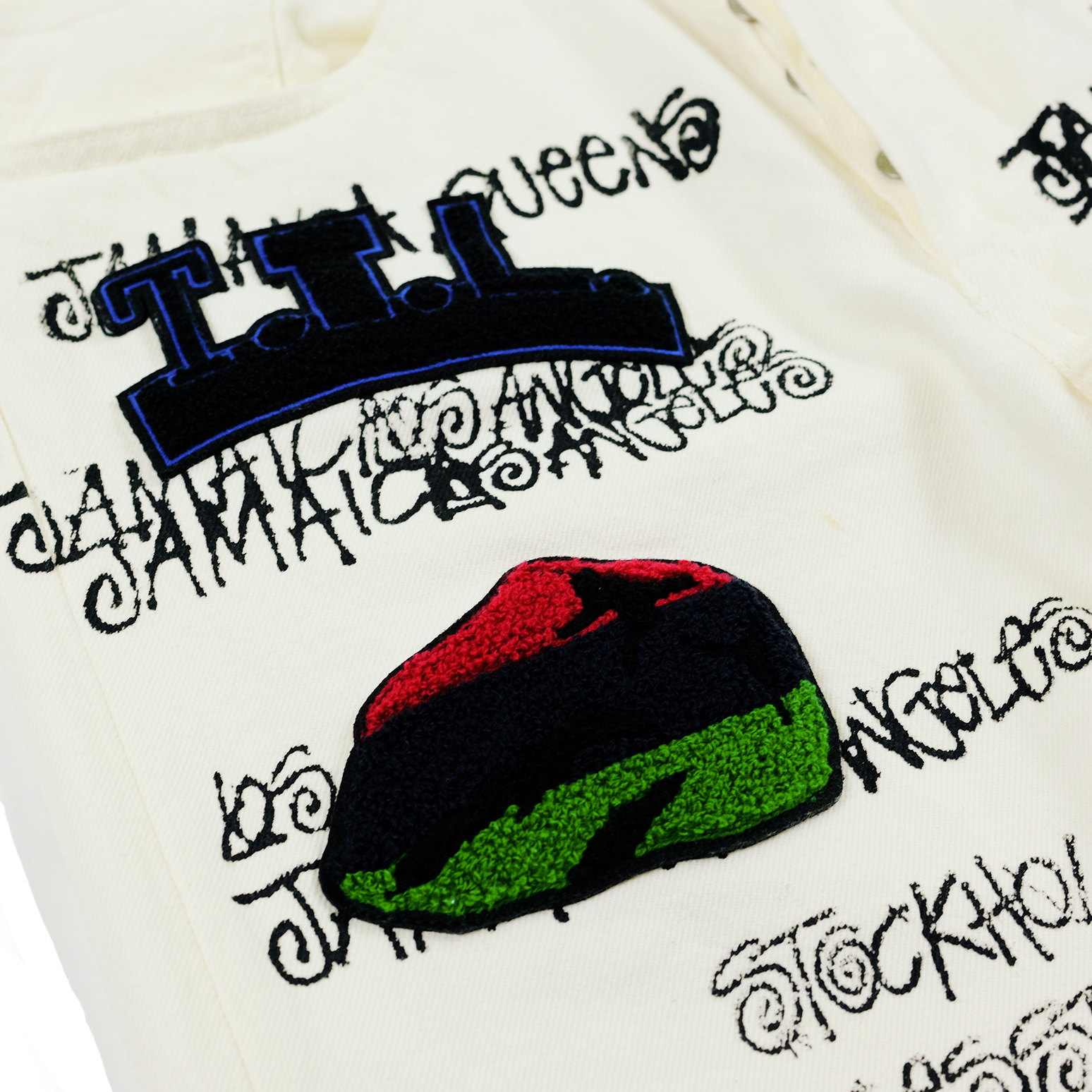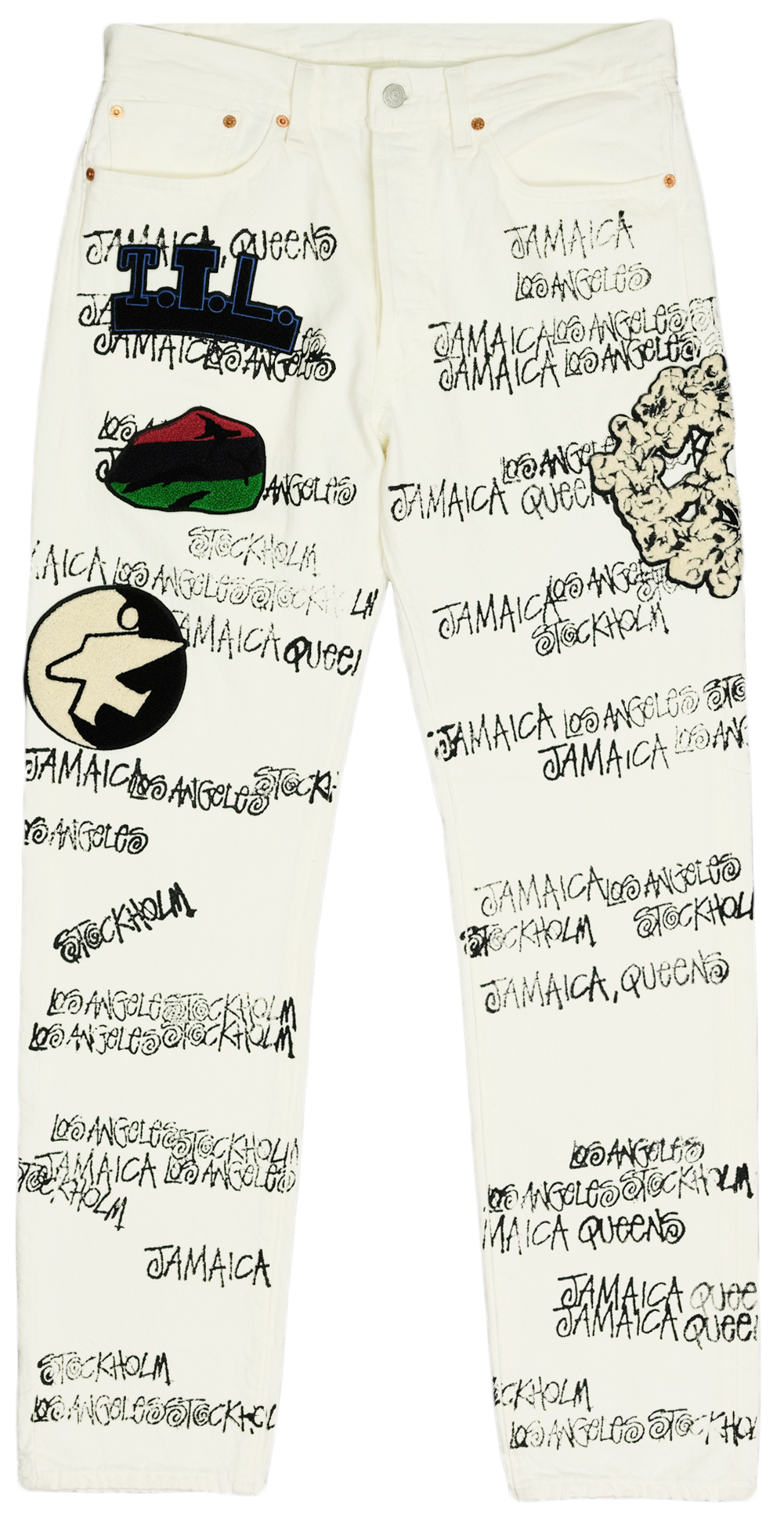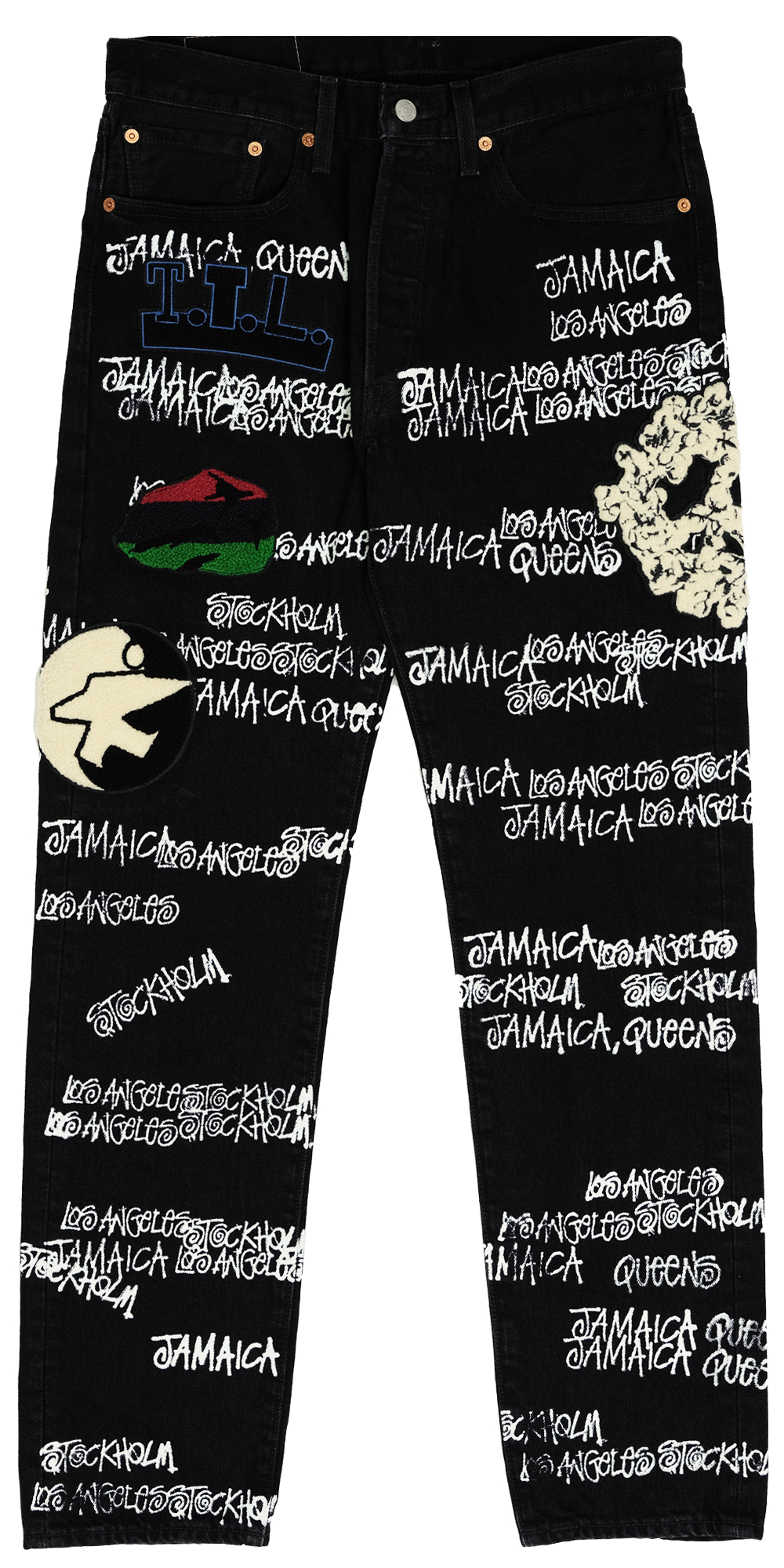 L’idea alla base della collaborazione, che potrebbe essere anche il primo capitolo di un progetto continuativo (già che i brand parlano di una «inaugurazione», facendo presupporre che il loro link-up proseguirà), è basato sul tema delle città di origine: Jamaica Queens, Stoccolma e Laguna Beach. Le giacche e i pantaloni in denim sono decorate da scritte e stemmi che commemorano ognuna di queste location in una serie di reference di cui i due capi, presentati in due colorway diverse, sono letteralmente ricoperti.