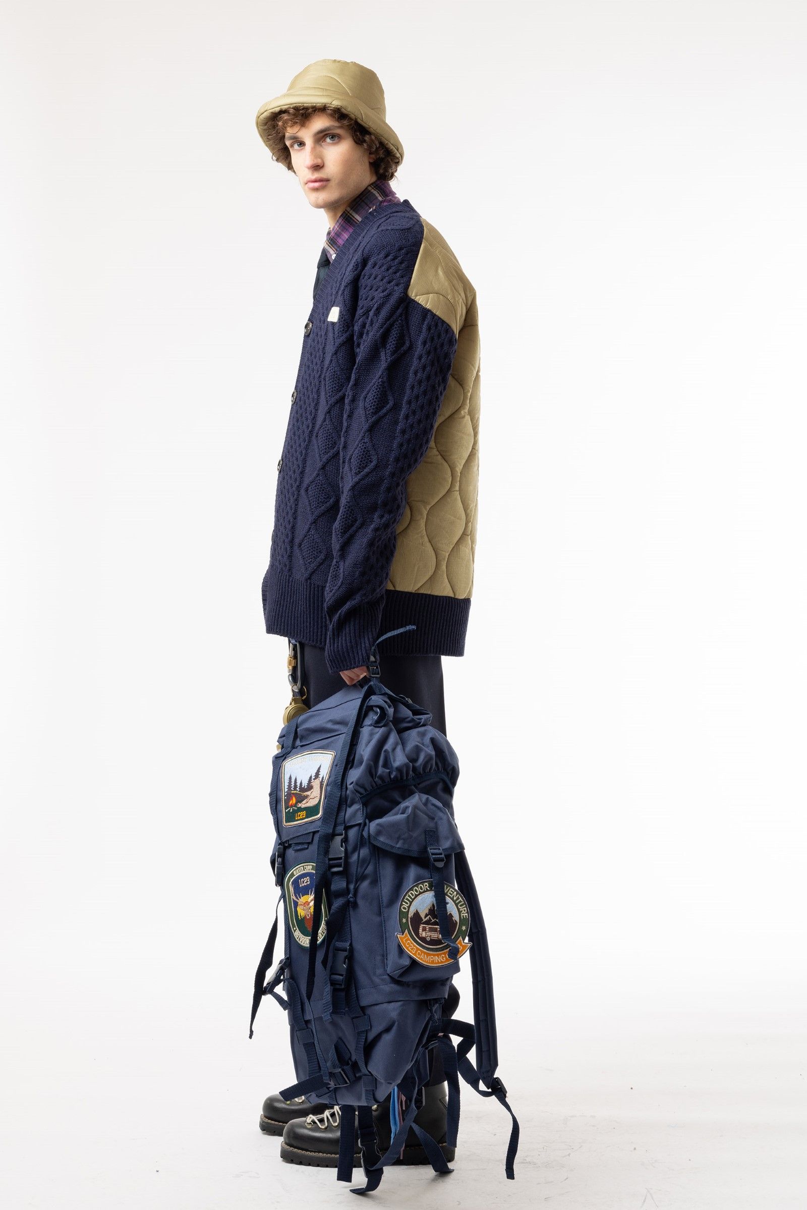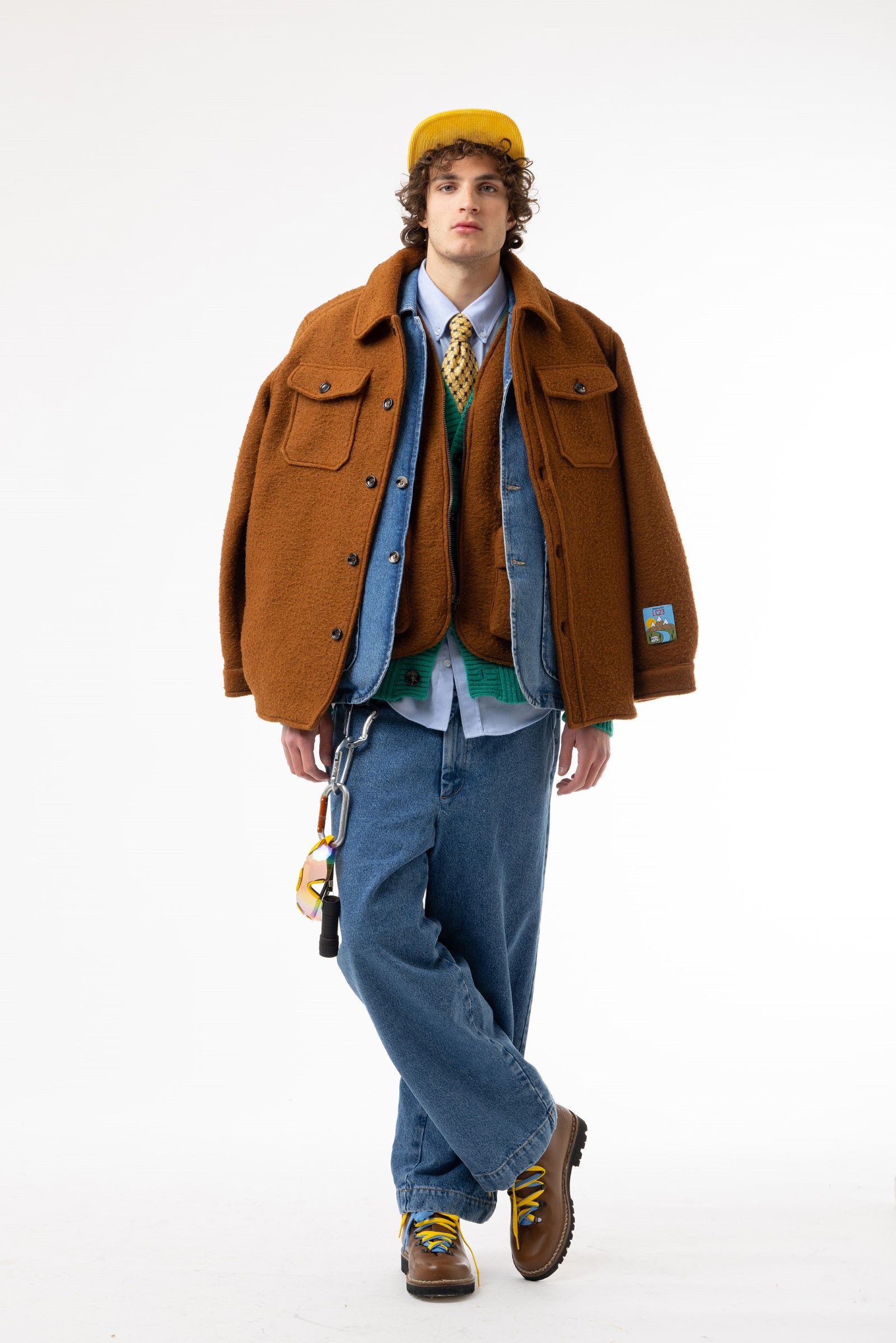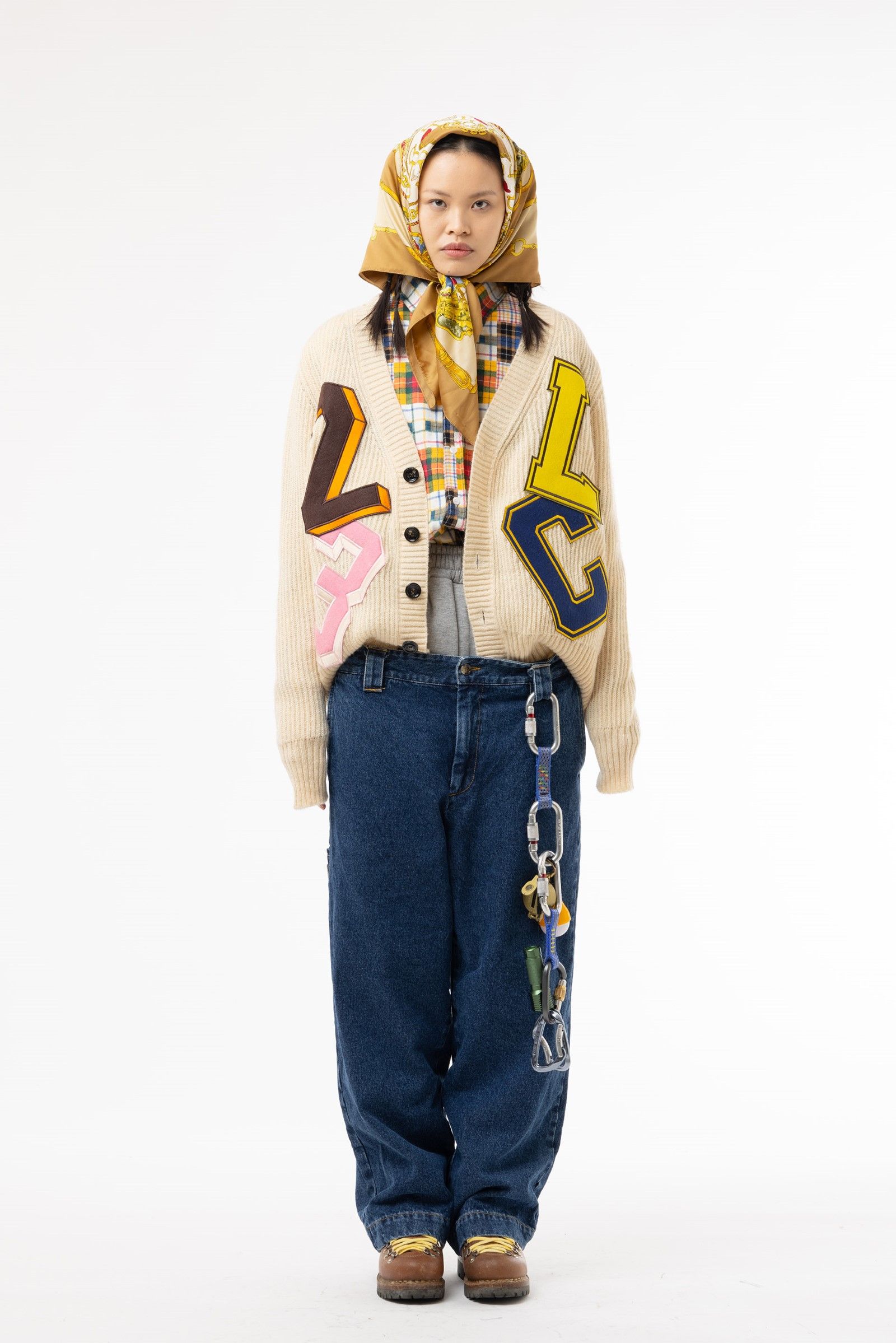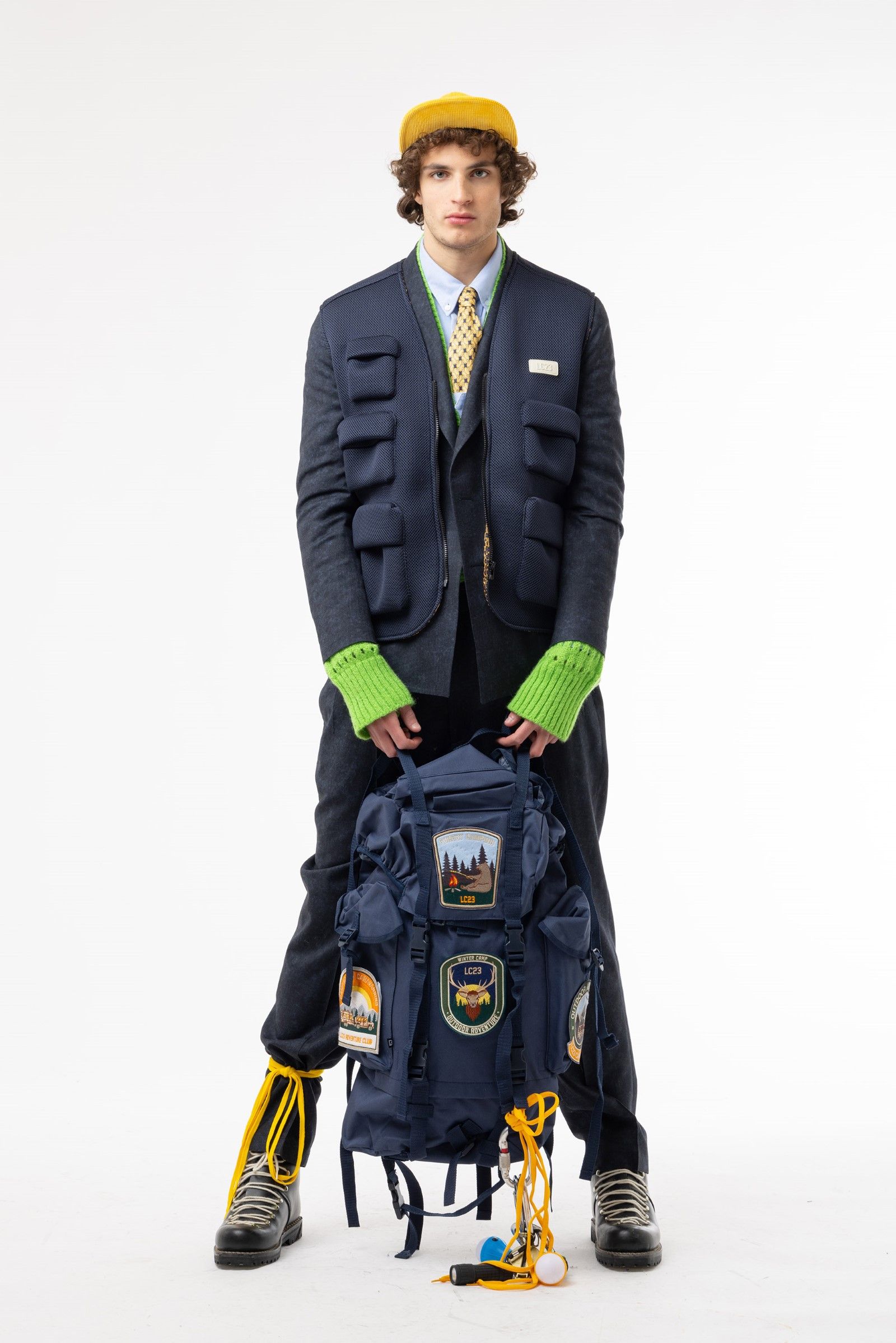 Negli anni lo stile di Colaccico e del suo LC23 è rimasto abbastanza coerente, mostrando una passione per le palette di colori vivaci, le consistenze morbide di maglieria e giacche di fleece e per la costruzione tattica dei capi più direttamente ispirati al mondo outdoor. In questa collezione nello specifico c’è una mistura tra l’estetica preppy dei cardigan, dei completi e delle camicie con un tocco dell’immaginario dei boyscout americani che si materializza attraverso patch, zaini, stivali da trekking e capi tecnici oltre che in classici accessori invernali come berretti o sciarpe.