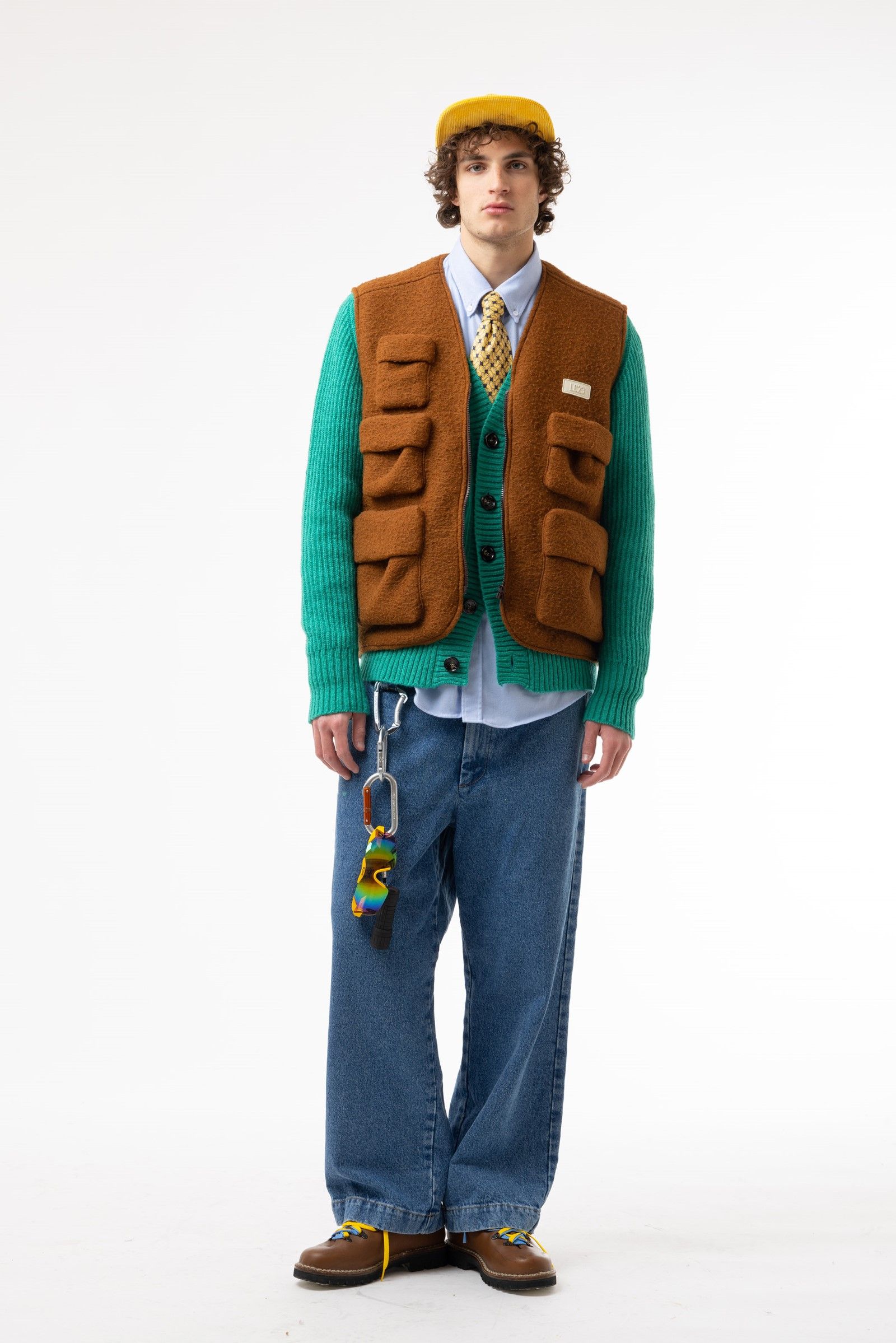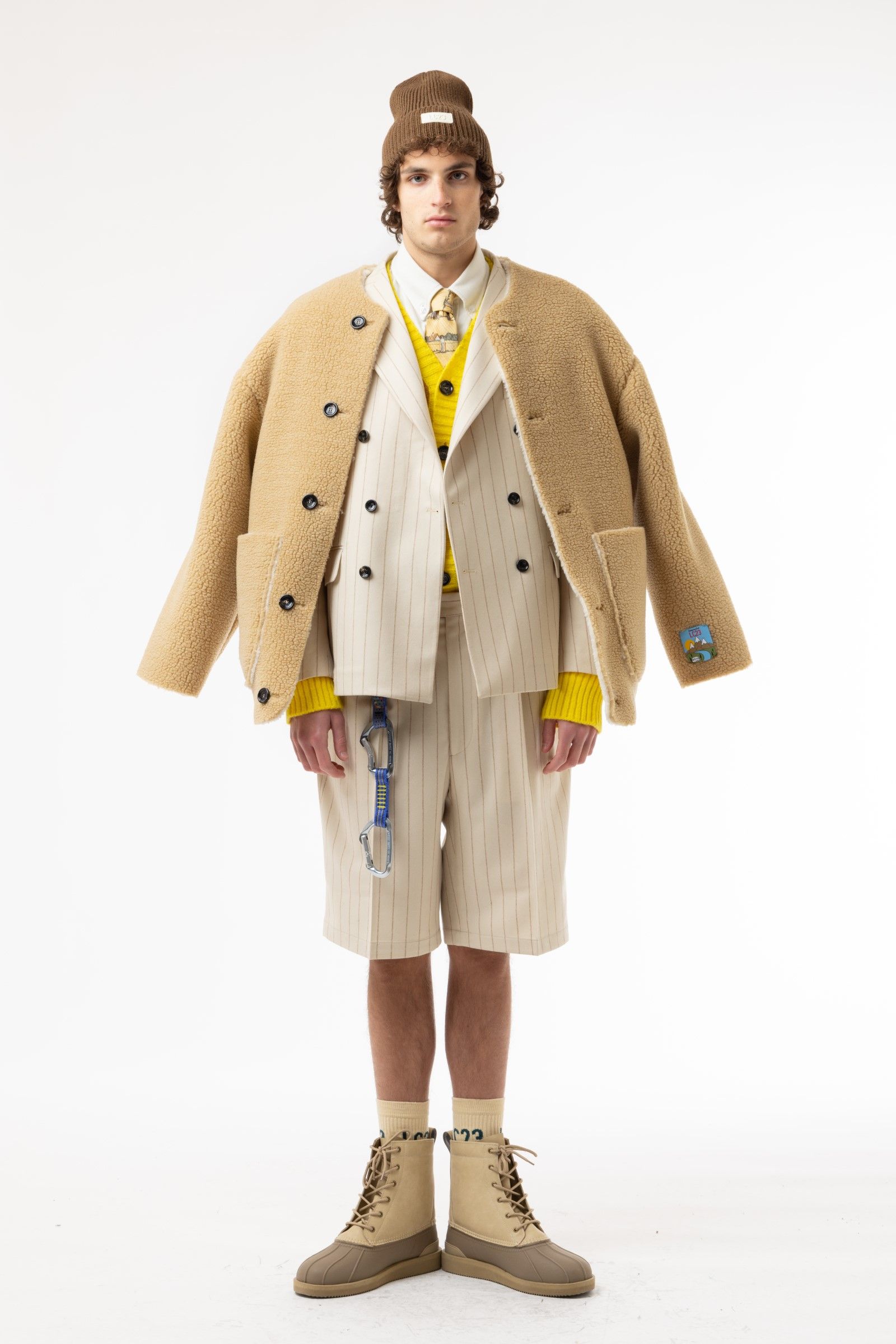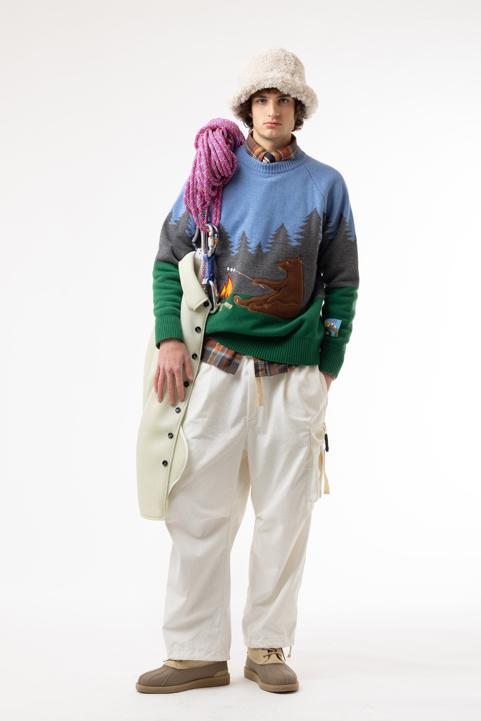 Negli anni lo stile di Colaccico e del suo LC23 è rimasto abbastanza coerente, mostrando una passione per le palette di colori vivaci, le consistenze morbide di maglieria e giacche di fleece e per la costruzione tattica dei capi più direttamente ispirati al mondo outdoor. In questa collezione nello specifico c’è una mistura tra l’estetica preppy dei cardigan, dei completi e delle camicie con un tocco dell’immaginario dei boyscout americani che si materializza attraverso patch, zaini, stivali da trekking e capi tecnici oltre che in classici accessori invernali come berretti o sciarpe.