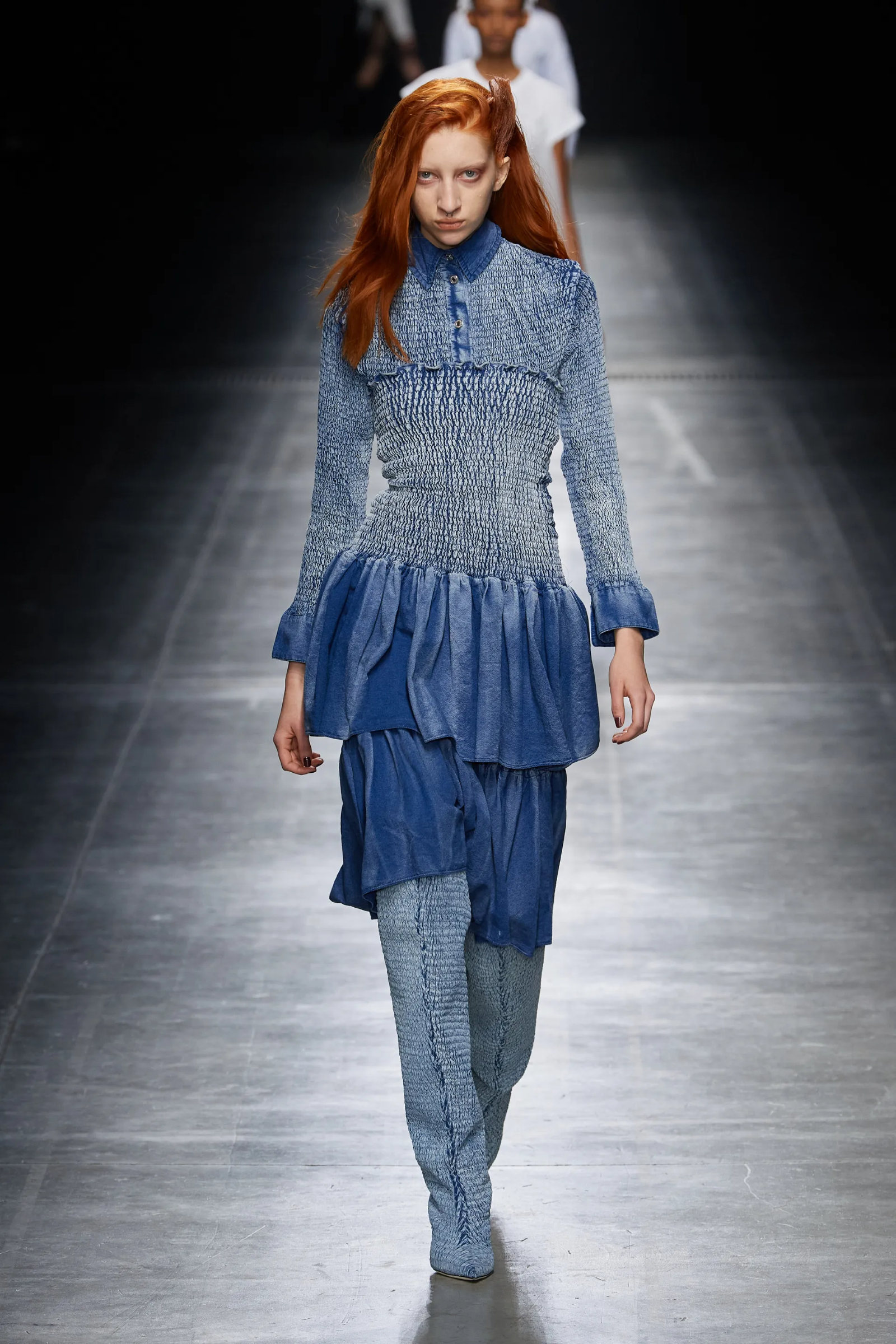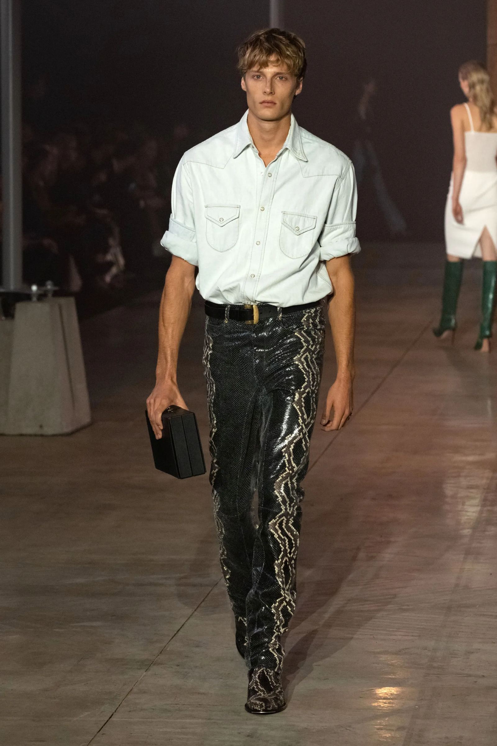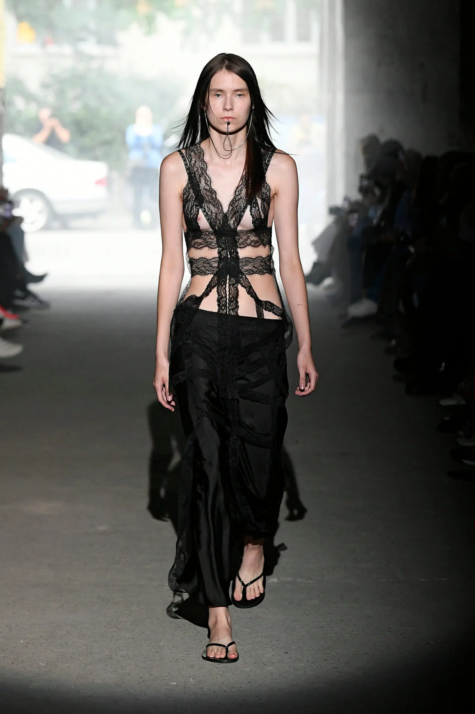 Essenzialità si è vista poi all’opera da Ferragamo, che il restyling operato da Maximilian Davies ha già colorato di una nuova patina di fascino e novità che il brand aveva abbondantemente perso negli ultimi anni. Davies ha un compito complicato di fronte a sé: un designer che viene dall’effervescente Londra ritrovatosi tra le antiche, pesanti mura di una signorile casa toscana tanto opulenta quanto antiquata – eppure lo show di sabato scorso ha dimostrato che un restyling è possibile e che Davies è la figura creativa giusta per rendere lo storico brand rilevante e vitale di nuovo. Simile operazione, in una forma più controllata, è stata svolta da Rhuigi Villaseñor con Bally che ha richiamato il Gucci di Tom Ford ma in una chiave meno decadente. Aria di decadenza tirava invece da Blumarine, da Diesel, da No. 21, da Andreadamo e da AC9 che hanno presentato una serie di look sensuali e discinti, ispirati a una specie di libido morbosa fatta di abiti trasparenti o ridotti, con drappeggi di cinghie, spalline calate, tagli che rivelavano, spalline e orli di pizzo strappati, silhouette quasi lacere. In particolare, le muse che Alessandro dell’Acqua ha portato in passerella sembravano il ritratto di un’estrema, romantica eleganza sopravvissuta a un naufragio che ha sdraricato codici, rotto simmetrie, scompigliato norme sociali.