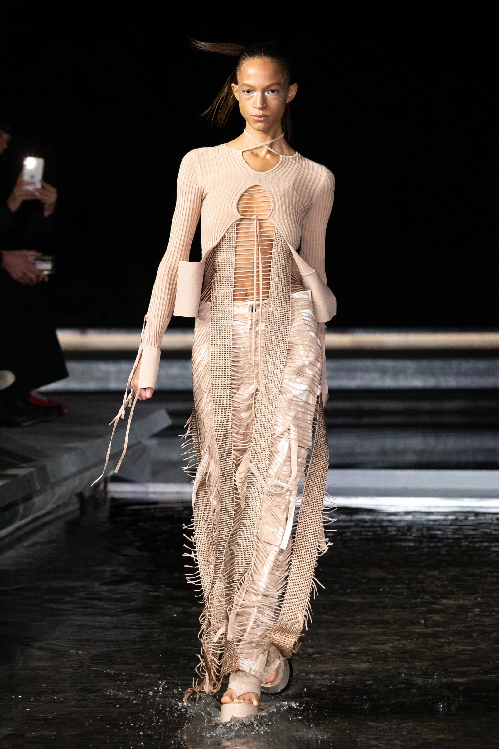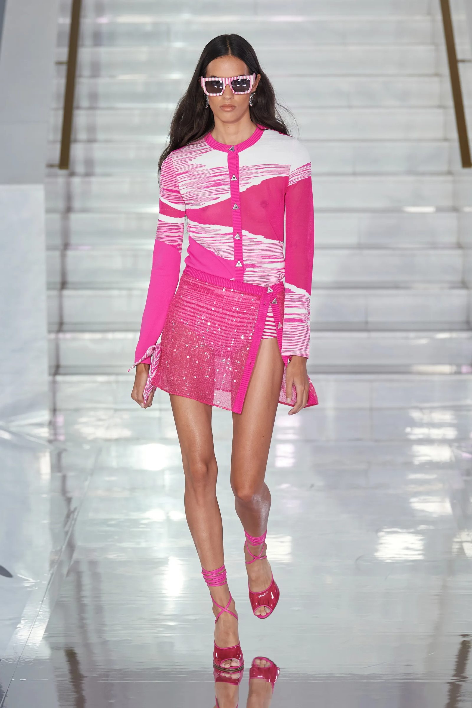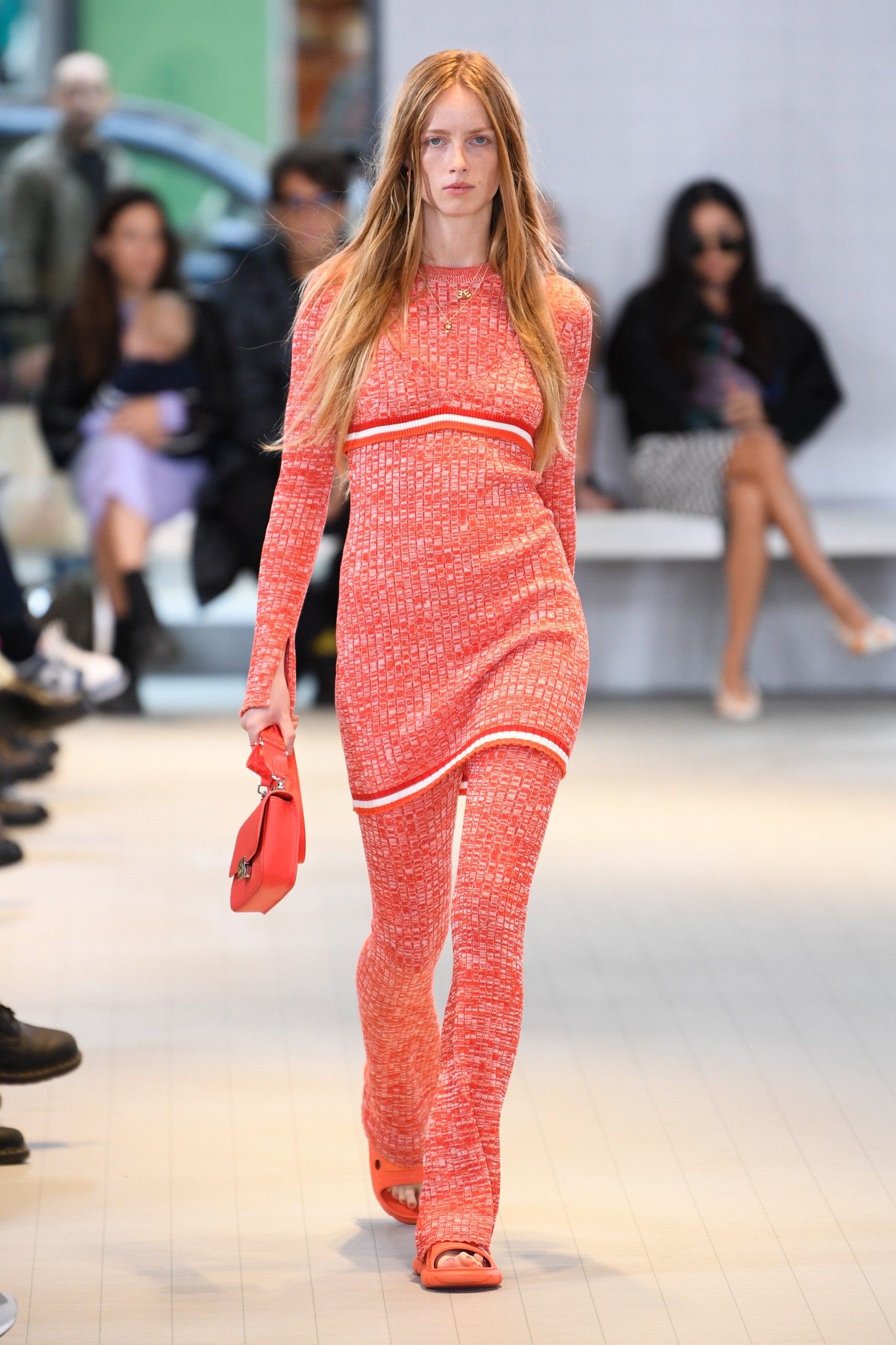 Essenzialità si è vista poi all’opera da Ferragamo, che il restyling operato da Maximilian Davies ha già colorato di una nuova patina di fascino e novità che il brand aveva abbondantemente perso negli ultimi anni. Davies ha un compito complicato di fronte a sé: un designer che viene dall’effervescente Londra ritrovatosi tra le antiche, pesanti mura di una signorile casa toscana tanto opulenta quanto antiquata – eppure lo show di sabato scorso ha dimostrato che un restyling è possibile e che Davies è la figura creativa giusta per rendere lo storico brand rilevante e vitale di nuovo. Simile operazione, in una forma più controllata, è stata svolta da Rhuigi Villaseñor con Bally che ha richiamato il Gucci di Tom Ford ma in una chiave meno decadente. Aria di decadenza tirava invece da Blumarine, da Diesel, da No. 21, da Andreadamo e da AC9 che hanno presentato una serie di look sensuali e discinti, ispirati a una specie di libido morbosa fatta di abiti trasparenti o ridotti, con drappeggi di cinghie, spalline calate, tagli che rivelavano, spalline e orli di pizzo strappati, silhouette quasi lacere. In particolare, le muse che Alessandro dell’Acqua ha portato in passerella sembravano il ritratto di un’estrema, romantica eleganza sopravvissuta a un naufragio che ha sdraricato codici, rotto simmetrie, scompigliato norme sociali.