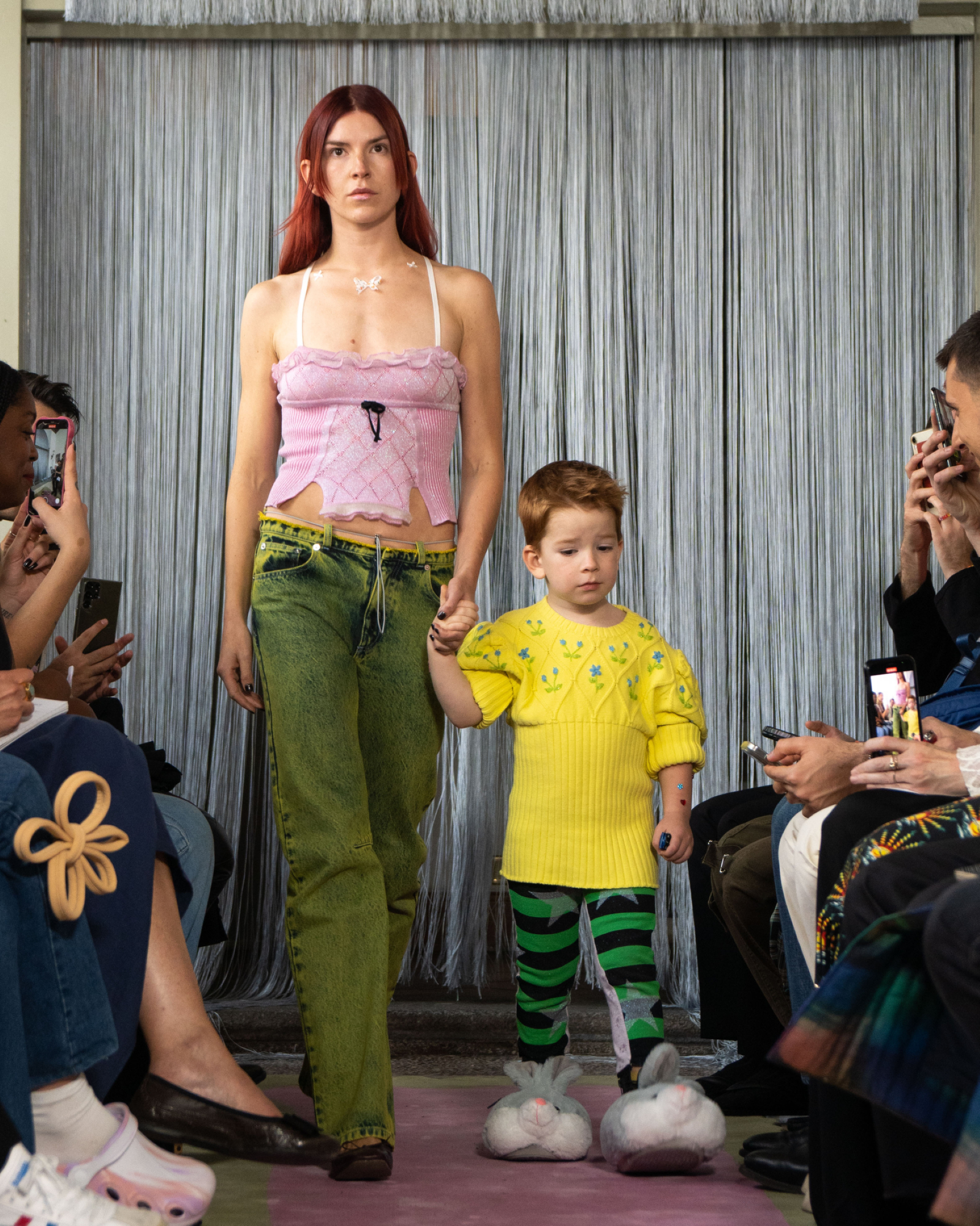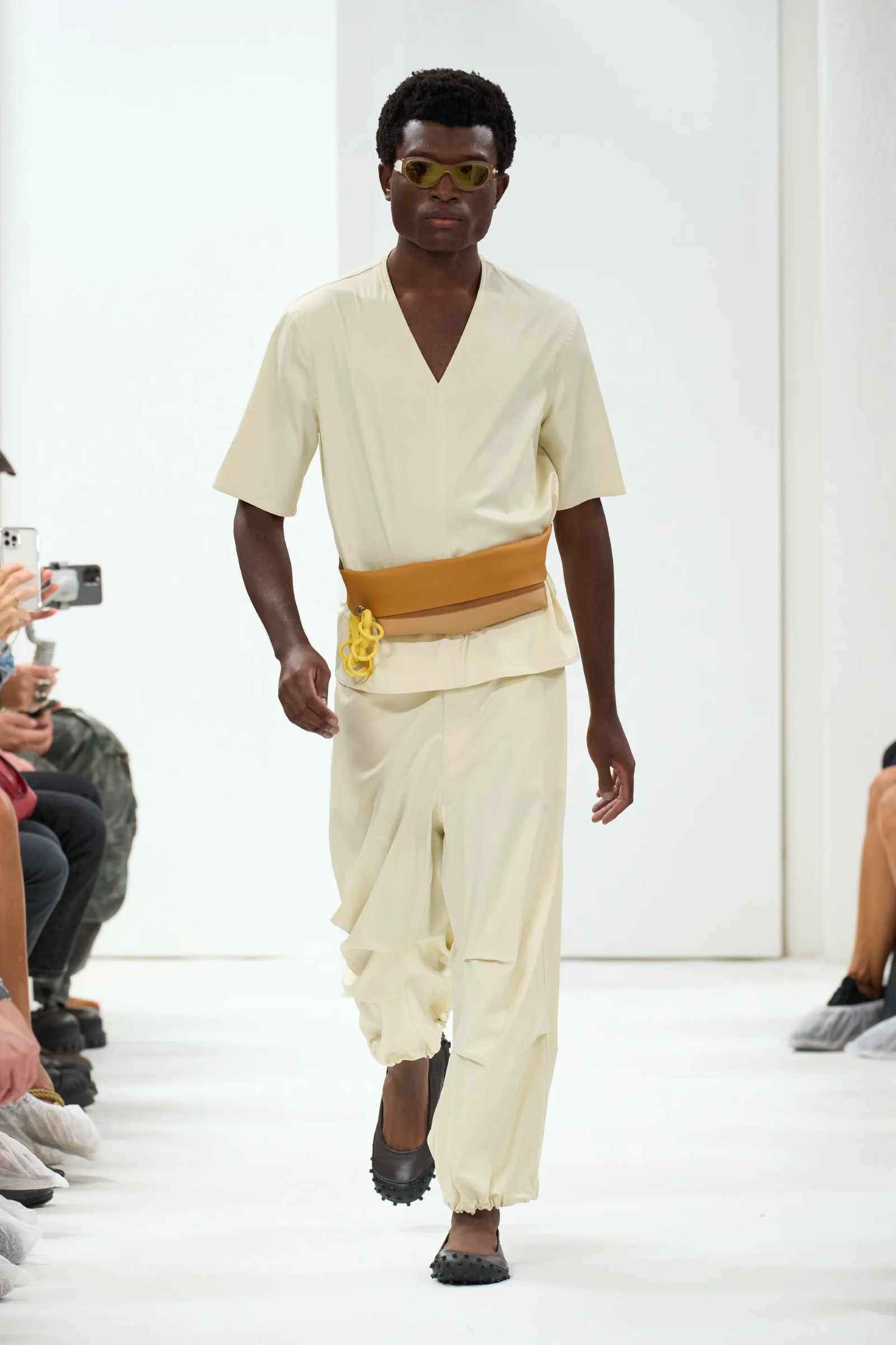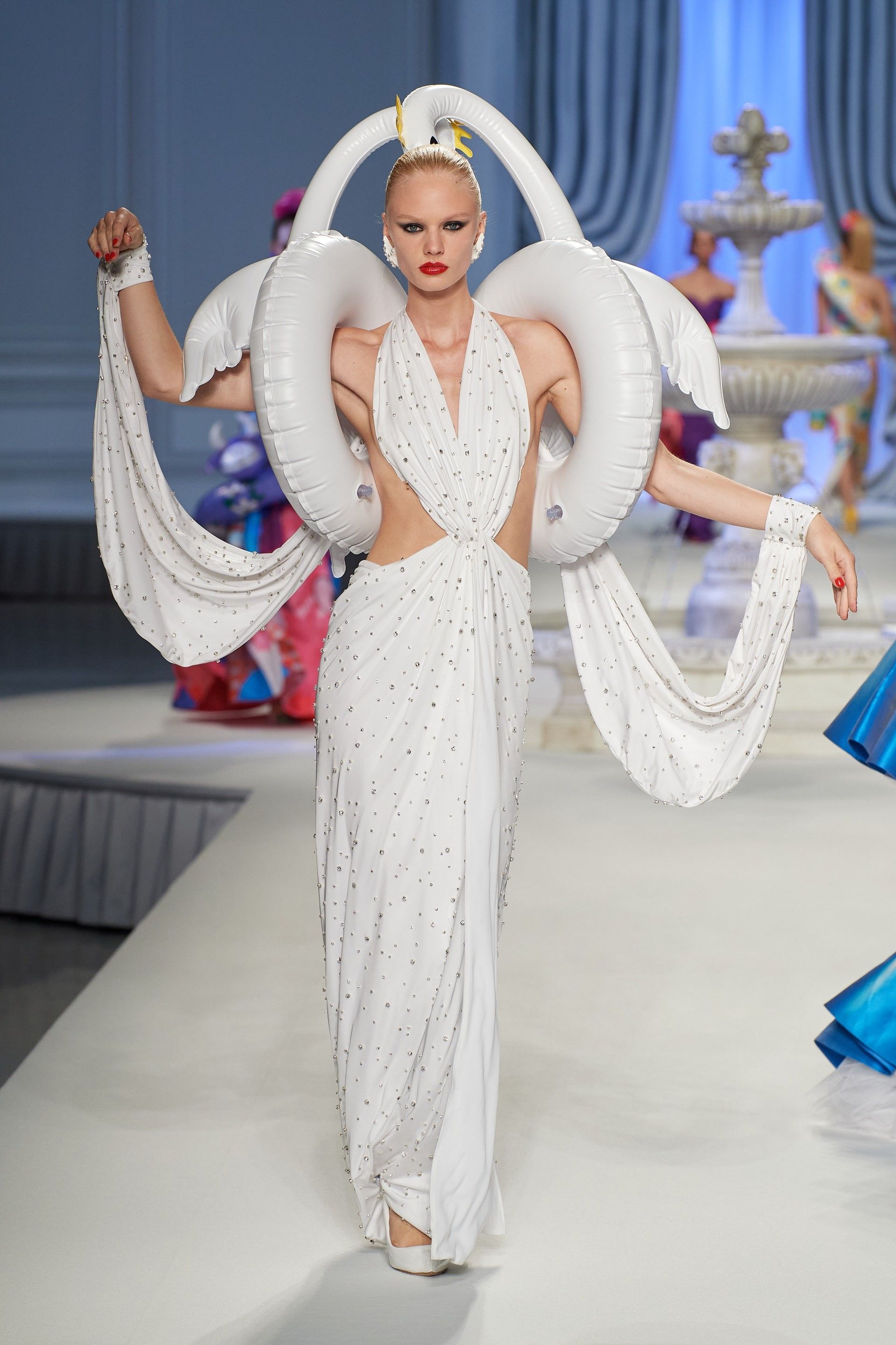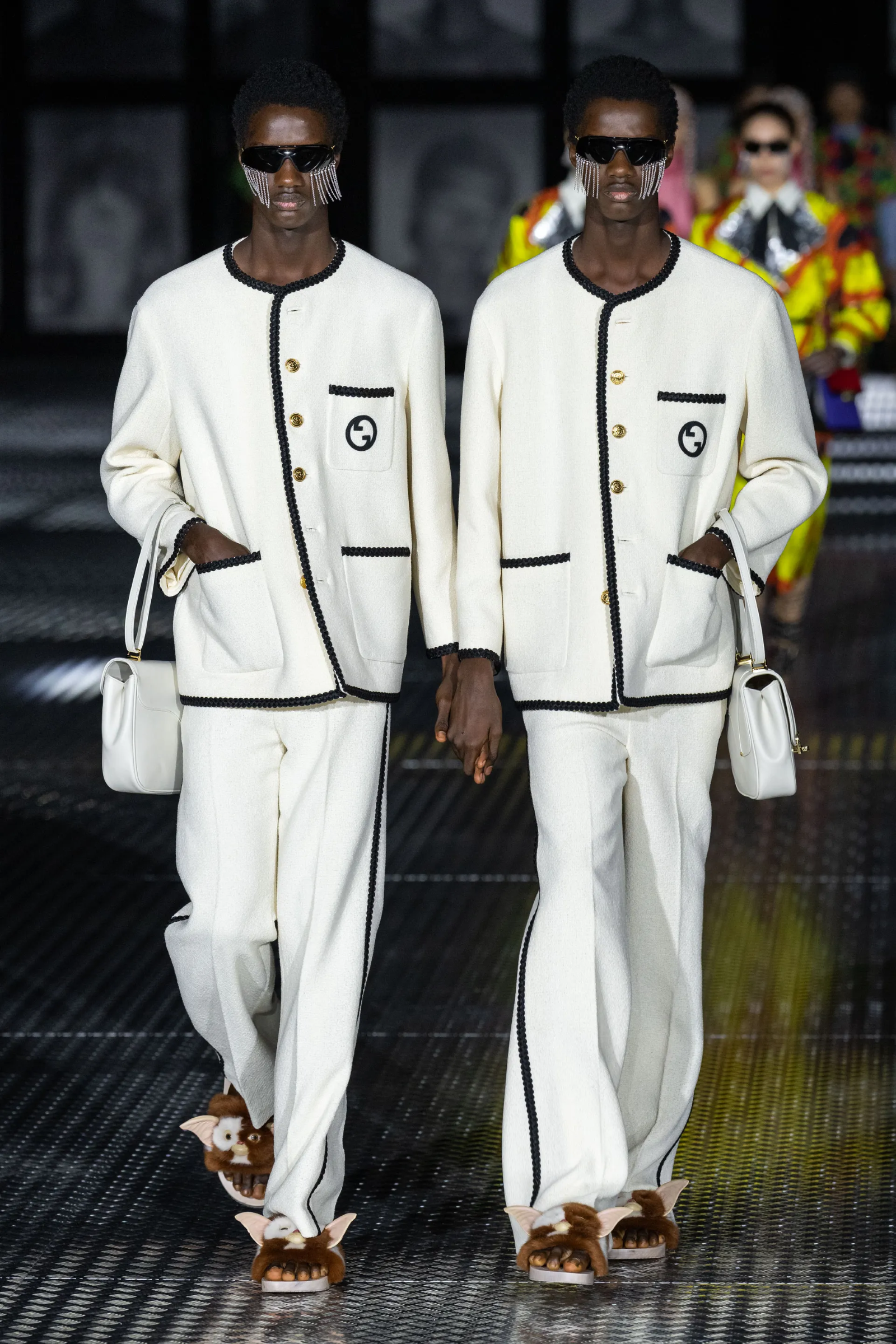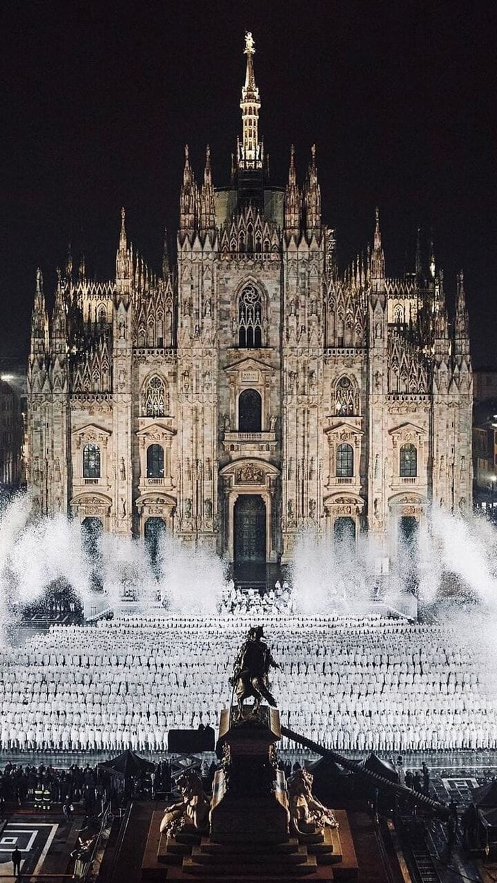 La ricerca di essenzialità è ancora più evidente se si considera come i due nomi più normalmente barocchi e massimalisti della settimana, Versace e Dolce & Gabbana, abbiano virato lontano dalle oltranze di un tempo, rinunciando a ori e patacche, e optando invece per ensemble più monocromi che raccontavano le estetiche dei rispettivi brand in maniera più implicita e strutturale rispetto al passato. In particolare è stata interessante l’operazione di Dolce & Gabbana i quali hanno offerto al pubblico una selezione di look d’archivio filtrati attraverso la lente contemporanea della sensibilità di Kim Kardashian – il risultato che, oltre all’ovvio appeal del marketing, è risuonato più sincero ed elegante di molte altre collezioni passate dei due designer. Altrove, invece, concettualità e tecnicismo hanno dominato la già menzionata collezione di Bottega Veneta, ma anche gli outing di Prada, Jil Sander e MaxMara che sono stati essenziali al limite dell’avant-garde. Da Gucci l’avant-garde si è invece trasformata in spettacolo funambolico, con l’espediente della doppia sfilata popolata di gemelli che ha ricordato a Milano che una sfilata può essere qualcosa di più elaborato di una semplice rassegna e che la moda è ancora in grado di creare uno spettacolo capace di sorprendere e farsi ricordare. Più diretto è stato invece Moschino che, abbandonandosi a una fantasia dai sapori anni ’80, ha evocato con piglio moderno e ultra-ironico sfilate e silhouette d’altri e più opulenti tempi. Alla stessa maniera Moncler ha trasformato il suo show in uno spettacolo faraonico con duemila ballerini presenti in Piazza del Duomo – una nuova dimostrazione delle possibilità creative di uno show, al di fuori del format della classica “rassegna”.