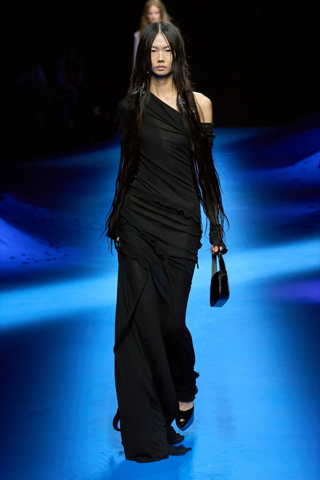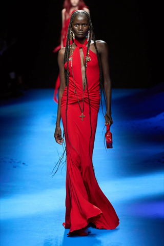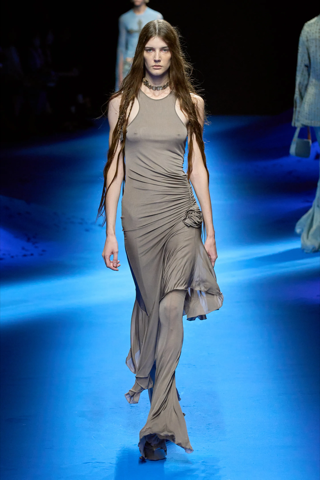 Il Y2K è andato a intercettare uno statement ben radicato nell’aria, prestandosi a processo interpretativo per una narrativa orientata sull’esaltazione del sexy e calato in una dimensione sostanzialmente queer. Per uno strano quanto prevedibile gioco del destino, è di nuovo l’operato di Miu Miu a rimodulare il discorso e a tenere sigillato lo Zeitgeist: se vita bassa e minigonne striminzite sono stati gli ingredienti che hanno reso virale la silhouette da scolaretta ribelle di Miu Miu con la collezione SS22, la SS23 ha ulteriormente affinato i codici del minimalismo anni ’90 per dare forma alla nuova uniforme pensata da Miuccia Prada. Le minigonne diventano così cargo e quelle più lunghe plissé includono un marsupio d’ispirazione workwear, mentre le scarpe hanno assunto la forma (disturbante?) di un ibrido tra infradito e stivali. La triade sembra insomma comporsi di underwear in bella vista, abbigliamento formale più o meno sovrapposto con l’utility e una dose di disruptive sexiness che sarà destinata a trainare ancora i trend di mercato. Quello che colpisce, però, è il fatto che anche i brand il cui DNA è essenzialmente legato all’estetica Y2K stanno riformulando visioni sganciabili da quel patrimonio genetico. Blumarine, in occasione dello show per la collezione SS23, ha sostituito farfalle e glitter con una silhouette sinuosa e aderente da sirena. Un susseguirsi di item sexy in jersey lussuoso ha scolpito ogni curva del corpo, sbocciando in strascichi lunghissimi che si sono allungati sul pavimento sabbioso del set della sfilata, disseminato di conchiglie e immerso in una luce blu acquario. «Non voglio nemmeno più parlare della questione Y2K» ha dichiarato con sicurezza Nicola Brogano a Vogue.