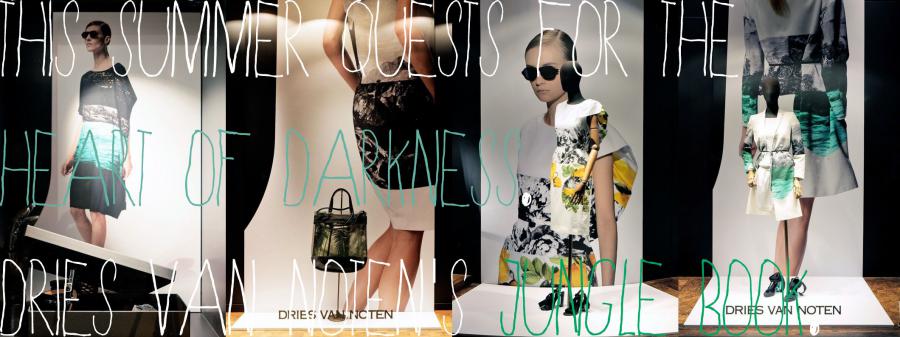 Dries Van Noten poetically describes this travel towards the core of ourselves, encourages with the dazzle of white dresses, holding scraps and memories of this travel into the Jungle. Palms majesty reassures if worn, like also the turquoise ocean.