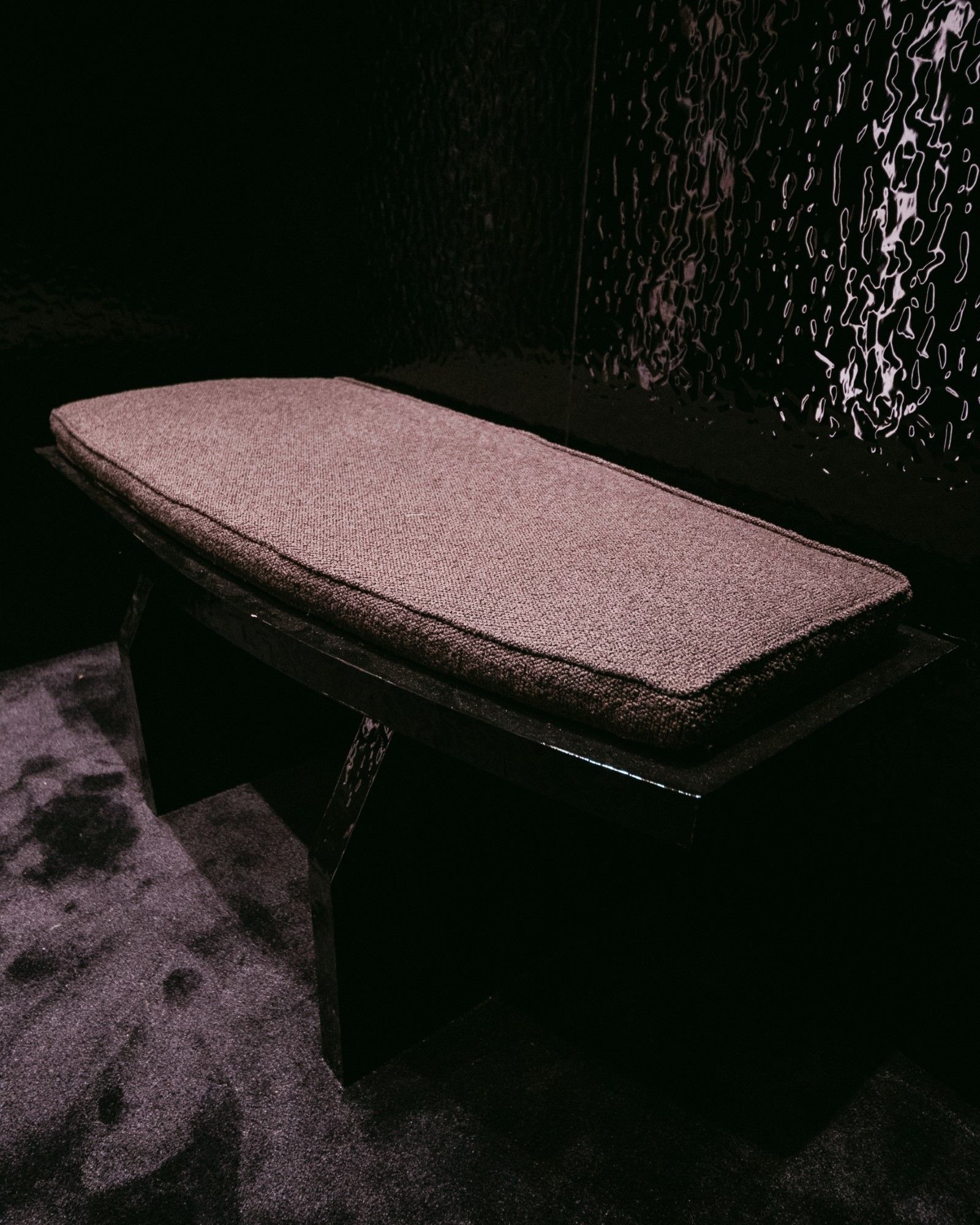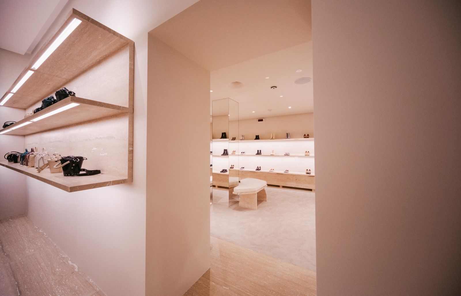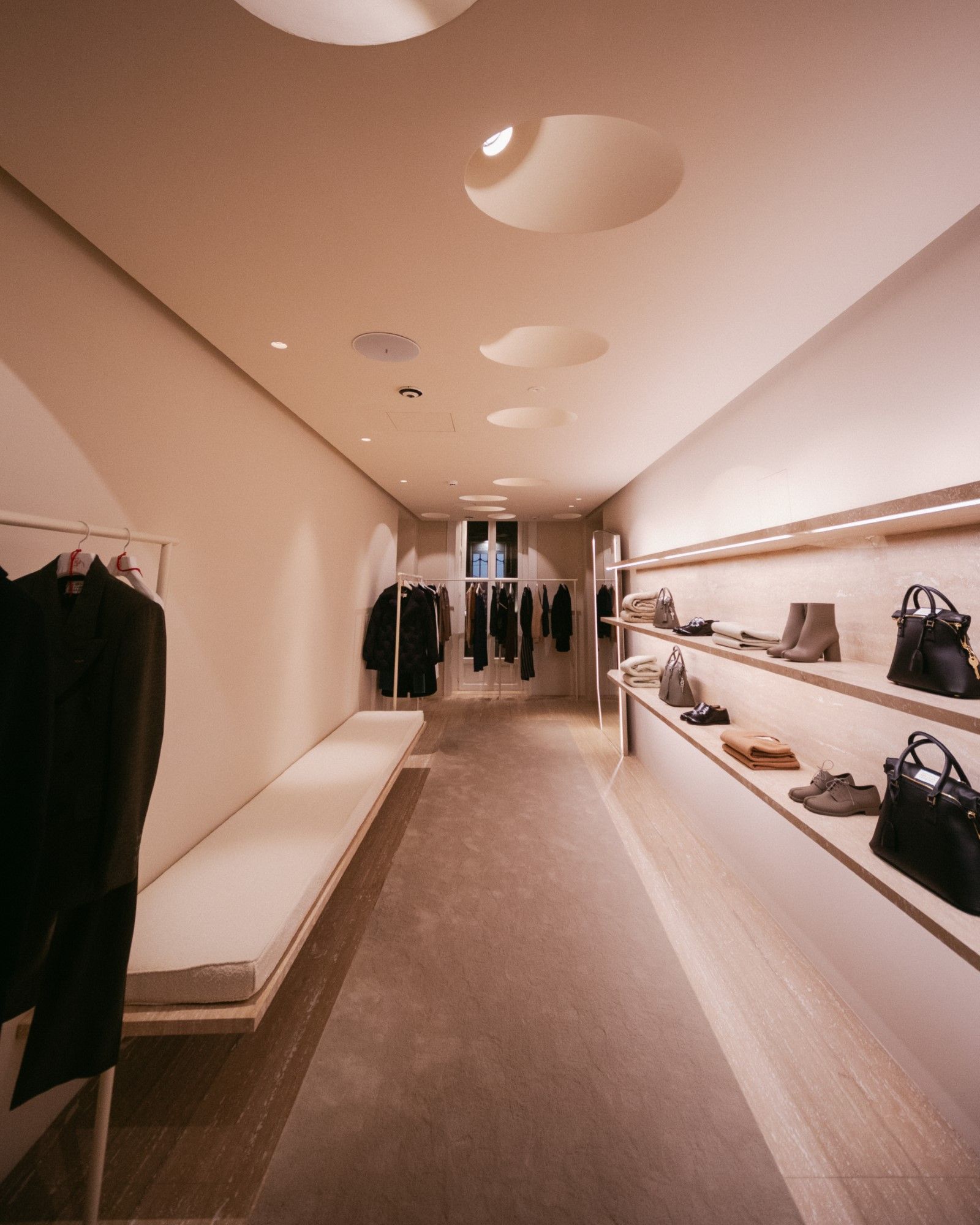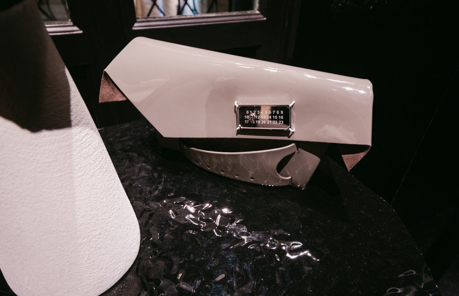 Le pareti all’interno, mantenute nella tonalità naturale del gesso, riflettono gli anonimati delle fodere interne trasformando in decor la filosofia della maison e in particolare il colore bianco tipico di Margiela – così come il suo interesse verso la decostruzione. Il tema della decostruzione torna anche negli arredi, e nello specifico nei mobili Misfit progettati per ricordare oggetti classici e riconoscibili, ma ri-concettualizzati nella loro forma. La tecnica del décortiqué viene applicata su scaffali, tavoli da esposizione e sedute intagliate in travertino tinto, le cui rientranze naturali sono riempite con resina epossidica in contrasto con il colore bianco. I soffitti e i camerini, invece, i luoghi più intimi della boutique, hanno pareti rivestite da diversi strati di vernice spazzolata a mano di colore verde scuro che crea una profonda lucentezza che riecheggia negli armadietti in lacca giapponese.