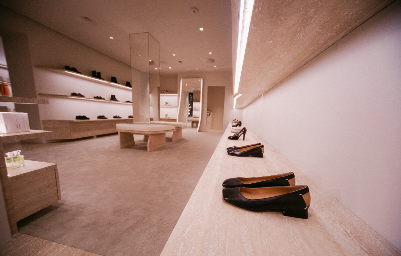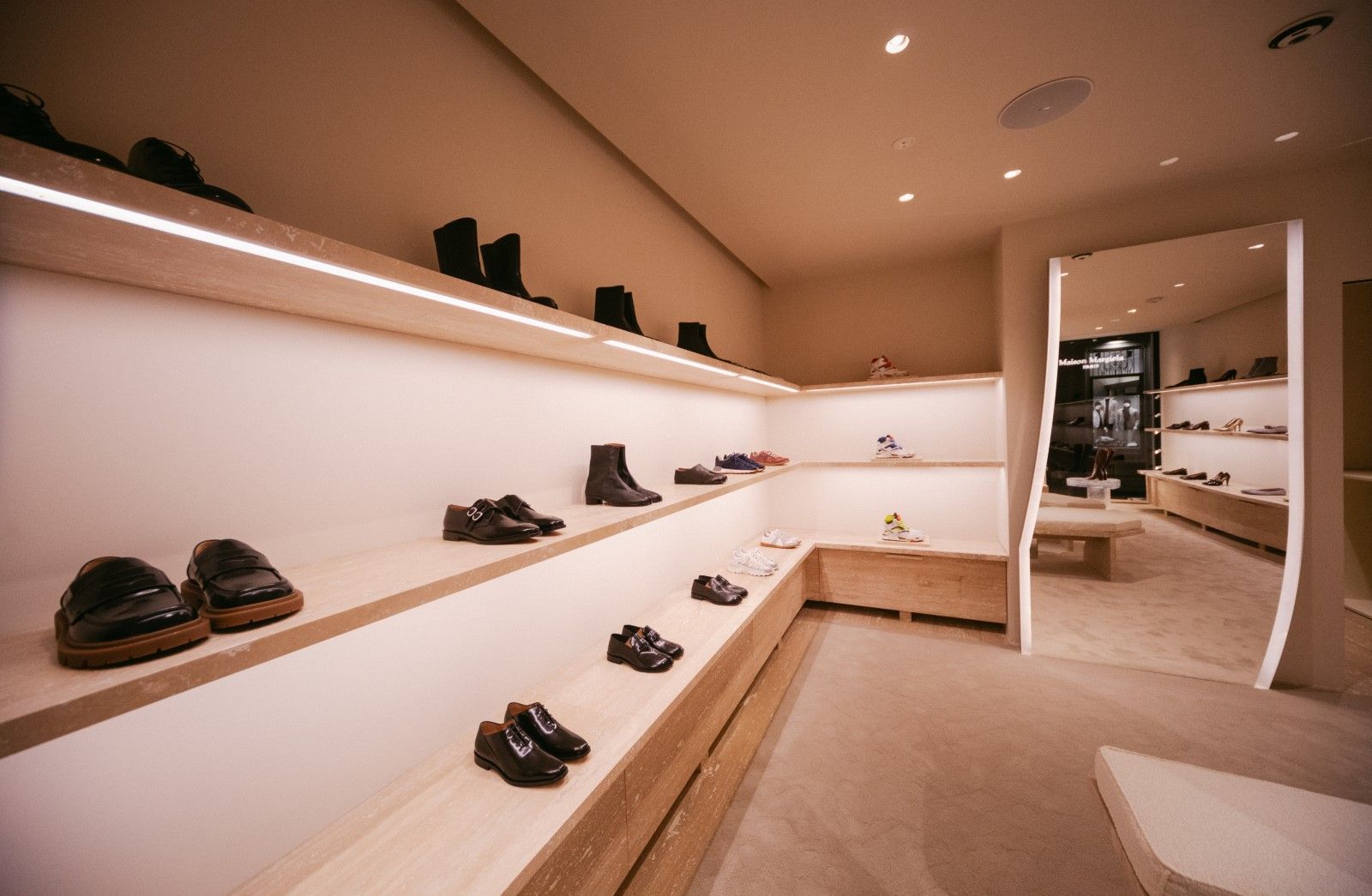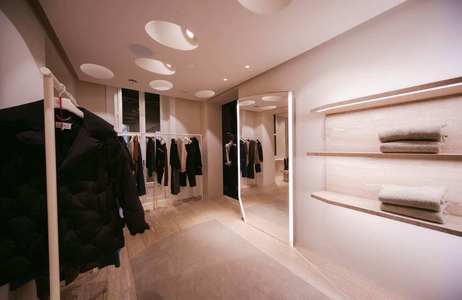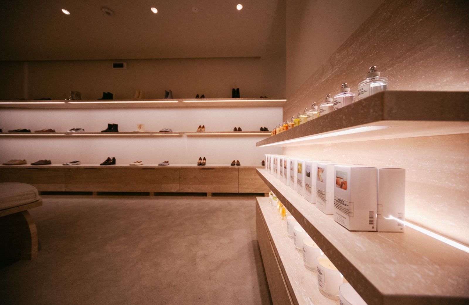Le pareti all’interno, mantenute nella tonalità naturale del gesso, riflettono gli anonimati delle fodere interne trasformando in decor la filosofia della maison e in particolare il colore bianco tipico di Margiela – così come il suo interesse verso la decostruzione. Il tema della decostruzione torna anche negli arredi, e nello specifico nei mobili Misfit progettati per ricordare oggetti classici e riconoscibili, ma ri-concettualizzati nella loro forma. La tecnica del décortiqué viene applicata su scaffali, tavoli da esposizione e sedute intagliate in travertino tinto, le cui rientranze naturali sono riempite con resina epossidica in contrasto con il colore bianco. I soffitti e i camerini, invece, i luoghi più intimi della boutique, hanno pareti rivestite da diversi strati di vernice spazzolata a mano di colore verde scuro che crea una profonda lucentezza che riecheggia negli armadietti in lacca giapponese.