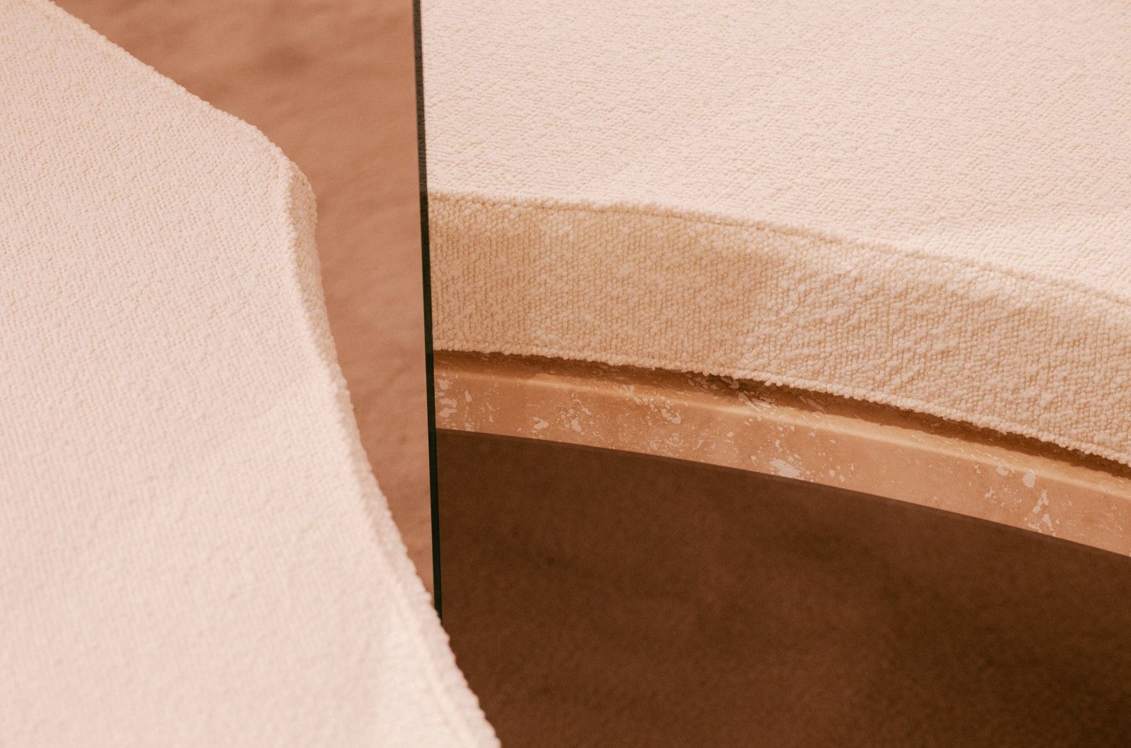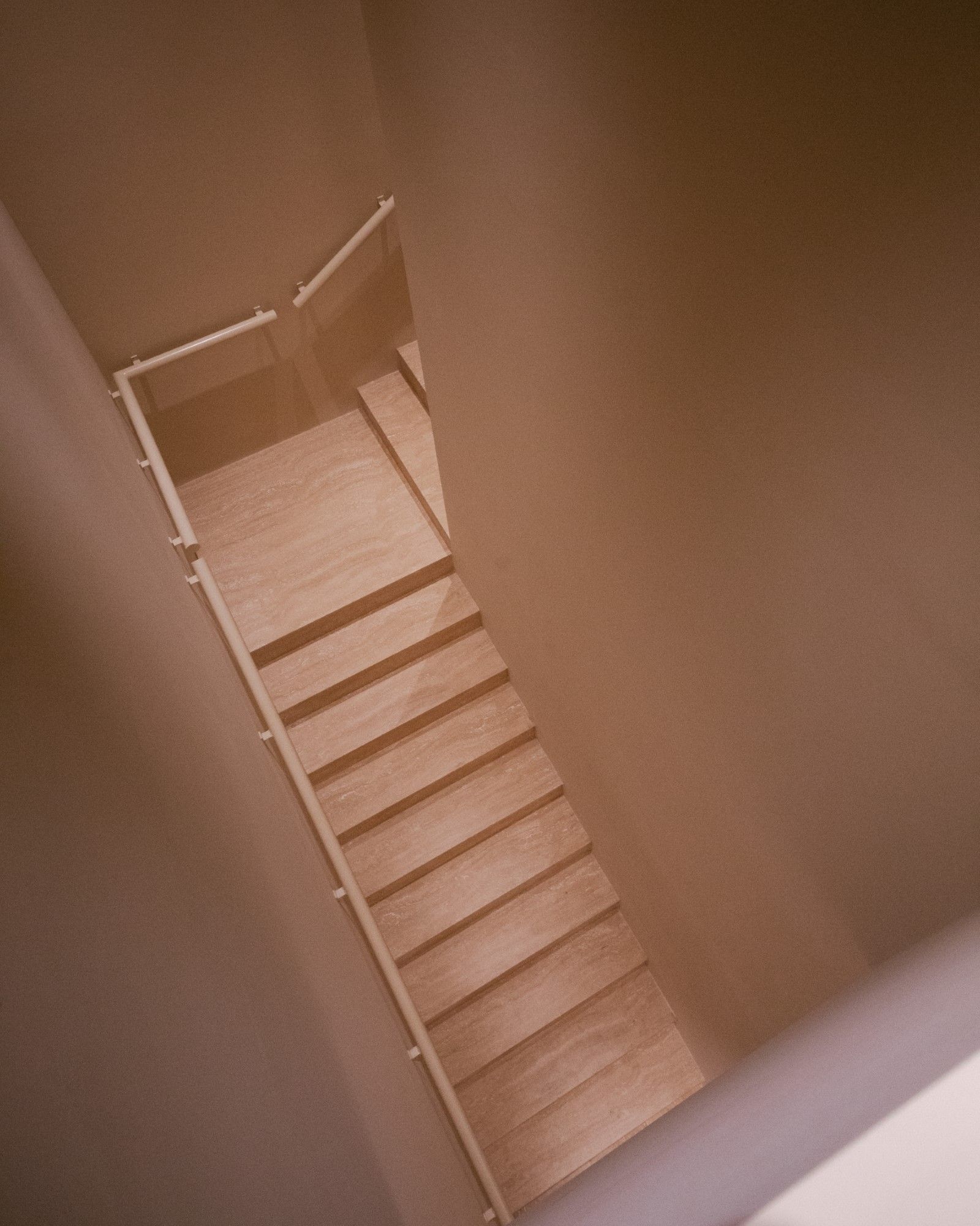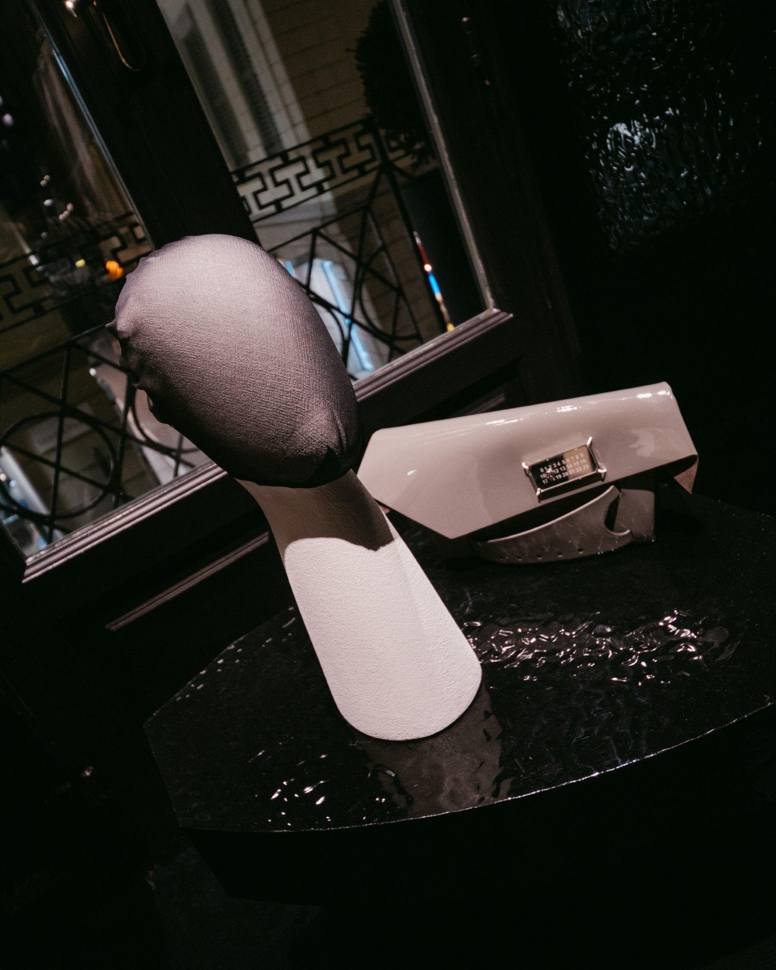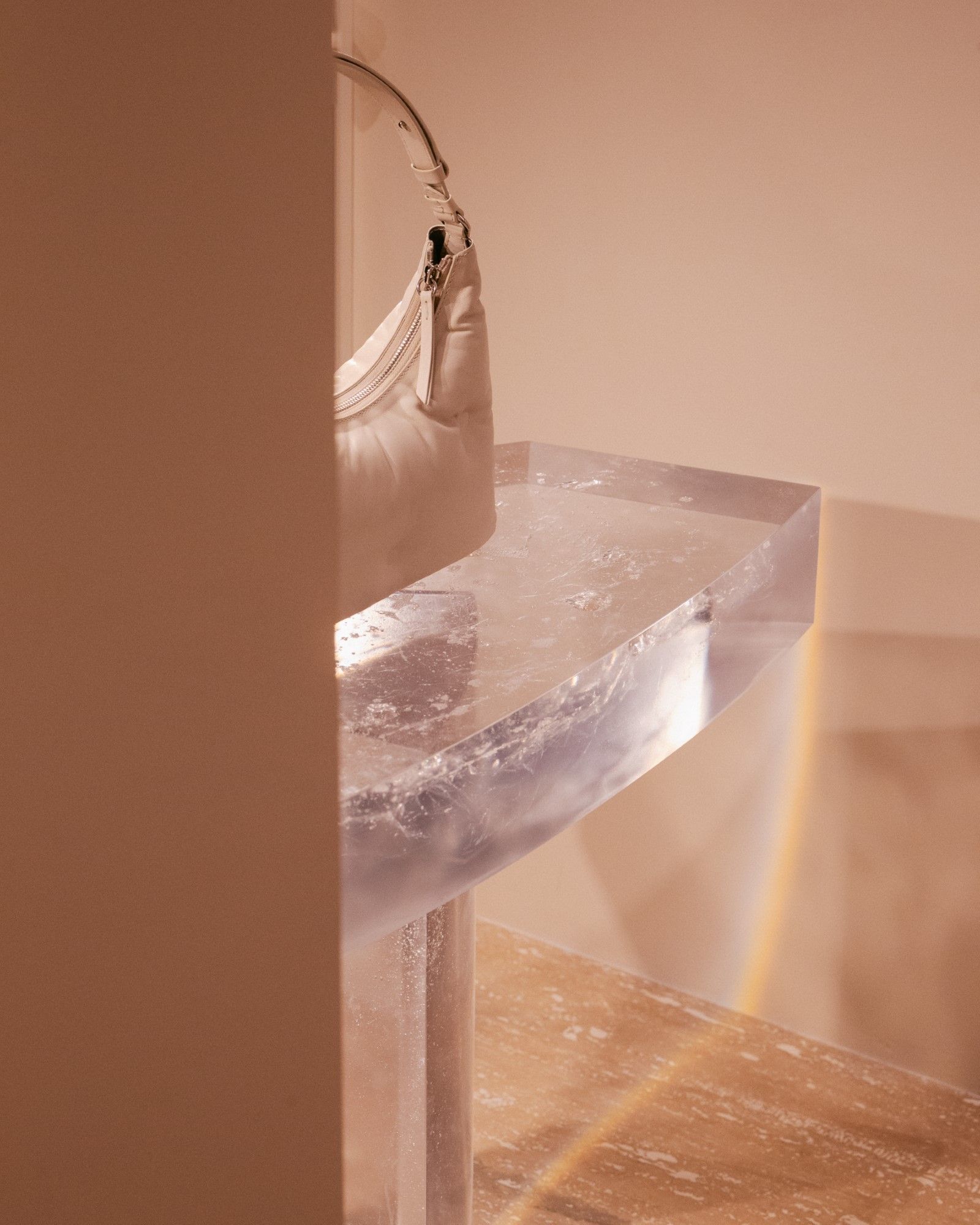 Le pareti all’interno, mantenute nella tonalità naturale del gesso, riflettono gli anonimati delle fodere interne trasformando in decor la filosofia della maison e in particolare il colore bianco tipico di Margiela – così come il suo interesse verso la decostruzione. Il tema della decostruzione torna anche negli arredi, e nello specifico nei mobili Misfit progettati per ricordare oggetti classici e riconoscibili, ma ri-concettualizzati nella loro forma. La tecnica del décortiqué viene applicata su scaffali, tavoli da esposizione e sedute intagliate in travertino tinto, le cui rientranze naturali sono riempite con resina epossidica in contrasto con il colore bianco. I soffitti e i camerini, invece, i luoghi più intimi della boutique, hanno pareti rivestite da diversi strati di vernice spazzolata a mano di colore verde scuro che crea una profonda lucentezza che riecheggia negli armadietti in lacca giapponese.