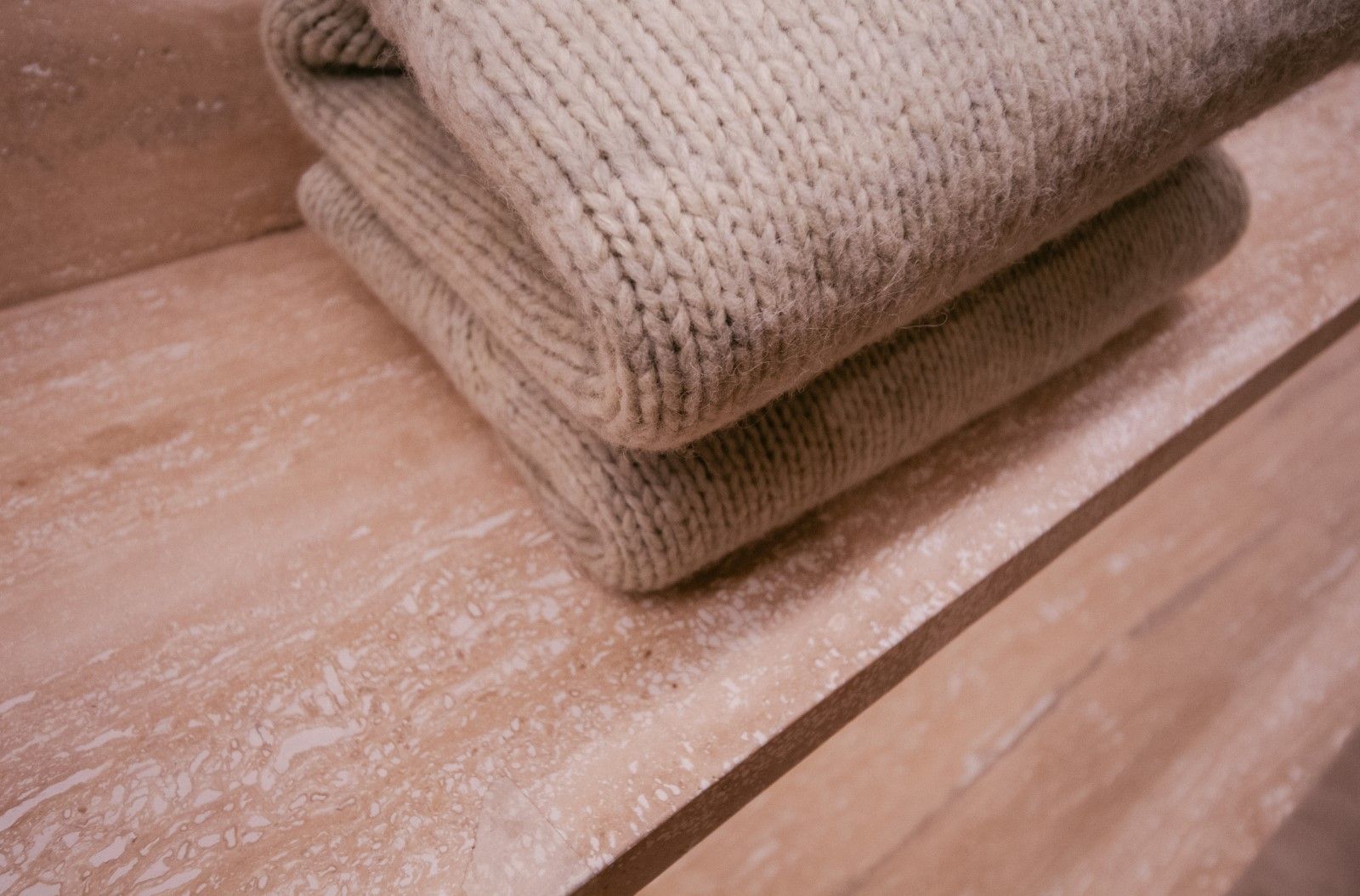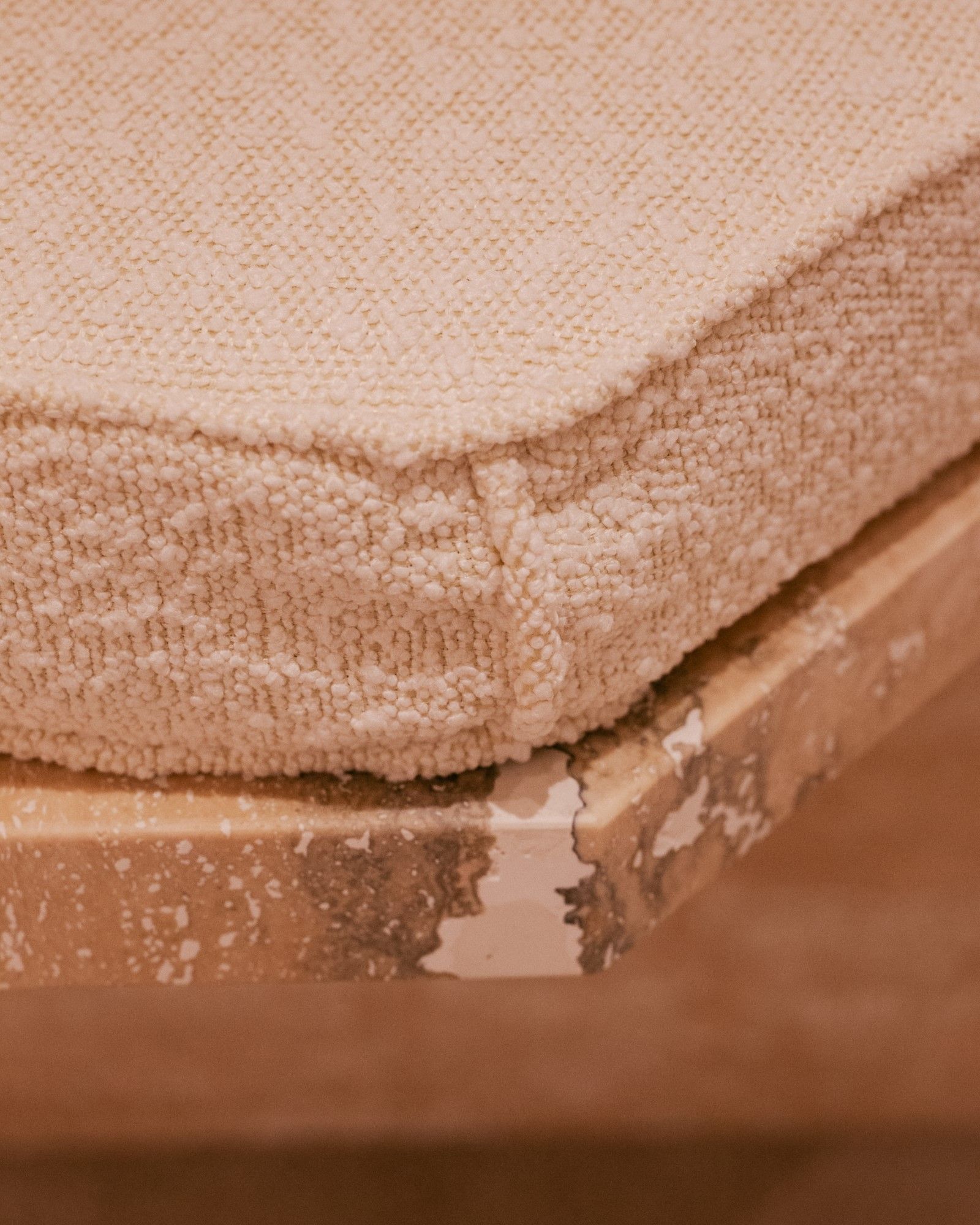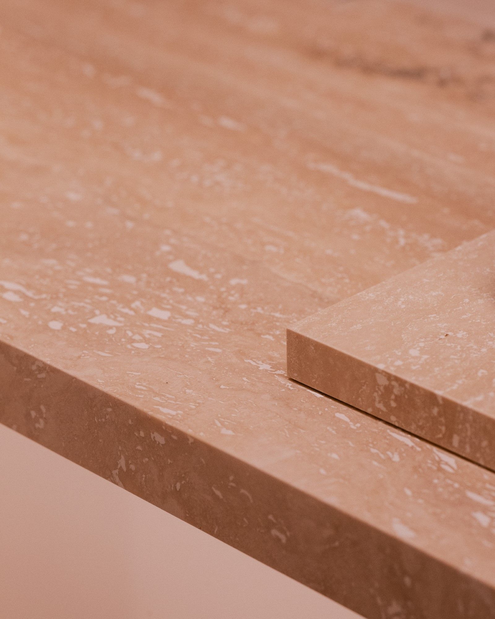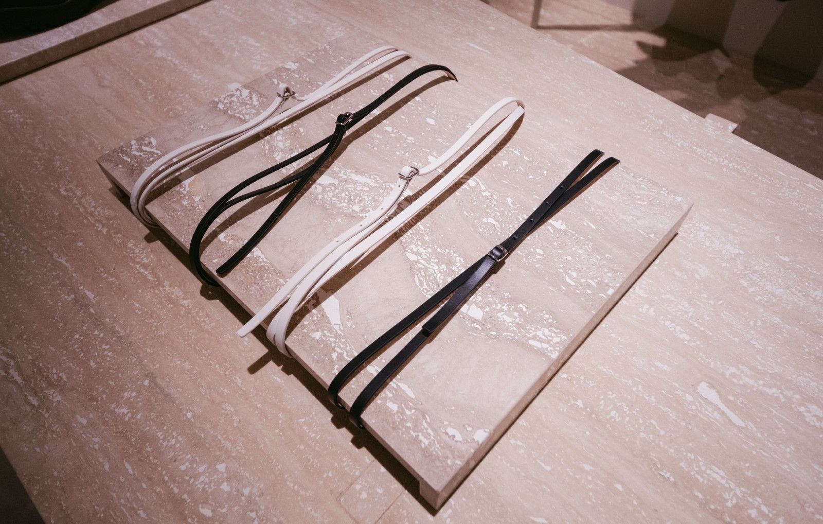 Le pareti all’interno, mantenute nella tonalità naturale del gesso, riflettono gli anonimati delle fodere interne trasformando in decor la filosofia della maison e in particolare il colore bianco tipico di Margiela – così come il suo interesse verso la decostruzione. Il tema della decostruzione torna anche negli arredi, e nello specifico nei mobili Misfit progettati per ricordare oggetti classici e riconoscibili, ma ri-concettualizzati nella loro forma. La tecnica del décortiqué viene applicata su scaffali, tavoli da esposizione e sedute intagliate in travertino tinto, le cui rientranze naturali sono riempite con resina epossidica in contrasto con il colore bianco. I soffitti e i camerini, invece, i luoghi più intimi della boutique, hanno pareti rivestite da diversi strati di vernice spazzolata a mano di colore verde scuro che crea una profonda lucentezza che riecheggia negli armadietti in lacca giapponese.