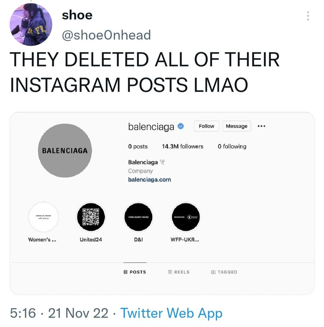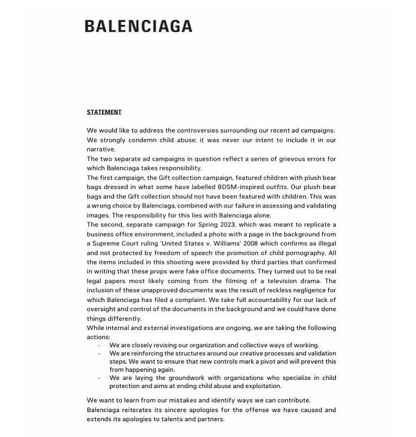 Una scelta bizzarra nel vestire il set, che ha subito dato il via alla polemica e che ha reso virali i tweet cospiratori di Lapine che, dopo il primo errore sulle due campagne, ha nuovamente sbagliato interpretando la mossa del brand di cancellare le immagini della campagna dal suo profilo Instagram come un'ammissione di colpa. In realtà il brand è solito ripulire il proprio feed Instagram tra una campagna e l'altra per fare spazio alle nuove release, in questo caso le immagini della sua collezione Garde-Robe primavera 2023. Nella giornata di ieri però Balenciaga, che aveva già disattivato i commenti sulla sua pagina Instagram, ha pubblicato una Story scusandosi per l'accaduto. «Le nostre borse di peluche non avrebbero dovuto essere presenti con i bambini in questa campagna - si legge nella dichiarazione - abbiamo immediatamente rimosso la campagna da tutte le piattaforme». Due ore dopo, il brand ha pubblicato un’ulteriore storia: «Stiamo intraprendendo un'azione legale contro le parti responsabili della creazione del set e dell'inclusione di articoli non approvati per il nostro servizio fotografico della campagna Spring 23. Siamo per la sicurezza e il benessere dei bambini».