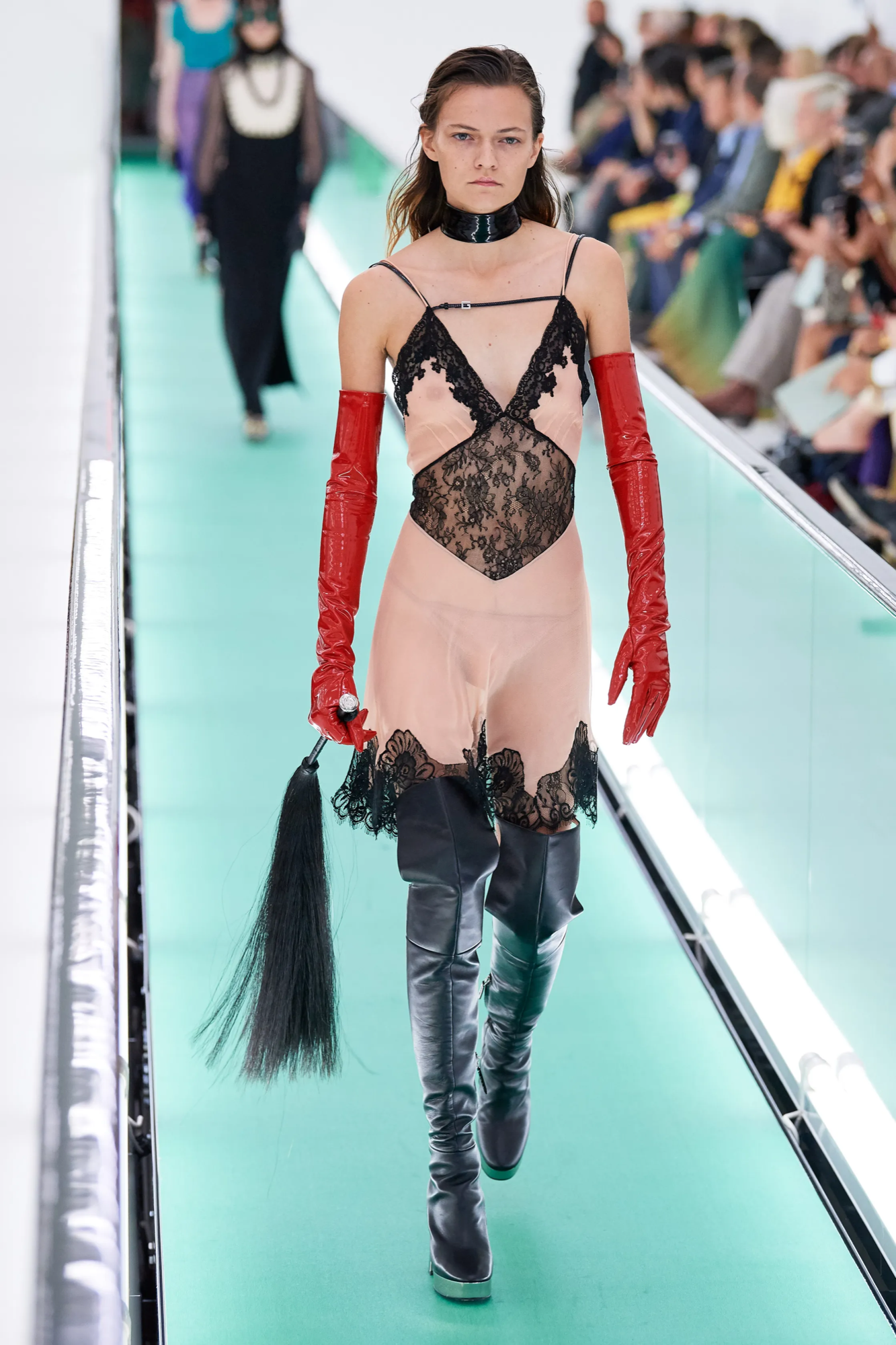 Più che un designer, Alessandro Michele si è sempre definito un archeologo della moda. La sua passione per il costume, il teatro e l’arte ha trovato negli show per Gucci un’estensione fisica e narrativa del sui processo creativo. Basti ricordare l’apertura della collezione SS20 dove i modelli, in camicie di forza bianche, camminavano come se anestetizzati su un tapis roulant. La riflessione con la quale Alessandro Michele è partito per comporre questa collezione arriva direttamente da Sorvegliare e punire, il saggio in cui Michel Foucault ha analizzato il sistema di controllo attraverso il quale il potere trasforma tutto in Panopticon, l’occhio in grado di controllare il movimento di tutto e di tutti.