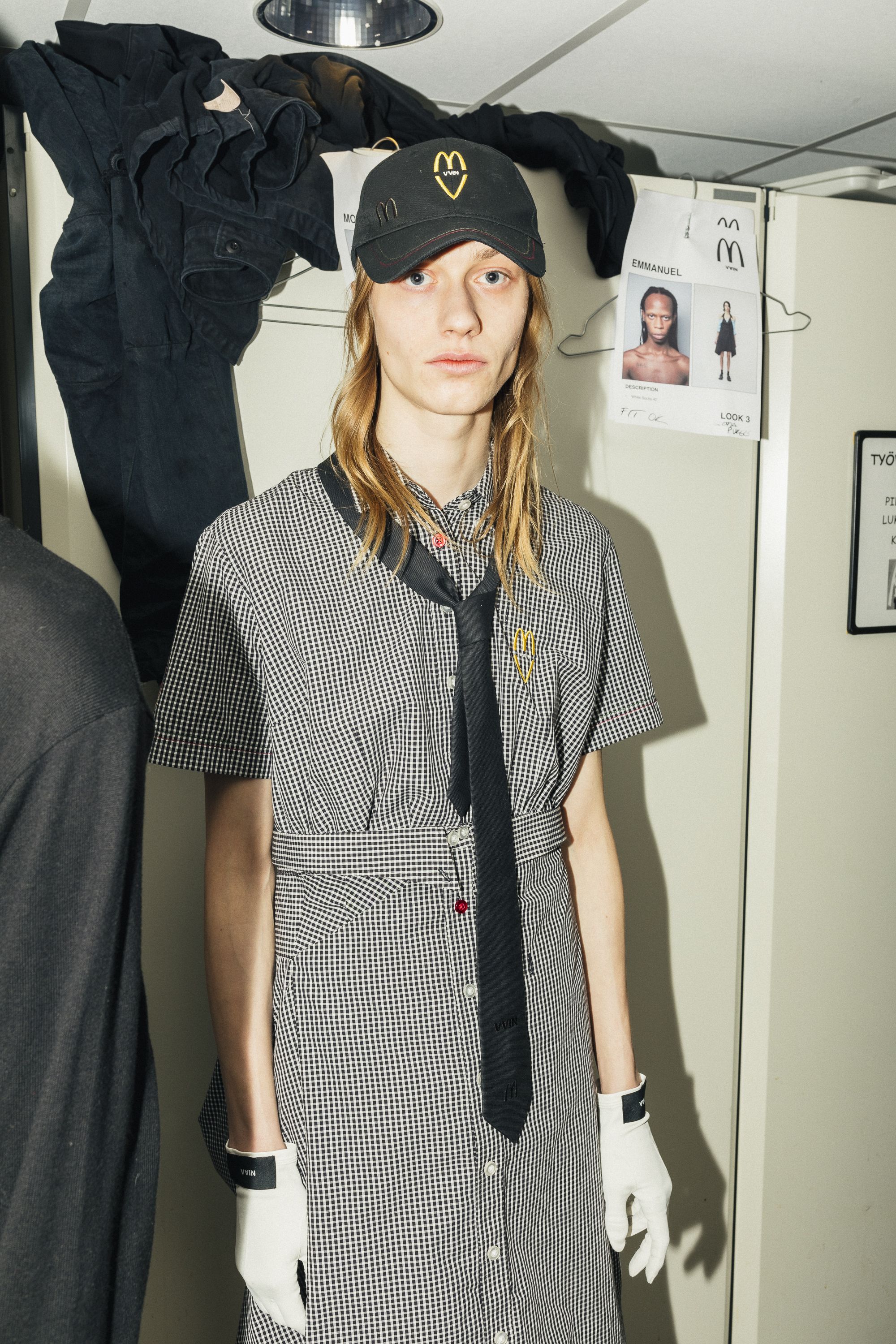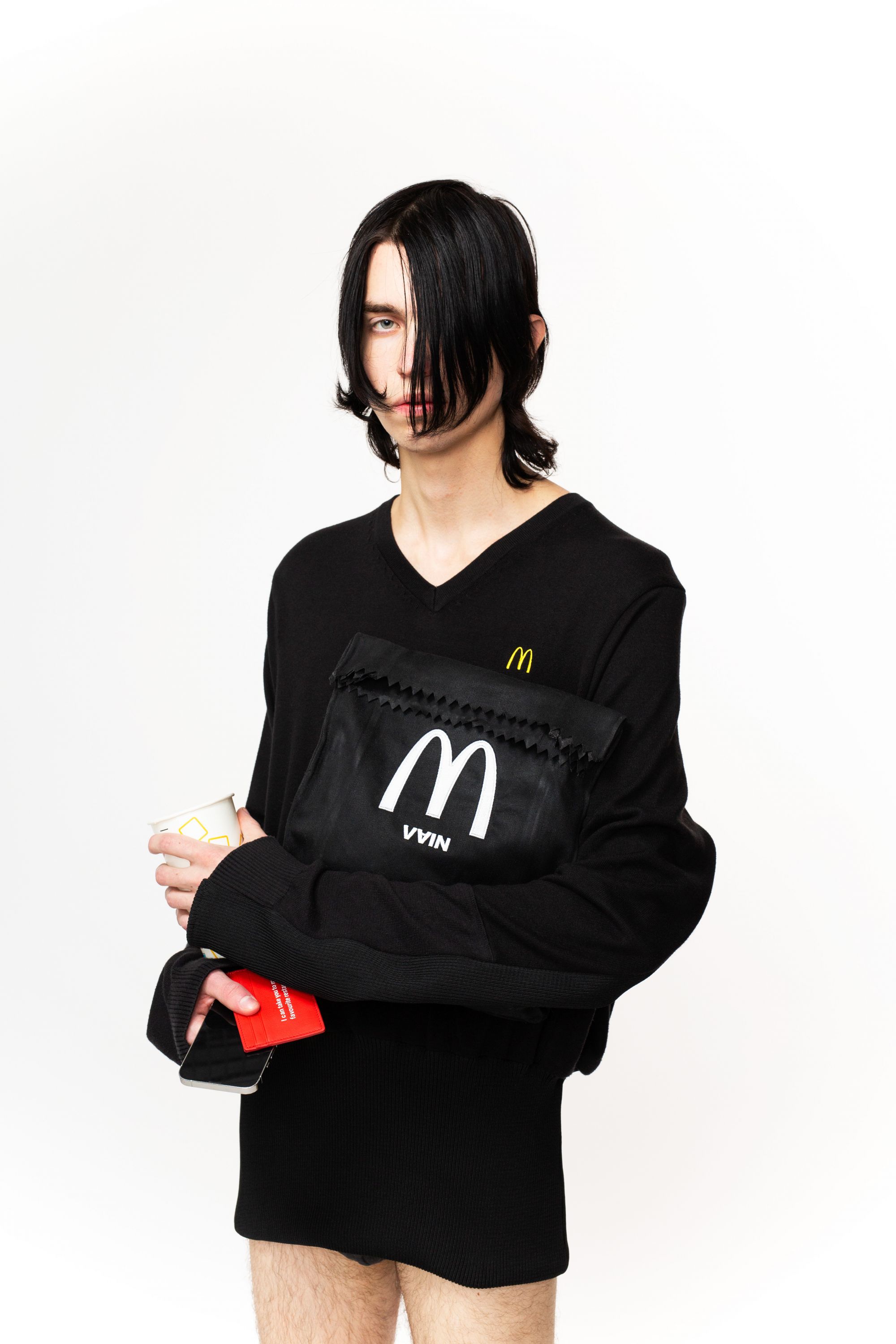 «McDonald's Finlandia ha un curriculum di collaborazioni degne di nota con giovani artisti finlandesi. Ci hanno contattato chiedendoci se fossimo interessati a fare qualcosa insieme. Naturalmente l'idea ci ha incuriosito e, dopo un brainstorming, ci siamo resi conto che potevamo fare qualcosa di veramente bello. Il direttore creativo Jimi Vain è sempre stato un appassionato di McDonald's, quindi ci è sembrata una cosa naturale da fare» ci hanno raccontato. L’idea di archivio e di rivisitazione sono stati i pilastri fondanti di questa collaborazione che ha visto la trasposizione dei codici estetici della catena di ristoranti nel mondo della moda. «Fondamentalmente abbiamo cercato di mettere le mani su quanti più vecchi abiti del personale di McDonald's possibile. Ci siamo procurati i singoli capi da diverse sedi McDonald's in tutto il Paese e abbiamo anche preso vecchi striscioni in tessuto di McDonald's e li abbiamo riconvertiti in capi di abbigliamento» ci hanno detto i creativi. L’idea di uniforme - l’accezione è allo stesso tempo simbolica, valoriale e legata alle forme di gerarchia che scaturiscono dal potere - è stata ciò che ha ispirato e strutturato l’intero progetto. «La sfida è stata: come possiamo inserire la nostra estetica in queste uniformi da lavoro, pur mantenendo l'identità visiva del vero abbigliamento del personale McDonald's? Dovevamo trovare il punto di equilibrio perfetto, facendo in modo che queste due cose si fondessero in armonia» ci ha svelato il team.