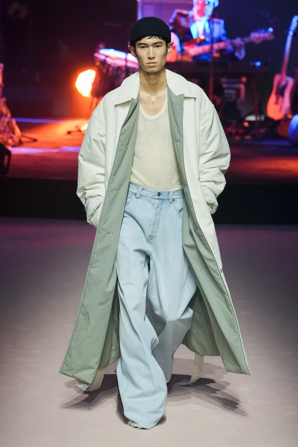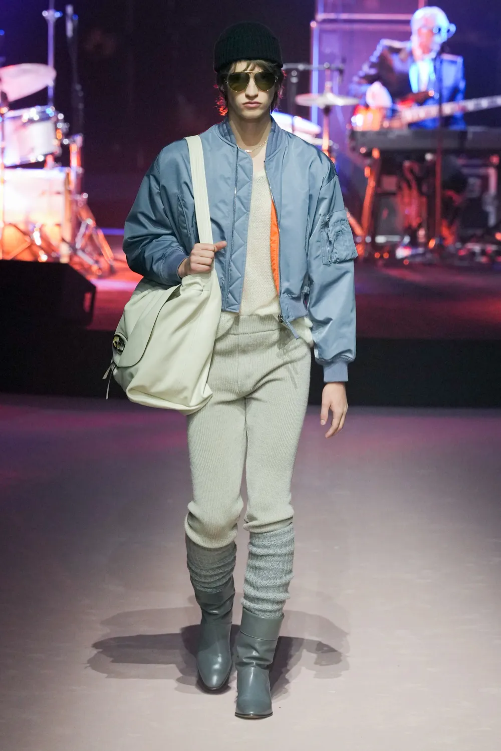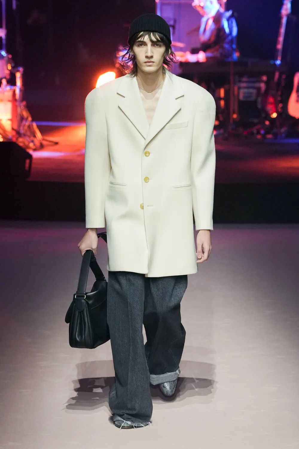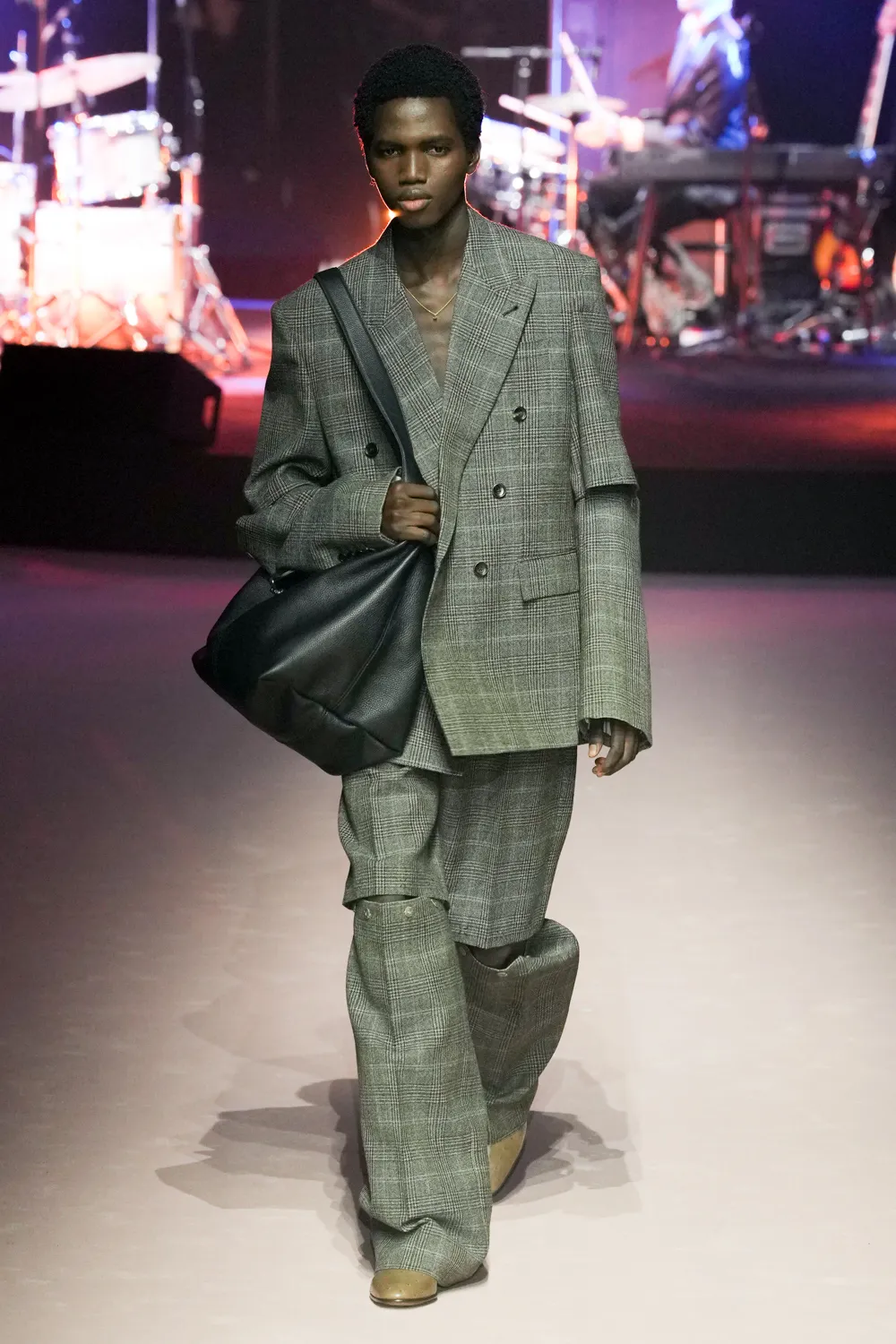 Lunghi cappotti, jeans oversize, blazer e berretti, bomber di nylon, oltre che una dose enorme di borse scultoree ma per lo più monocrome e minimaliste – eccezioni a parte (ed eccezioni non sono mancate, dai jeans ricoperti dal monogram fatto con i cristalli, agli stivali di vernice logati e allo sportswear) la collezione FW23 di Gucci che ha aperto la Milan Fashion Week Men’s sembra volersi emancipare dall’identità stabilita di Alessandro Michele in sette anni di esuberante regno creativo. Con una musica rock firmata dai Ceramic Dog a dare alla collezione un deciso graffio grunge, il brand sembra voler tornare con i piedi per terra, lontano da sincretismi, ibridazioni, riferimenti pop e voli concettuali. Il risultato è meno rivoluzionario di quanto molti speravano ma rimette la metaforica palla al centro, stabilendo un nuovo e più neutrale corso in attesa dell’arrivo di un nuovo direttore creativo capace di muovere il brand verso una direzione più precisa. Il risultato non è definitivo ma è sicuramente rinfrescante, come quando Alice esce dallo sgargiante e allucinatorio Paese delle Meraviglie e ritorna nel suo normale, rassicurante giardino inglese.