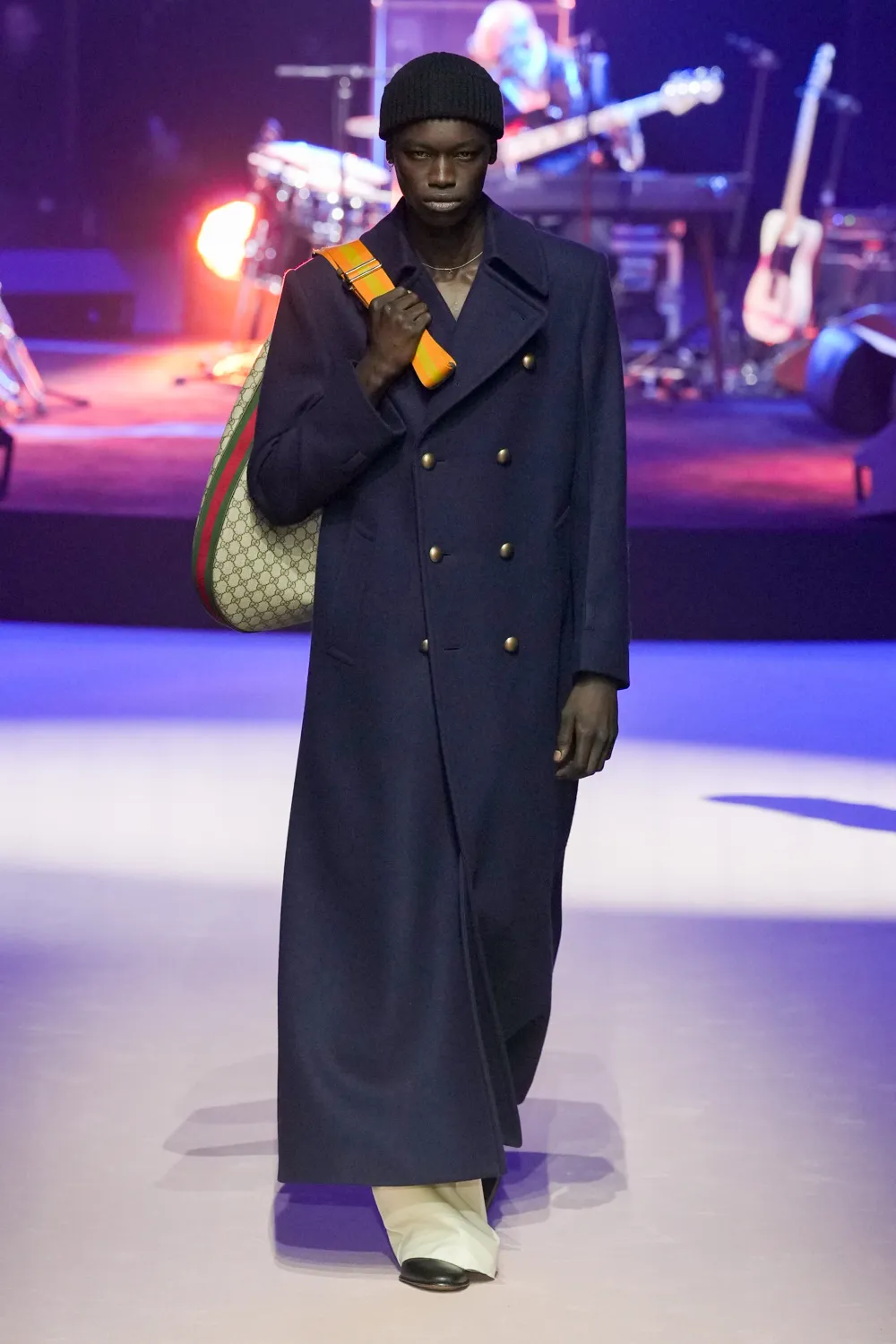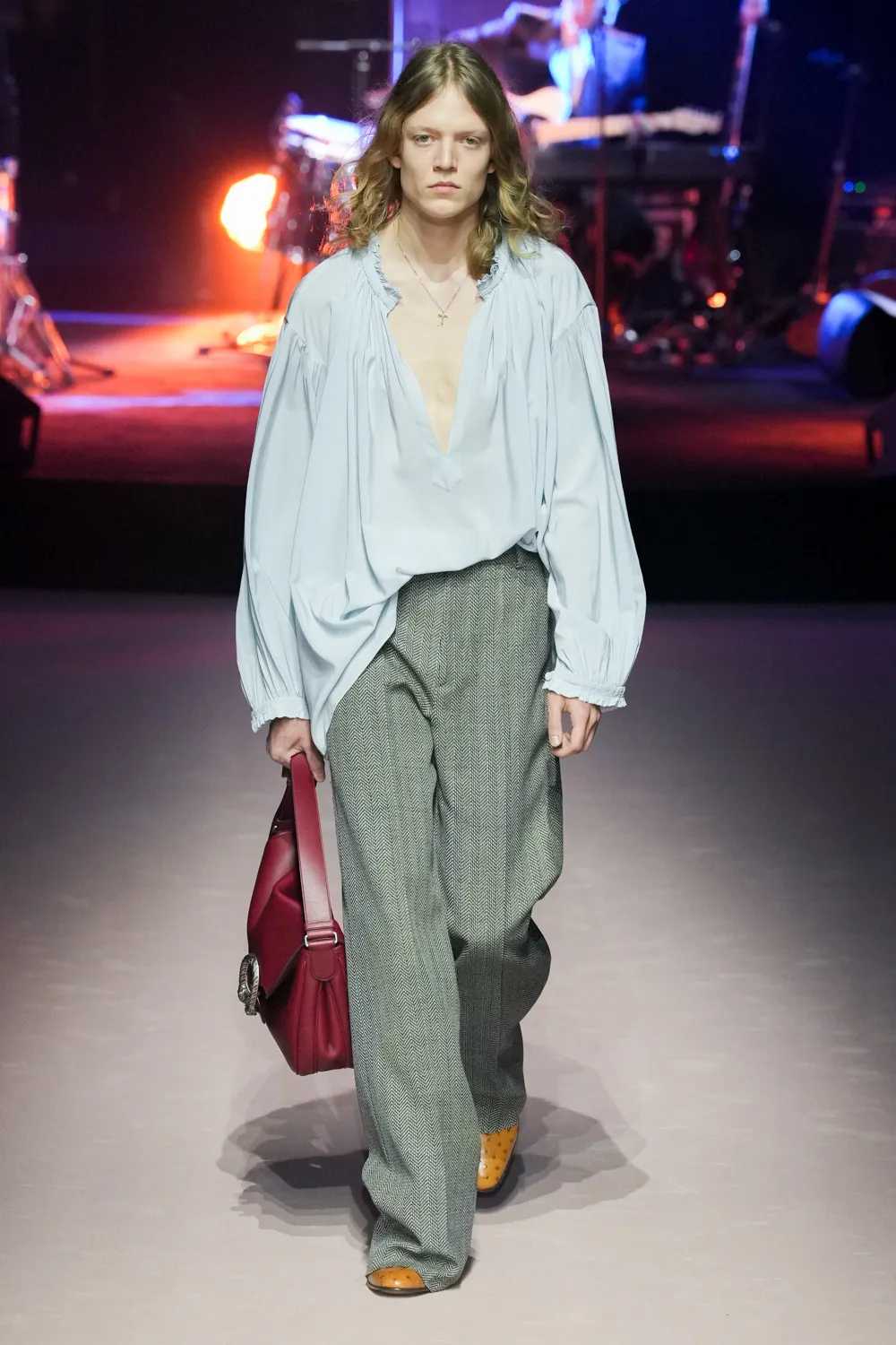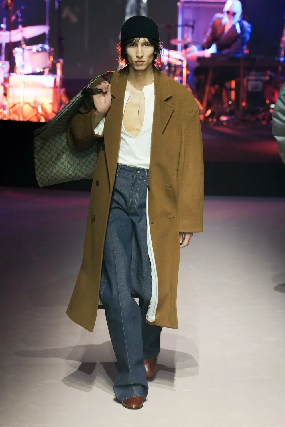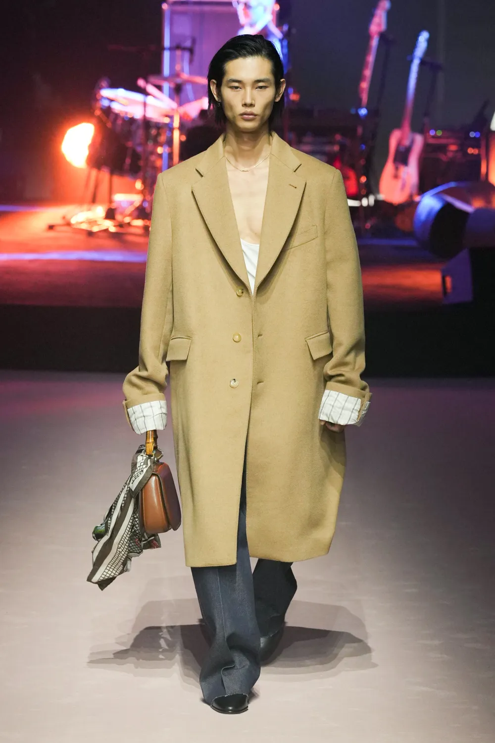 Lunghi cappotti, jeans oversize, blazer e berretti, bomber di nylon, oltre che una dose enorme di borse scultoree ma per lo più monocrome e minimaliste – eccezioni a parte (ed eccezioni non sono mancate, dai jeans ricoperti dal monogram fatto con i cristalli, agli stivali di vernice logati e allo sportswear) la collezione FW23 di Gucci che ha aperto la Milan Fashion Week Men’s sembra volersi emancipare dall’identità stabilita di Alessandro Michele in sette anni di esuberante regno creativo. Con una musica rock firmata dai Ceramic Dog a dare alla collezione un deciso graffio grunge, il brand sembra voler tornare con i piedi per terra, lontano da sincretismi, ibridazioni, riferimenti pop e voli concettuali. Il risultato è meno rivoluzionario di quanto molti speravano ma rimette la metaforica palla al centro, stabilendo un nuovo e più neutrale corso in attesa dell’arrivo di un nuovo direttore creativo capace di muovere il brand verso una direzione più precisa. Il risultato non è definitivo ma è sicuramente rinfrescante, come quando Alice esce dallo sgargiante e allucinatorio Paese delle Meraviglie e ritorna nel suo normale, rassicurante giardino inglese.