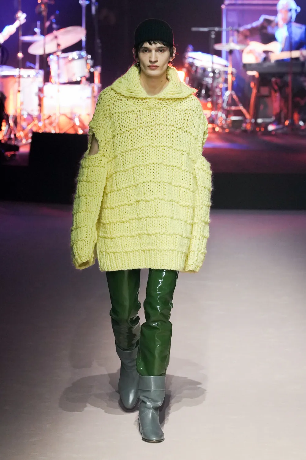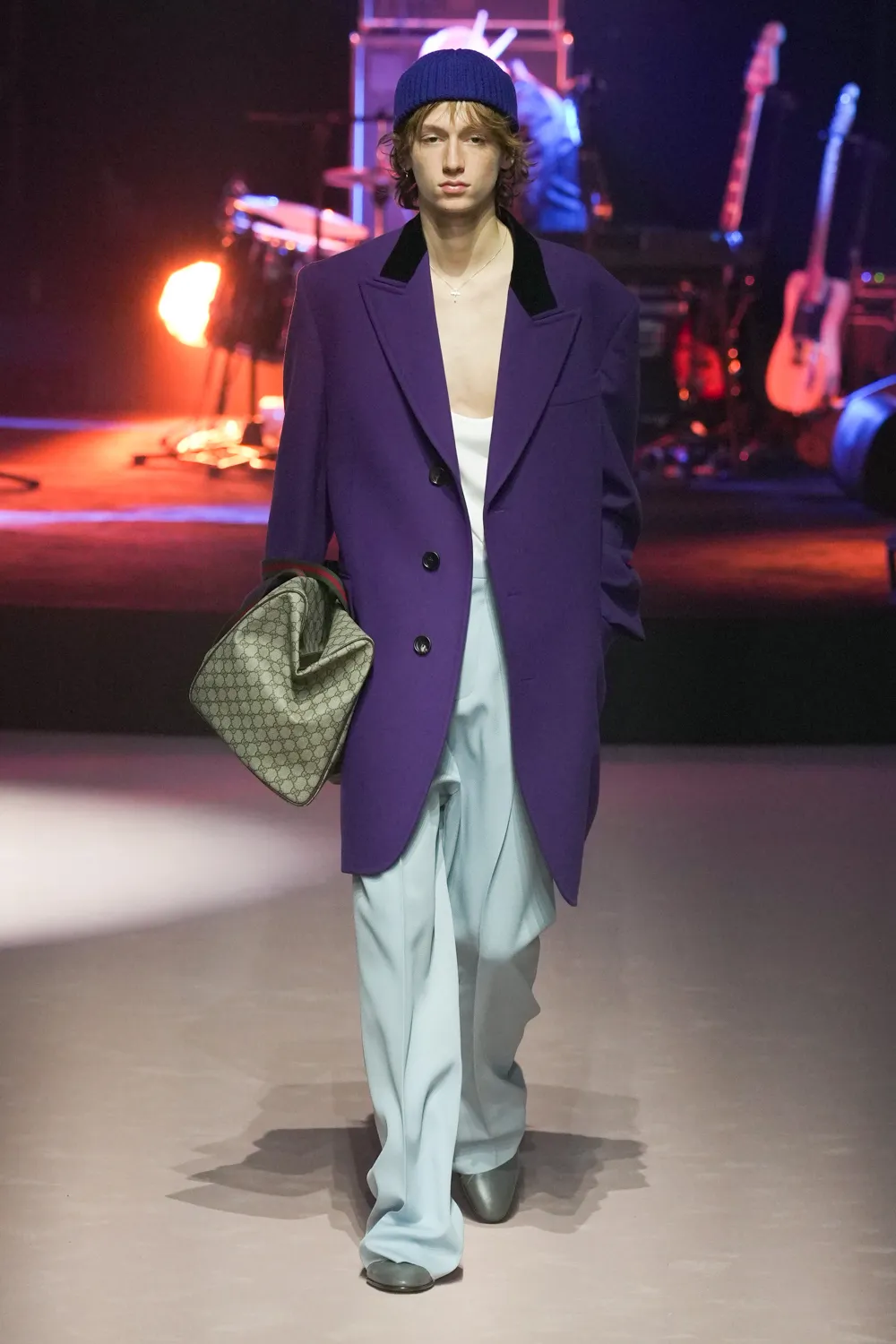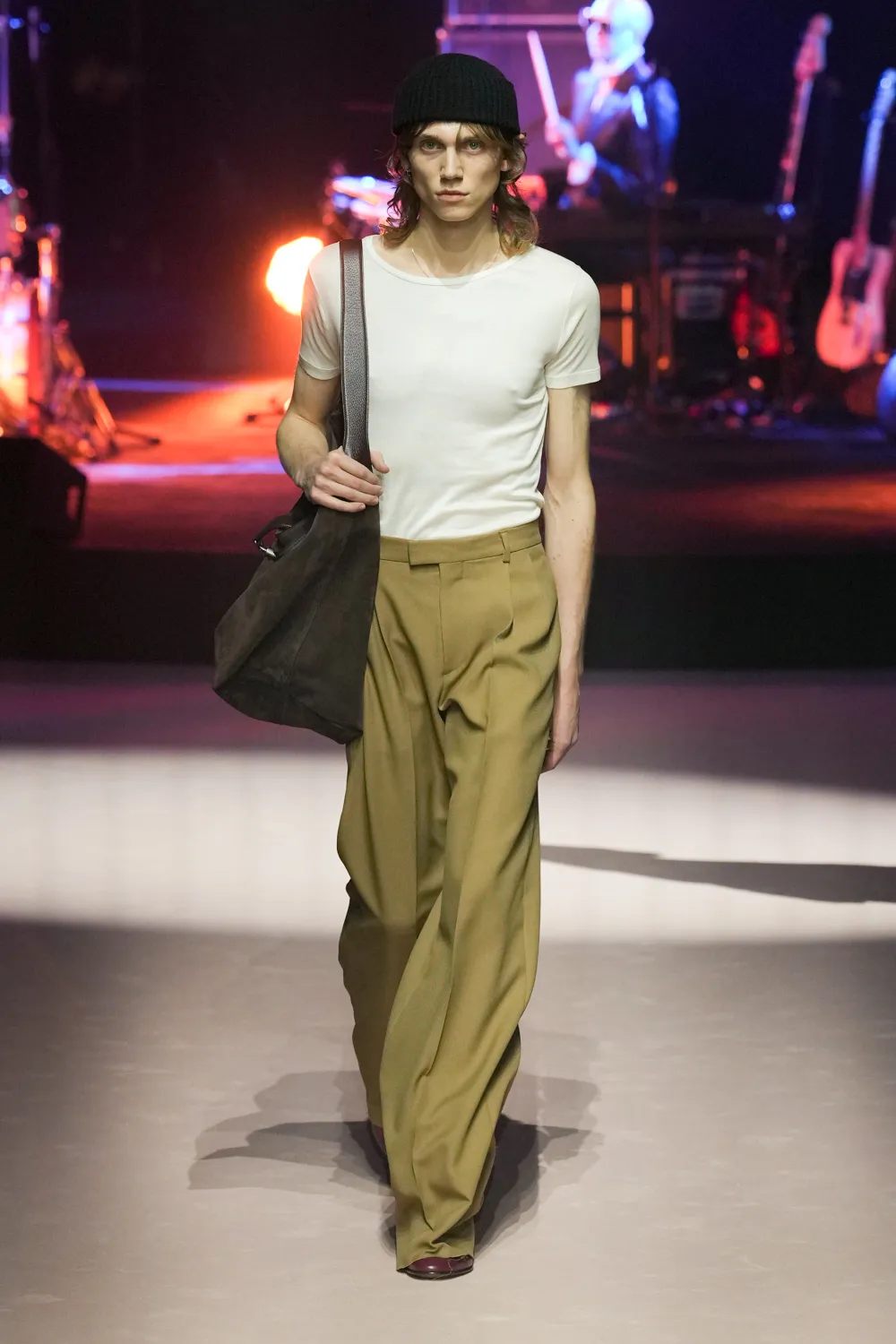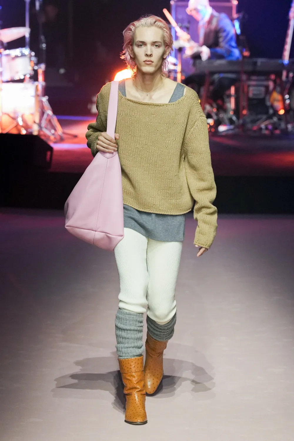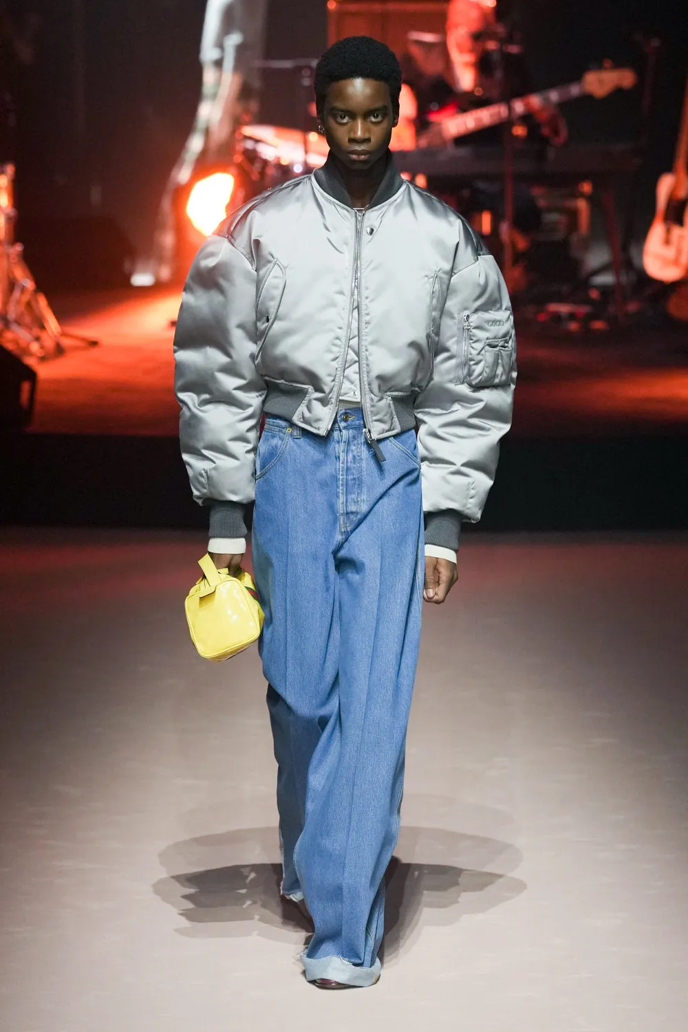 Lunghi cappotti, jeans oversize, blazer e berretti, bomber di nylon, oltre che una dose enorme di borse scultoree ma per lo più monocrome e minimaliste – eccezioni a parte (ed eccezioni non sono mancate, dai jeans ricoperti dal monogram fatto con i cristalli, agli stivali di vernice logati e allo sportswear) la collezione FW23 di Gucci che ha aperto la Milan Fashion Week Men’s sembra volersi emancipare dall’identità stabilita di Alessandro Michele in sette anni di esuberante regno creativo. Con una musica rock firmata dai Ceramic Dog a dare alla collezione un deciso graffio grunge, il brand sembra voler tornare con i piedi per terra, lontano da sincretismi, ibridazioni, riferimenti pop e voli concettuali. Il risultato è meno rivoluzionario di quanto molti speravano ma rimette la metaforica palla al centro, stabilendo un nuovo e più neutrale corso in attesa dell’arrivo di un nuovo direttore creativo capace di muovere il brand verso una direzione più precisa. Il risultato non è definitivo ma è sicuramente rinfrescante, come quando Alice esce dallo sgargiante e allucinatorio Paese delle Meraviglie e ritorna nel suo normale, rassicurante giardino inglese.