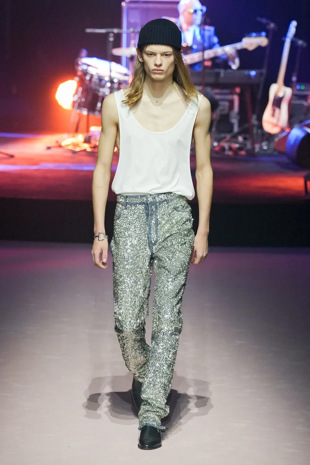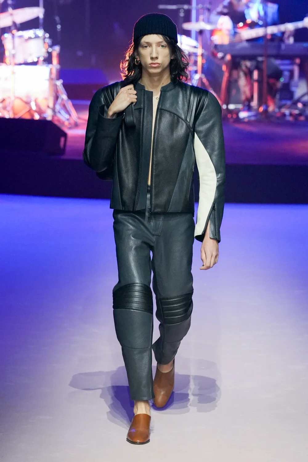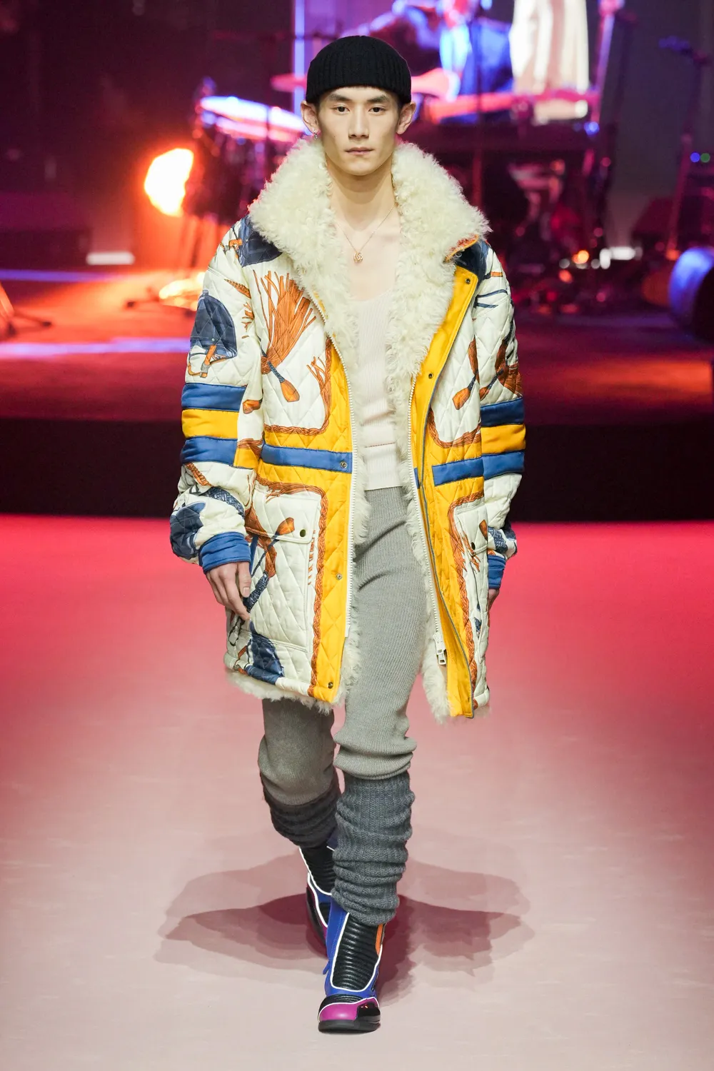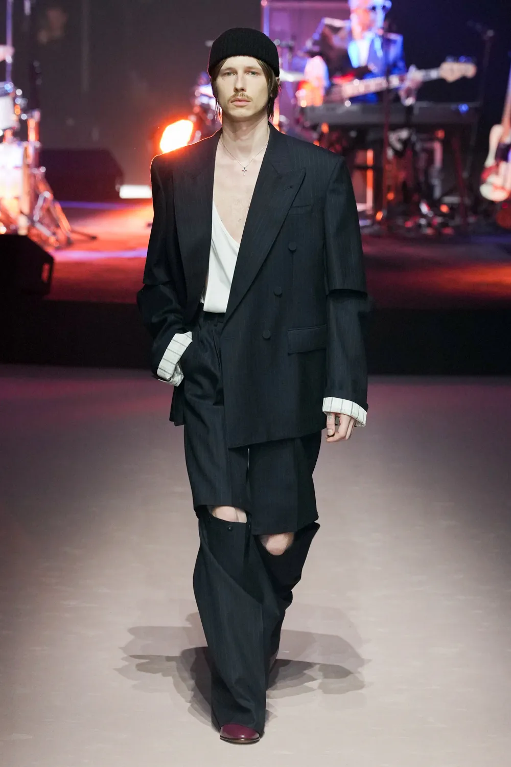 Lunghi cappotti, jeans oversize, blazer e berretti, bomber di nylon, oltre che una dose enorme di borse scultoree ma per lo più monocrome e minimaliste – eccezioni a parte (ed eccezioni non sono mancate, dai jeans ricoperti dal monogram fatto con i cristalli, agli stivali di vernice logati e allo sportswear) la collezione FW23 di Gucci che ha aperto la Milan Fashion Week Men’s sembra volersi emancipare dall’identità stabilita di Alessandro Michele in sette anni di esuberante regno creativo. Con una musica rock firmata dai Ceramic Dog a dare alla collezione un deciso graffio grunge, il brand sembra voler tornare con i piedi per terra, lontano da sincretismi, ibridazioni, riferimenti pop e voli concettuali. Il risultato è meno rivoluzionario di quanto molti speravano ma rimette la metaforica palla al centro, stabilendo un nuovo e più neutrale corso in attesa dell’arrivo di un nuovo direttore creativo capace di muovere il brand verso una direzione più precisa. Il risultato non è definitivo ma è sicuramente rinfrescante, come quando Alice esce dallo sgargiante e allucinatorio Paese delle Meraviglie e ritorna nel suo normale, rassicurante giardino inglese.