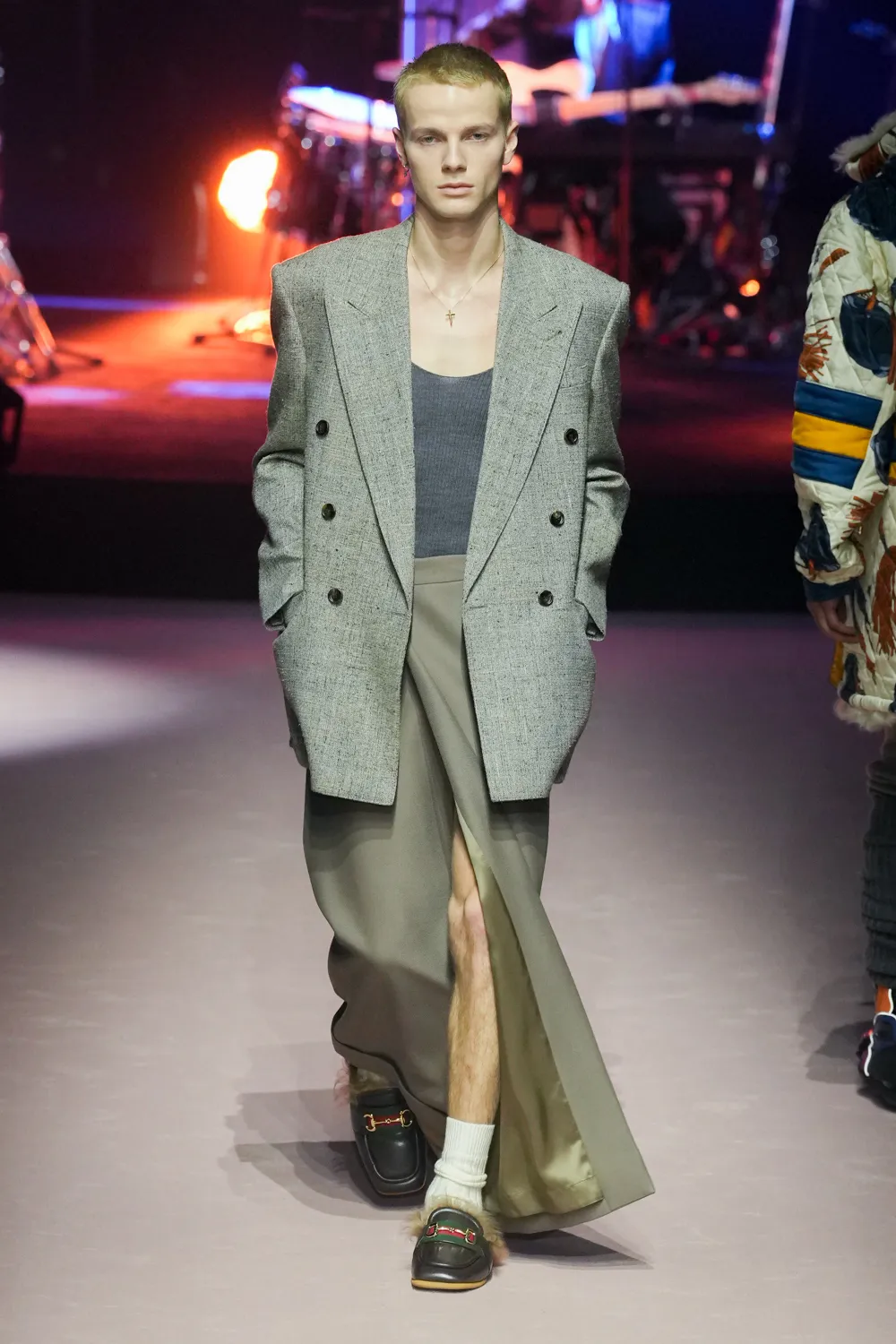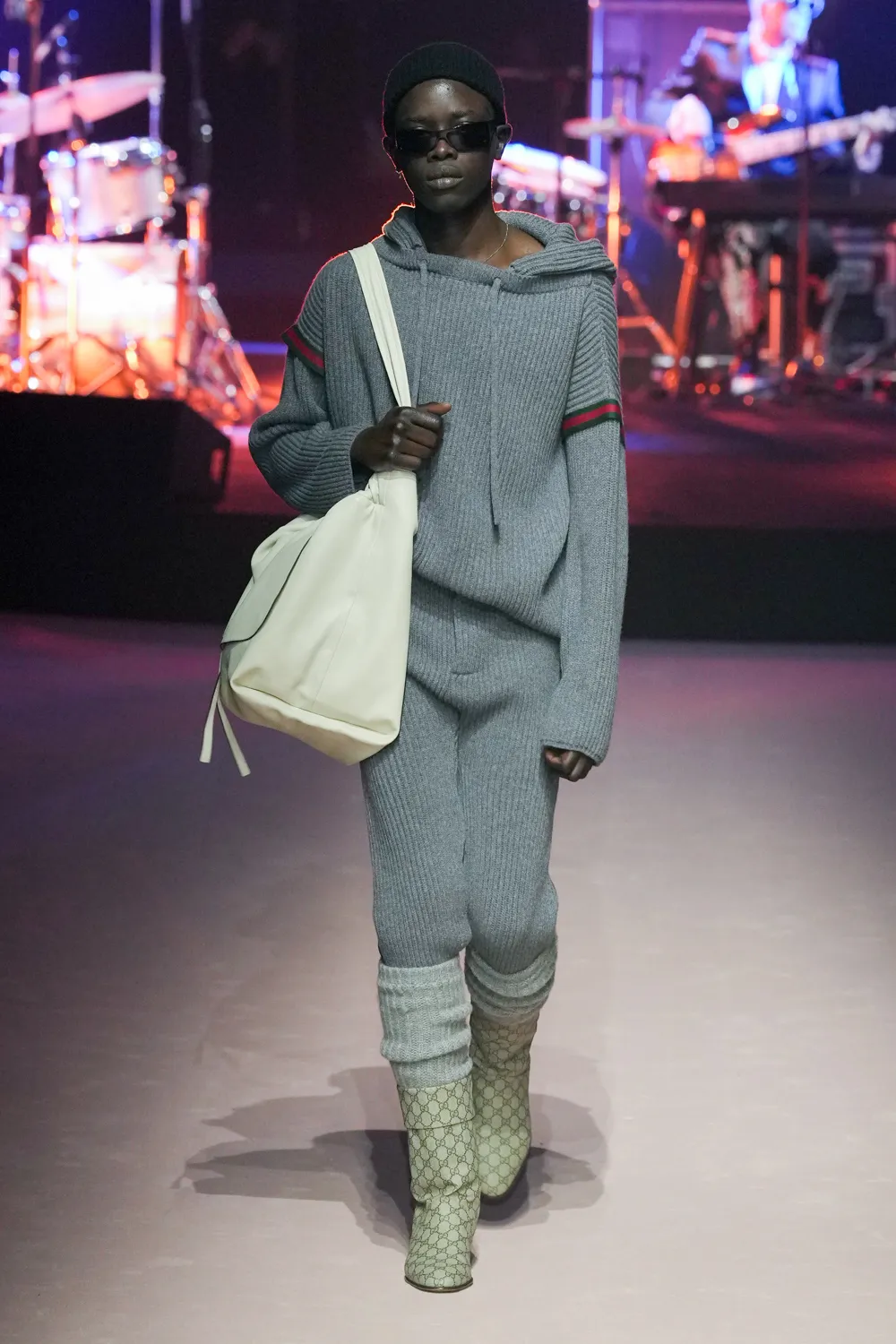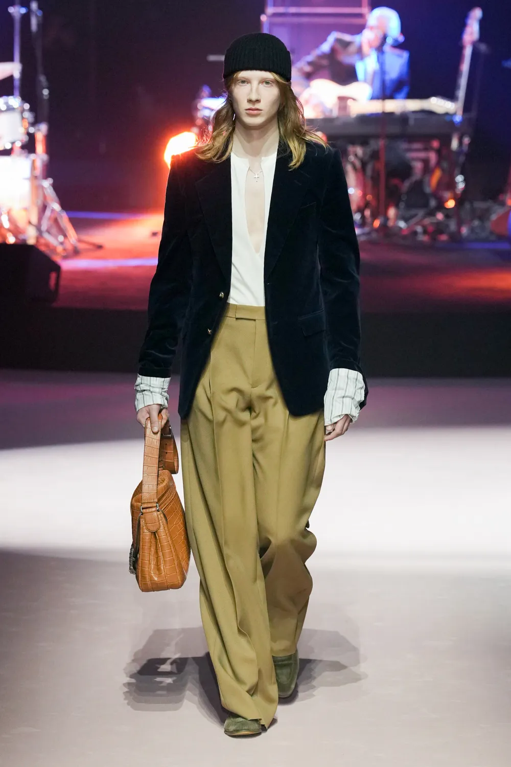 La collezione includeva, come dicevamo, pezzi più esuberanti che trovavano una collocazione forse un po’ imprecisa nel nuovo, fondato discorso identitario del brand. È chiaro che a una certa esuberanza non si può rinunciare – e quei look intendono significare che l’energia e il vitalismo di Gucci sono ancora lì, tornati allo stato di cellule staminali il cui DNA va ancora strutturandosi. In effetti, essendo stato Alessandro Michele il campione del massimalismo di Gucci, è proprio la parte più rock-chic e minimalista la più innovativa e coesa della collezione, quella capace di dichiarare con forza e sottigliezza insieme che i tempi sono cambiati e che, pur senza perdere il proprio giovanilismo, Gucci ha chiuso con bizzarrie e barocchismi ed è tornato a essere un brand ragionevole, indossabile, che vende più vestiti “veri” che concept. Questo non vale comunque a dire che il tocco di Michele sia sparito come per magia. Rimane ancora molto del moto impresso al brand dal designer romano, nei colori, nella mescolanza di glamour d’altri tempi e rudezza giovanile. L’eredità dell'ex-direttore creativo c’è ancora ma è, per l’appunto, un’eredità, il lascito di un passato recente che non di meno si trova al di qua del presente, nel novero delle “ere” trascorse di Gucci insieme a quelle di Tom Ford e Frida Giannini. Ma il futuro, senza dubbio, arriverà.