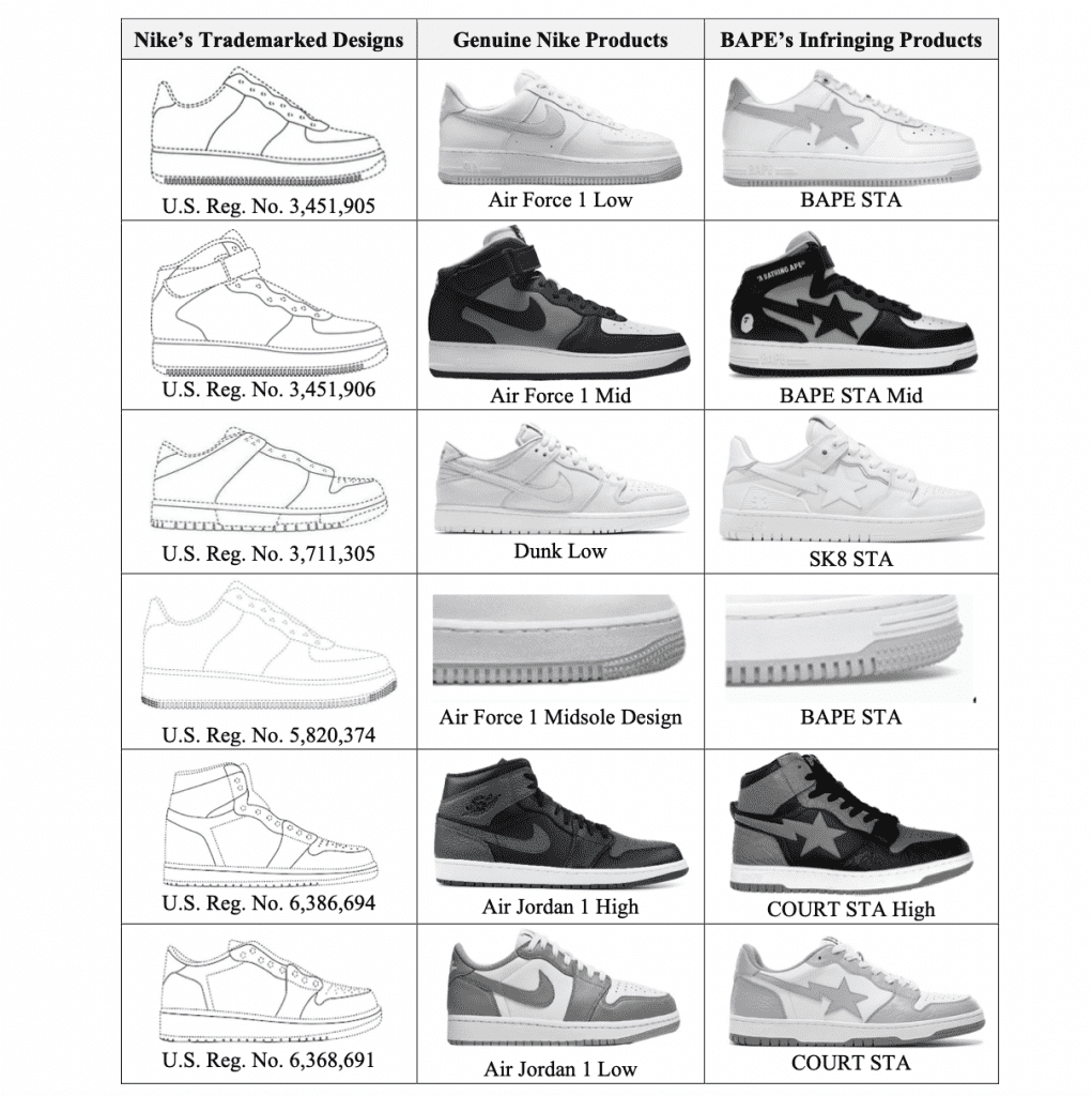 Secondo i documenti del tribunale, Nike afferma che l’ingresso delle BAPE STA nel mercato americano avvenuto nel 2005 già costituiva un’infrazione anche se era «minimo e incosistente» dato che fino al 2021 le vendite delle BAPE STA costituivano «una minuscola frazione dei milioni di paia che Nike vende ogni anno», creando una situazione di ambiguità accentuata dall’apertura e successiva chiusura di negozi BAPE oltre che dal passaggio di mano del brand. Dal 2021 in avanti, sempre secondo Nike, il brand sarebbe tornato di prepotenza nel mercato statunitense producendo un gran numero di modelli e variazioni della BAPE STA che sono «riproduzioni quasi identiche dei design delle Air Force 1, Air Jordan 1 e Dunk». Proprio questa espansione e diffusione sul mercato statunitense ha irritato Nike che solo ora si è decisa a fare causa al brand chiedendo un provvedimento ingiuntivo che impedisca a BAPE di continuare a produrre, commercializzare e vendere le BAPE STA, e un risarcimento in denaro che corrisponde a tre volte l'importo dei danni compensativi e dei profitti maggiorati.