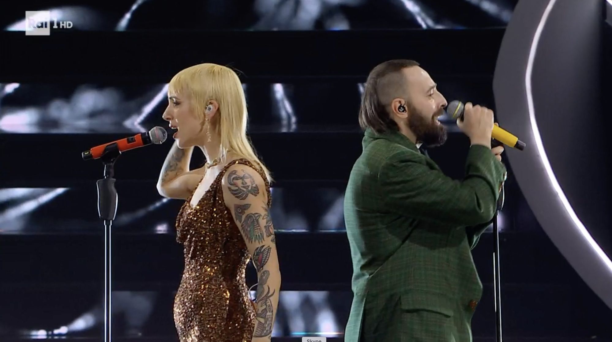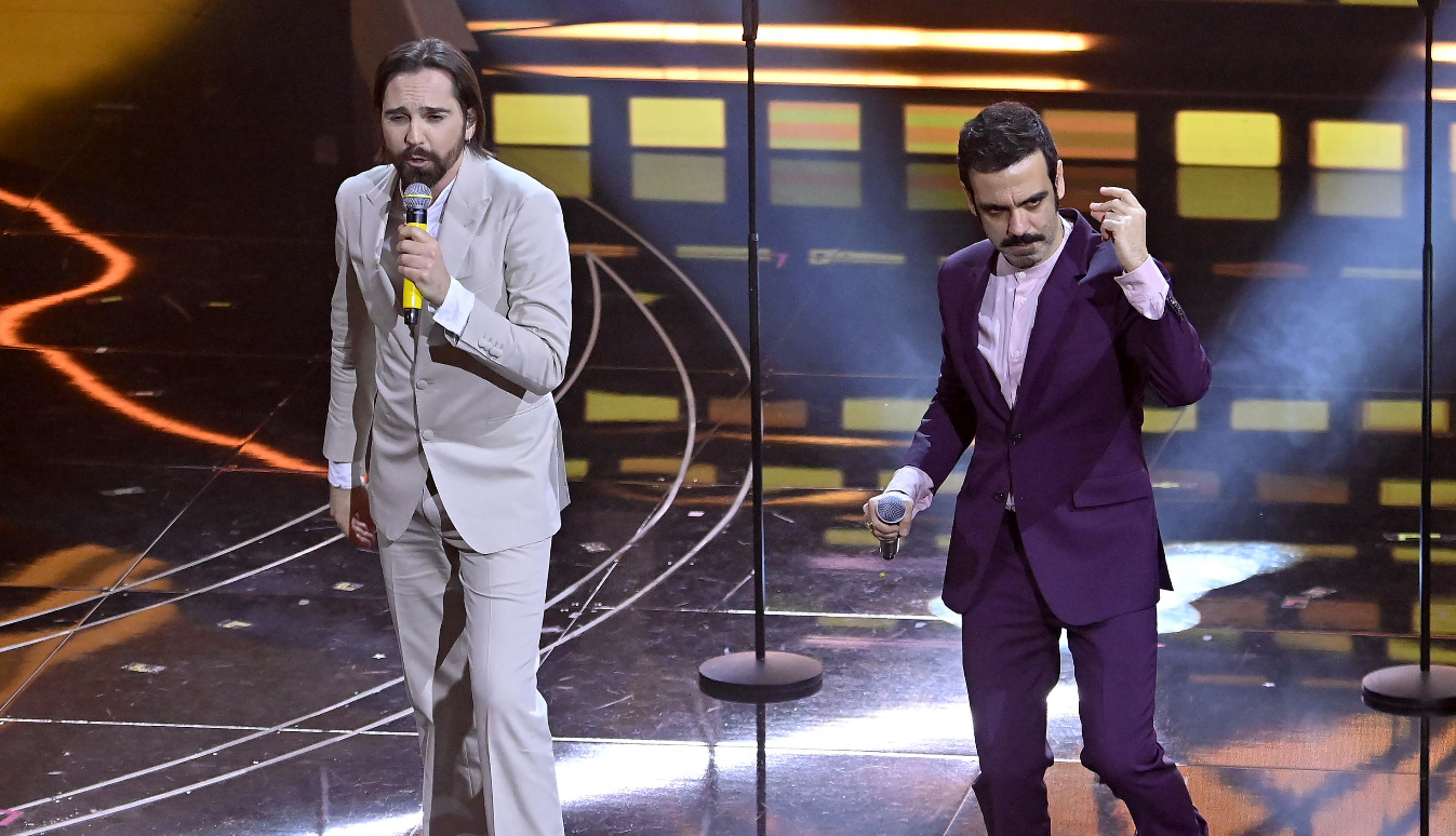 Durante la seconda serata però c’è stata una rottura: Colapesce e Dimartino si sono presentati con dei rarissimi look compositi e dunque non dei total look strappati dalla sfilata o da abiti custom-made ma con uno styling fatto “come una volta” da Giuseppe Magistro. Nello specifico indossavano completi di Paul Smith e Sartoria Trinchese rispettivamente, camicie di Gaelle Paris, gioielli Damiani e scarpe di Scarosso e Pierantoni. Nessun brand immediatamente riconoscibile, dunque, ma anche un paio di look che discostano dal nuovo immaginario sanremese composto al 90% di glitter e lustrini. Che Colapesce e Dimartino rappresentino, nel bene e nel male, una nuova e ardita proposizione del menswear? Un’idea di normcore che, nell’epicentro dello spettacolo televisivo, dove tatuaggi sul viso e abiti genderless non scioccano più nessuno, offre un nuovo paradigma di trasgressione?