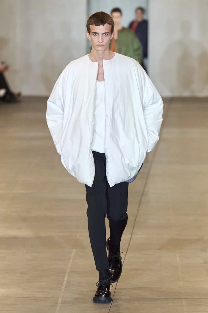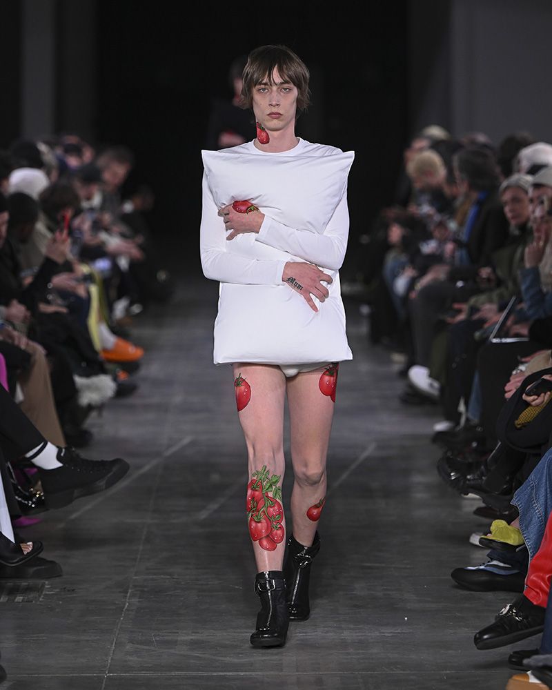 Rimanere a letto è davvero tornato di moda: solo pochi giorni dopo, Prada ha presentato la sua nuova collezione, la prima da quando il direttore creativo Raf Simons ha chiuso il suo marchio omonimo, anch'essa caratterizzata dal tema del comfort e dei cuscini. Il look 15, un gigantesco maglione a sbuffo, ricordava la giacca Loewe diventata virale sui social media, e quello che lo seguiva, una camicia a cuscino simile alla creazione JW Anderson, presentata solo pochi giorni prima a Milano. Raf e Miuccia hanno voluto creare capi di abbigliamento che descrivessero la realtà attuale, ma che allo stesso tempo la superassero, di conseguenza creando capi maschili dal taglio morbido e quasi confortevole. Ciò che lega le due collezioni non è solo il fatto che siano state presentate entrambe a Milano, ma anche il modo in cui ritraggono diverse versioni del bedcore all'interno della moda. Il look di JW Anderson potrebbe essere visto come una versione moderna del look di Viktor e Rolf, che glorificava l'aspetto dei capelli disordinati appena usciti dal letto - rifiutando gli eccessivi standard di bellezza e di genere, pur avendo un aspetto curato, mentre quello disegnato da Prada trasforma la camera da letto in qualcosa di indossabile, invece che in una semplice estetica. È diretto.