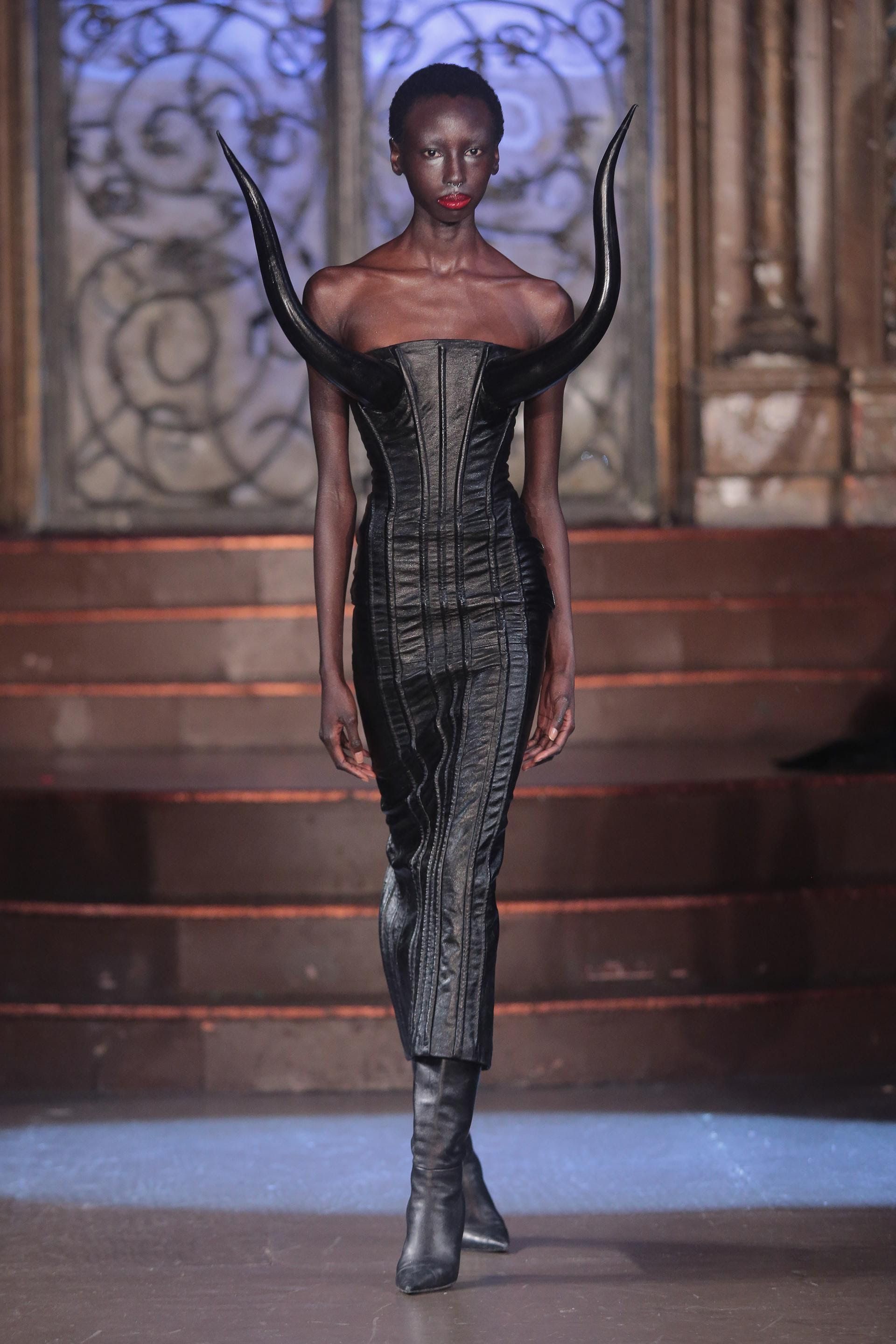 La New York Fashion Week appena conclusasi non ha avuto molti picchi d’interesse: collezioni piuttosto prevedibili si sono alternate con pochi momenti altamente instagrammabili, dai volti animaleschi di Collina Strada agli outfit camaleontici di Julia Fox. In effetti l’attrice e artista italo-americana ha di nuovo catalizzato l’attenzione pubblica, ma soprattutto, ha di nuovo sfilato in un abito in denim i cui seni ricordavano lunghe corna demoniache dello stilista spagnolo Luis De Javier durante lo show presentato da YouPorn. Una collezione ispirata dall’unione tra queerness, moda e clubbing, nonchè un nuovo tassello dell’universo sensuale di De Javier fatto di creature dalle spalle a punta e tanta pelle scoperta.